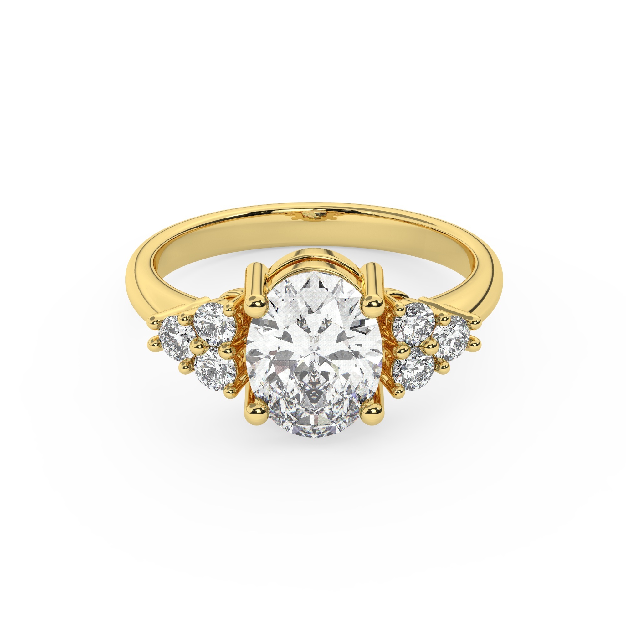 טבעת אירוסין סוליטר ומוסונייט בצדדים דגם 50041 זהב צהוב 14 קראט במרכז אבן מעבדה מוסונייט 2.50 קראט בחיתוך אובל עם תעודה גמולוגית בינלאומית GRA מסביב ובצדדים אבני מעבדה מוסונייט במשקל כולל של 0.30 קראט בחיתוך עגול