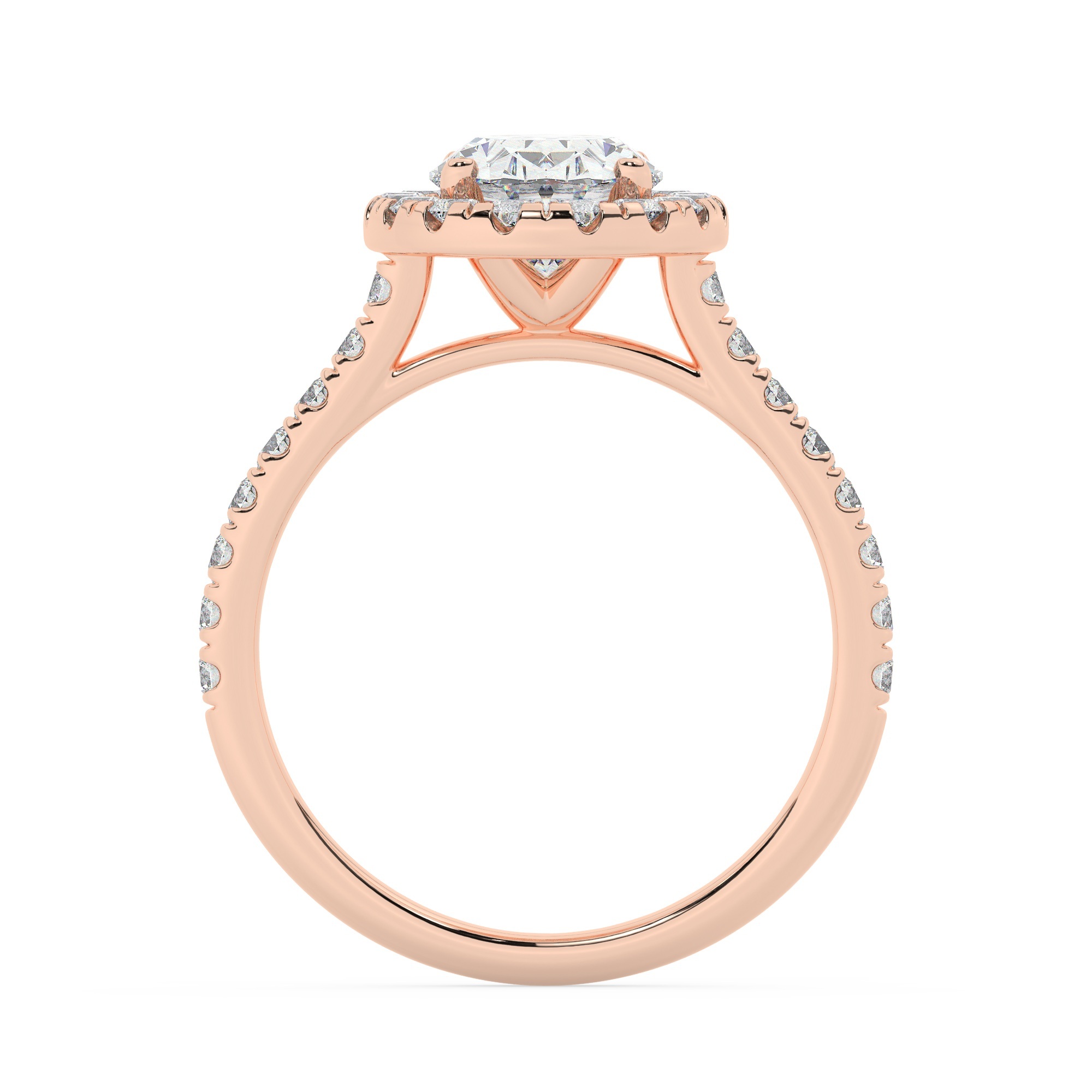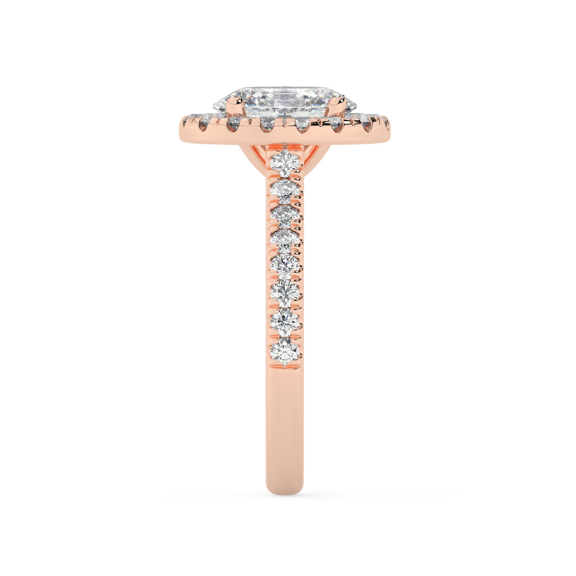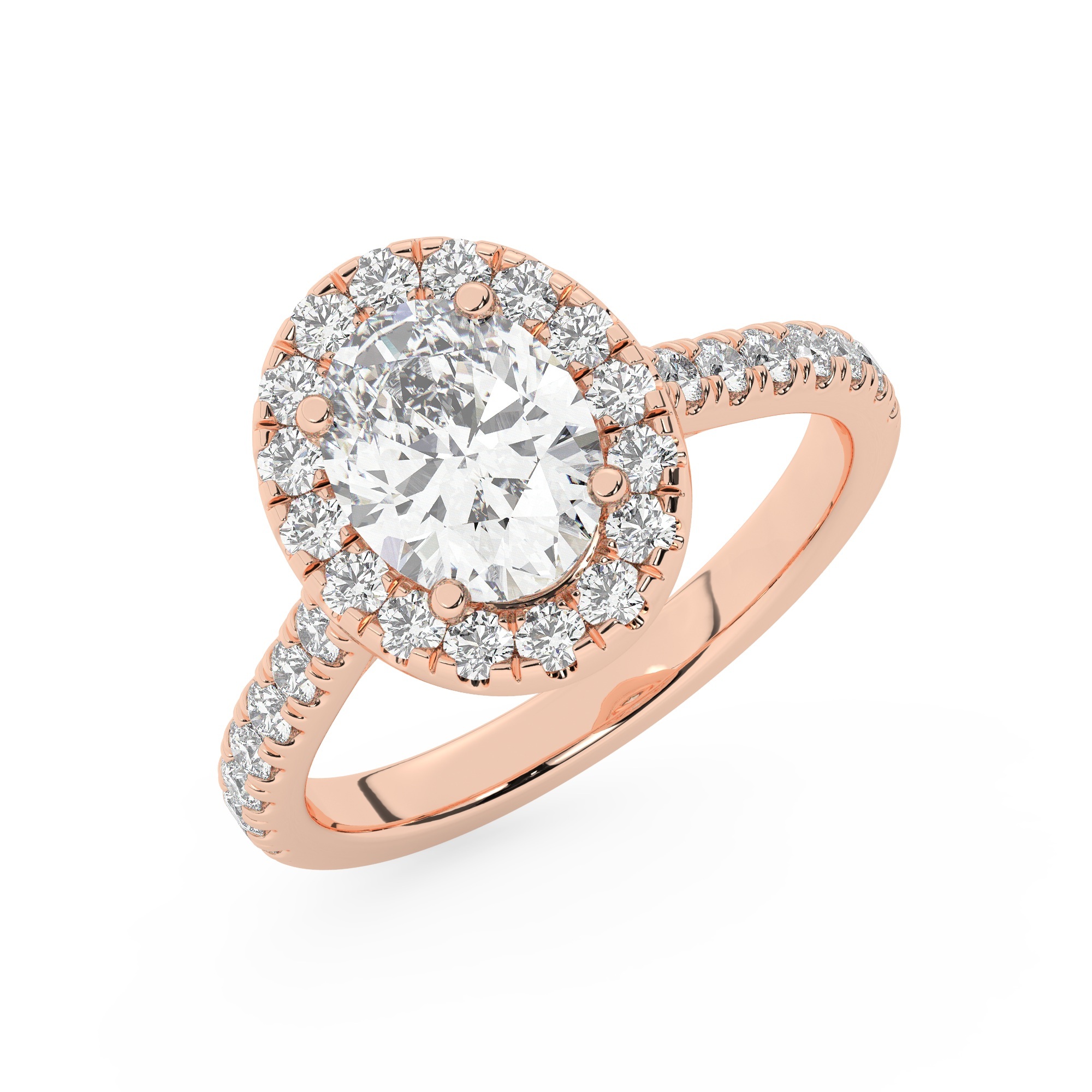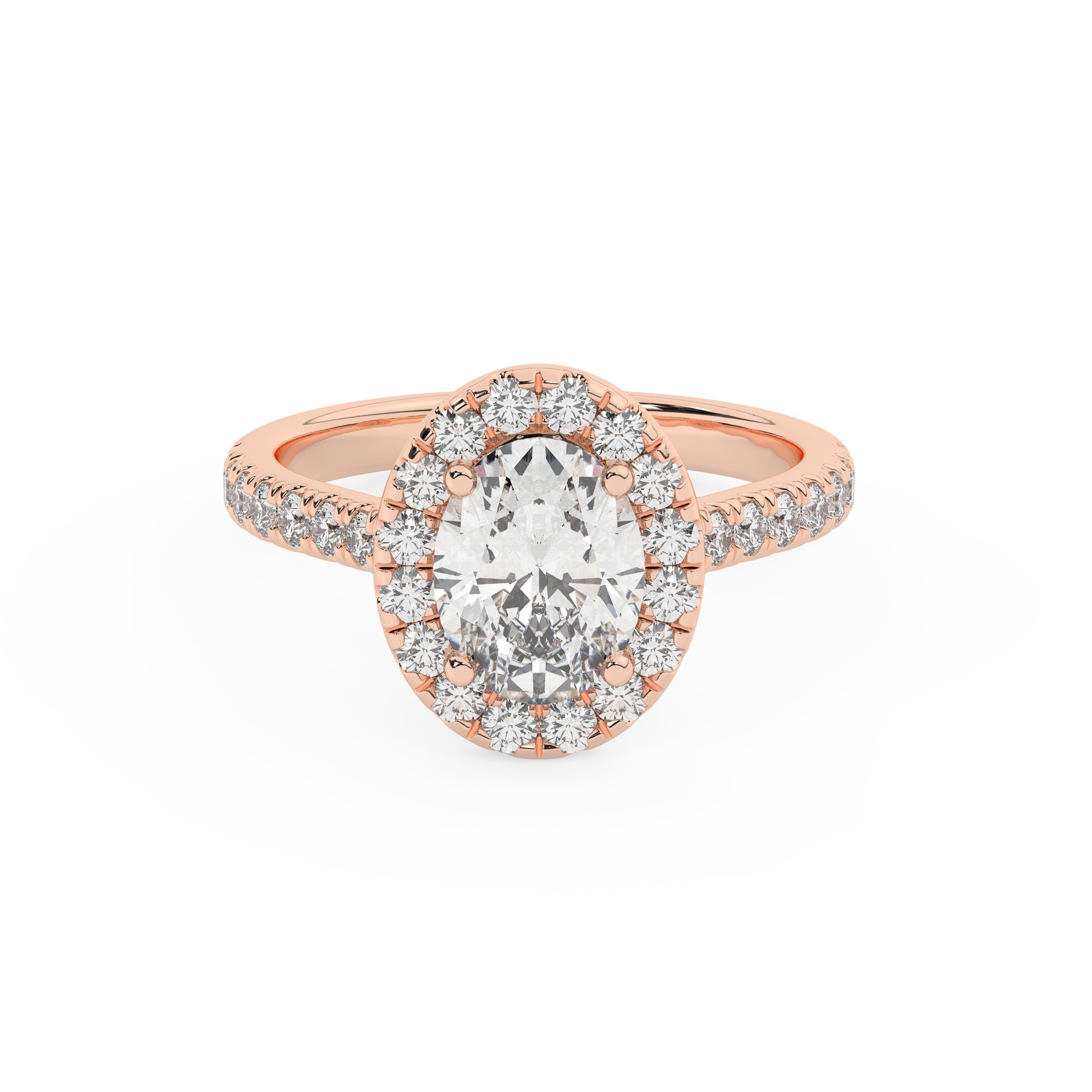 טבעת אירוסין היילו דגם 50026 כסף מצופה זהב אדום רוזגולד במרכז אבן מעבדה מוסונייט 2.50 קראט בחיתוך אובל עם תעודה גמולוגית בינלאומית GRA מסביב ובצדדים אבני מעבדה מוסונייט במשקל כולל של 0.68 קראט בחיתוך עגול