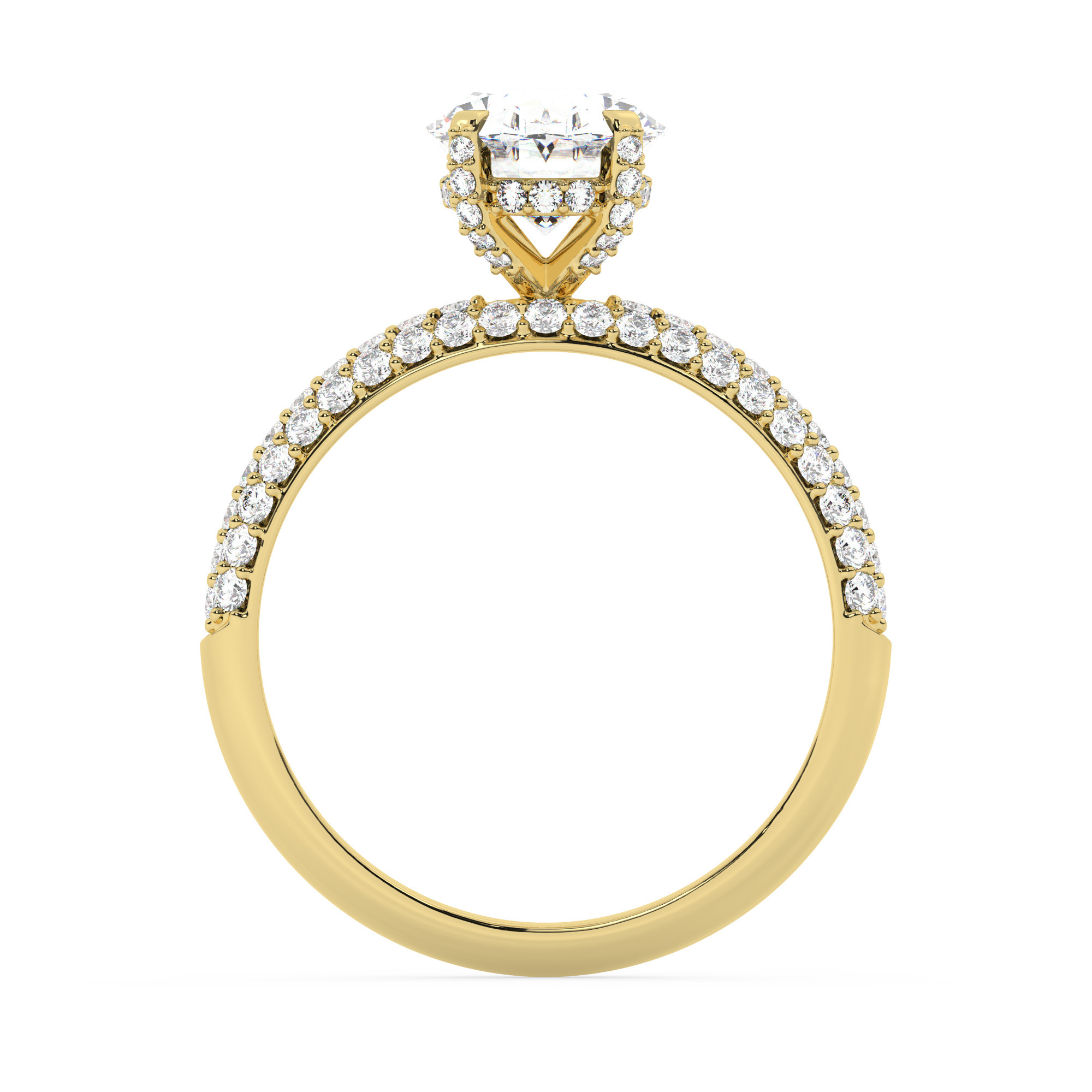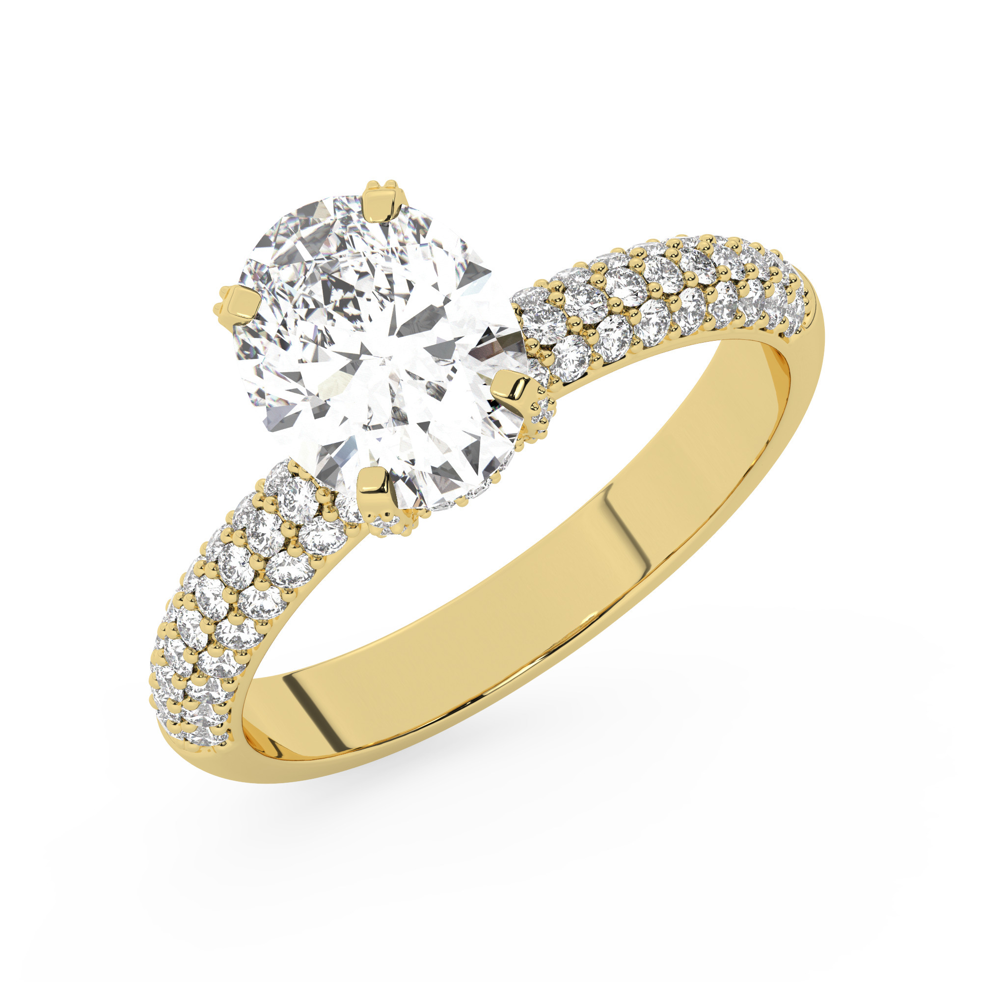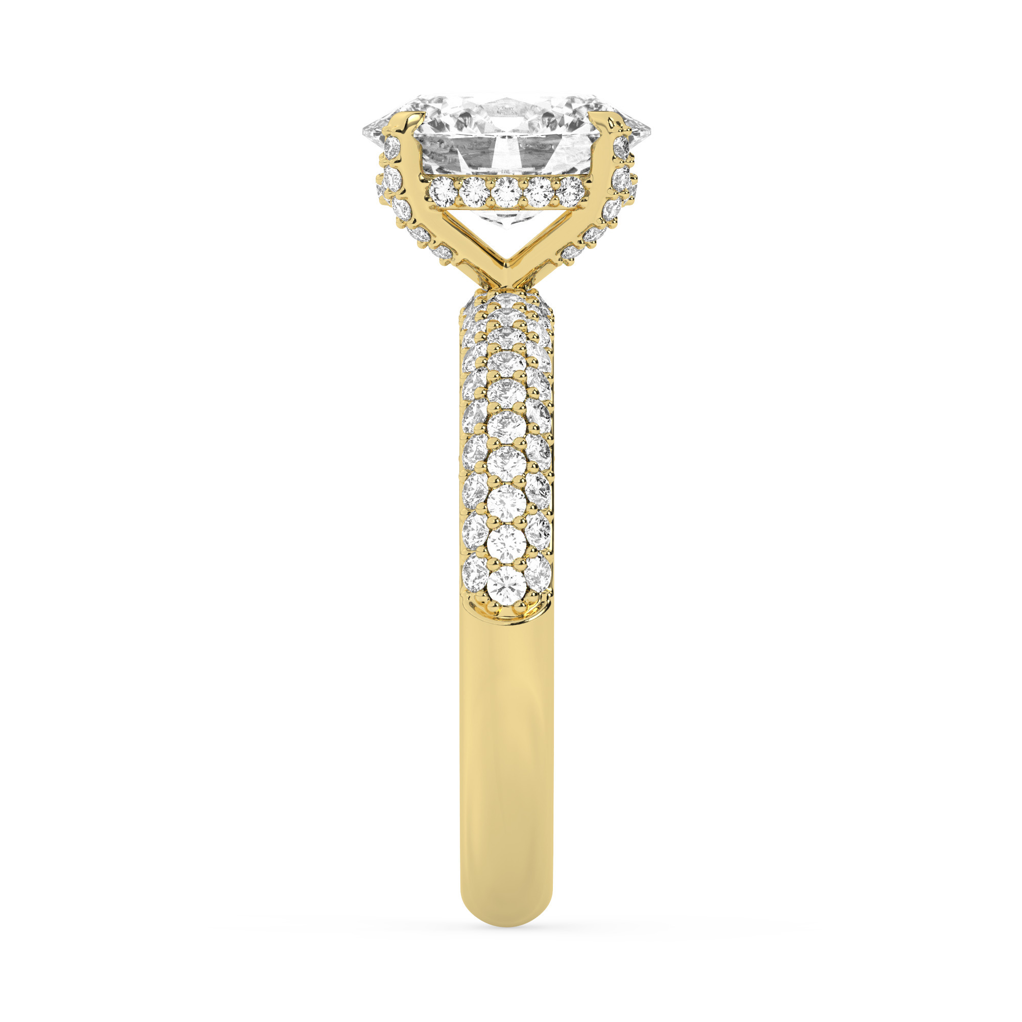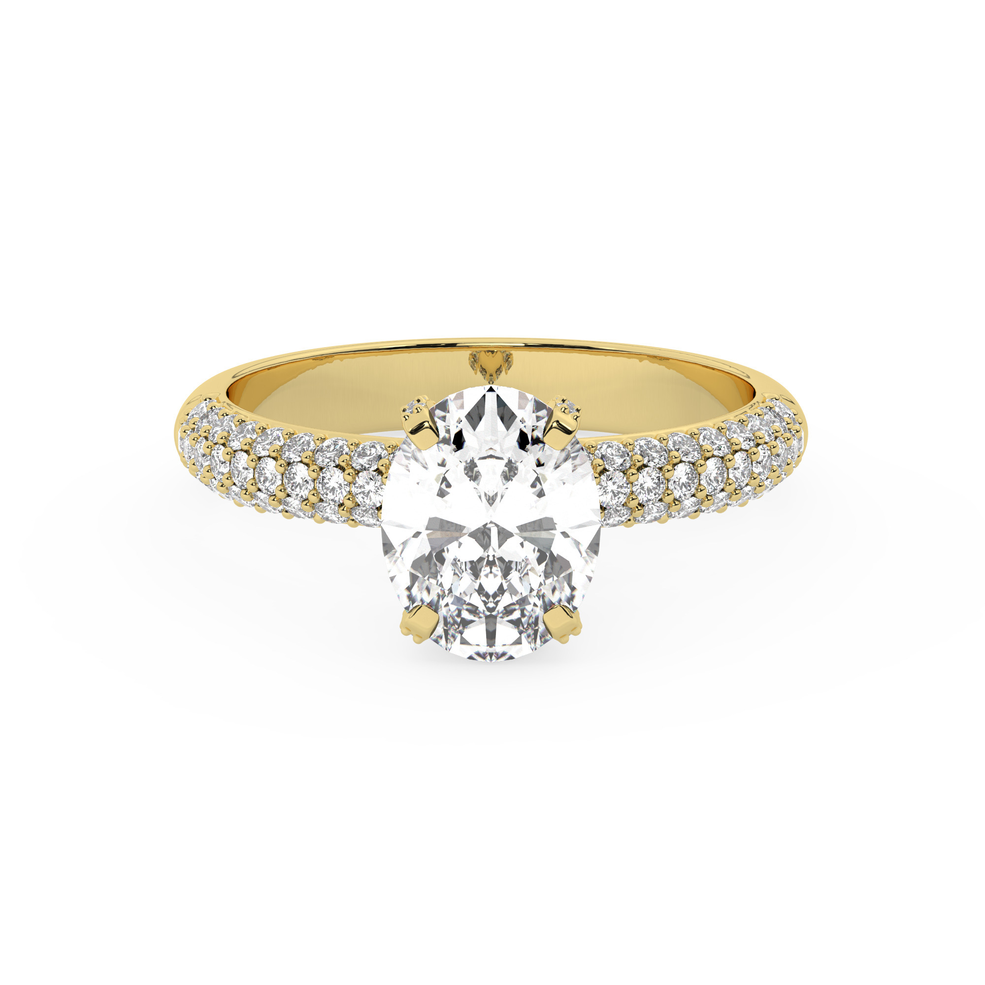 טבעת אירוסין יוקרתית בסגנון סוליטר עם יהלומים בצדדים, עשויה מכסף מצופה זהב צהוב. הטבעת מעוטרת באבן מרכזית מרשימה ממשפחת המוסונייט במשקל 2.50 קראט, בצורת אובל וזוהר מושלם בצבע D וניקיון VVS1, וכוללת 101 אבנים במשקל כולל של 3 קראט.