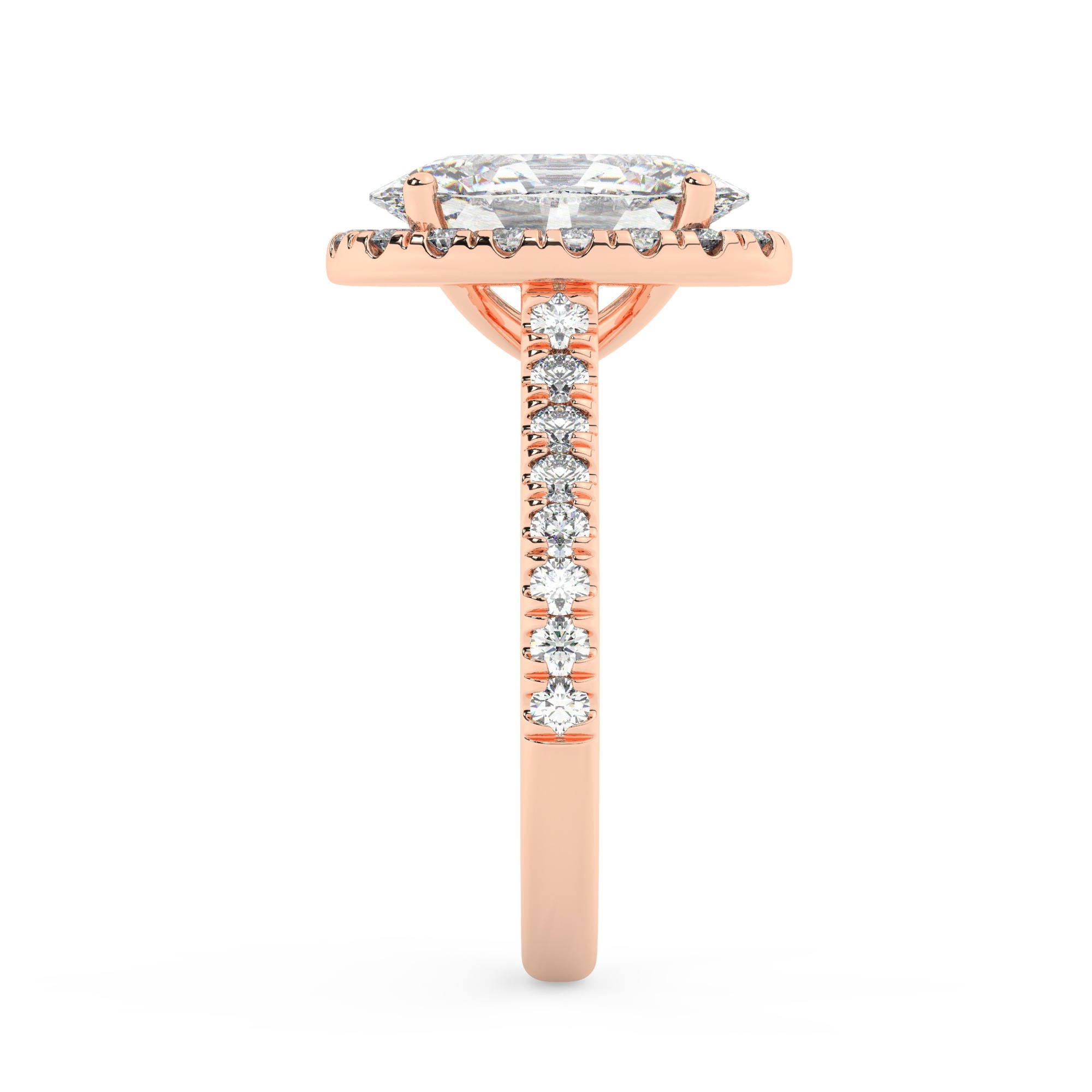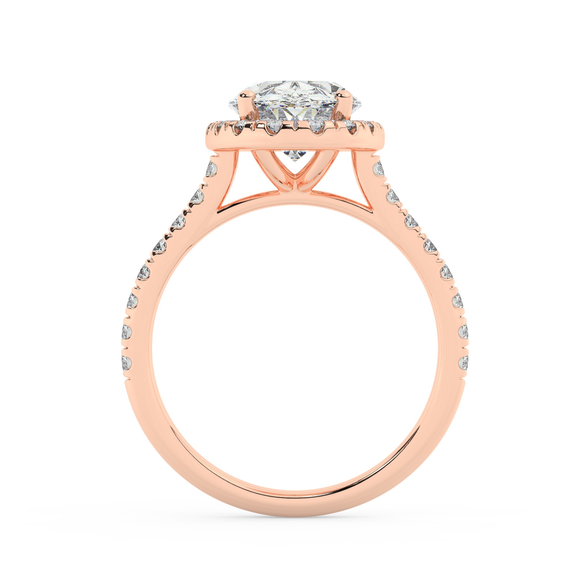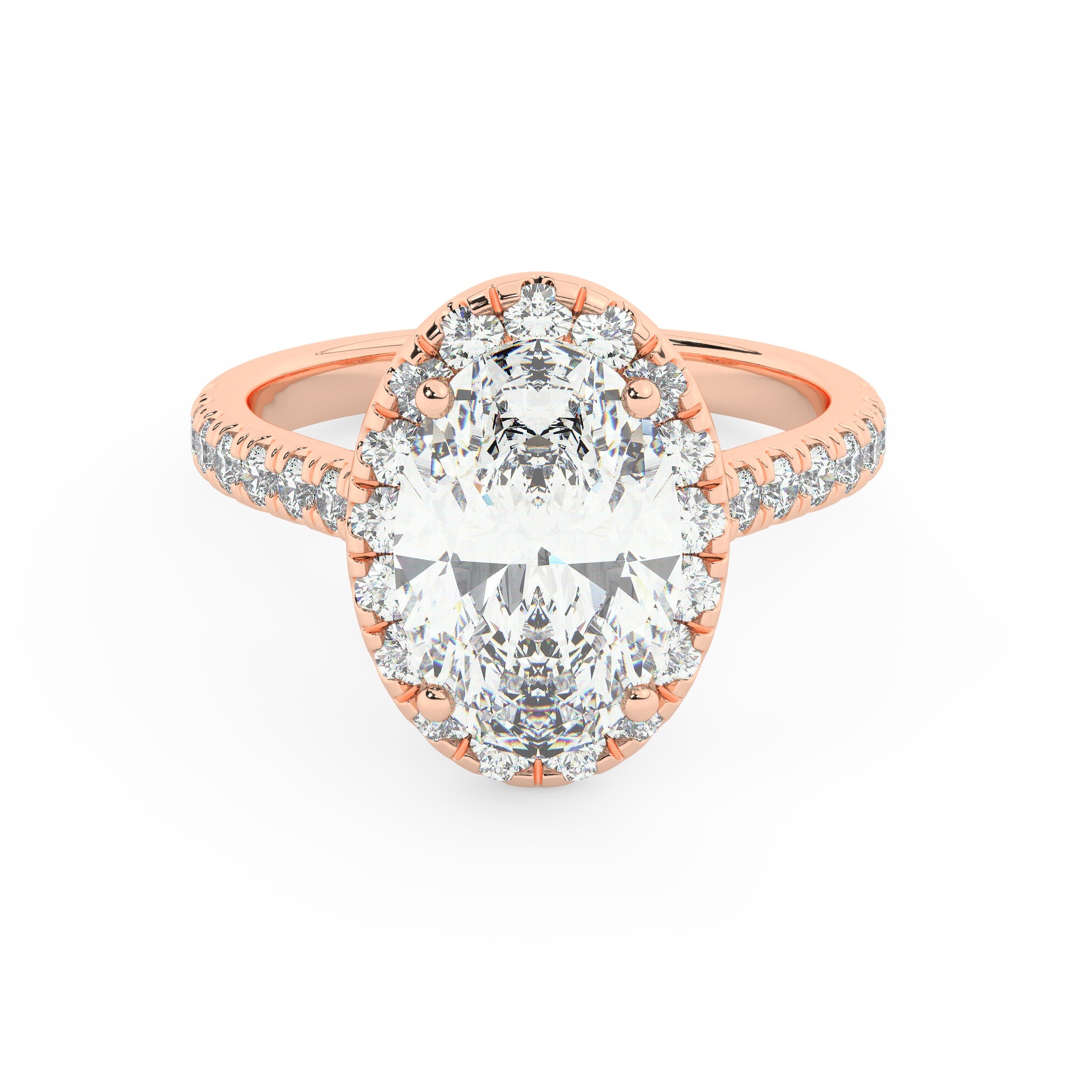 טבעת אירוסין היילו דגם 50026 כסף מצופה זהב אדום רוזגולד במרכז אבן מעבדה מוסונייט 3 קראט בחיתוך אובל עם תעודה גמולוגית בינלאומית GRA מסביב ובצדדים אבני מעבדה מוסונייט במשקל כולל של 0.72 קראט בחיתוך עגול