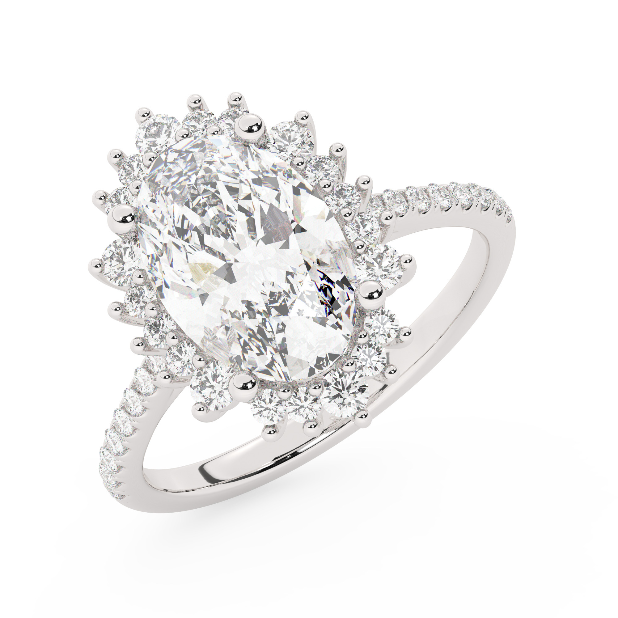 טבעת אירוסין היילו דגם 50024 כסף מצופה זהב לבן במרכז אבן מעבדה מוסונייט 3 קראט בחיתוך אובל עם תעודה גמולוגית בינלאומית GRA מסביב ובצדדים אבני מעבדה מוסונייט במשקל כולל של 0.39 קראט בחיתוך עגול