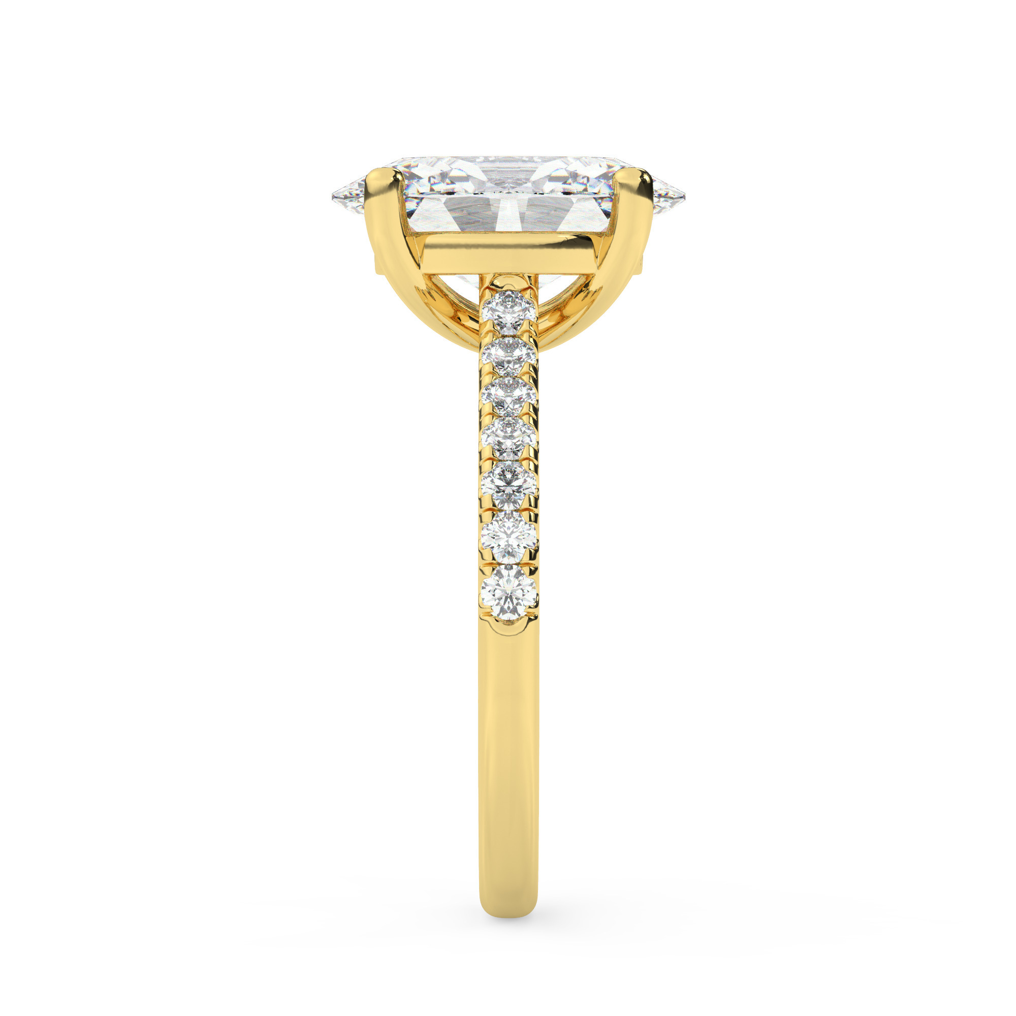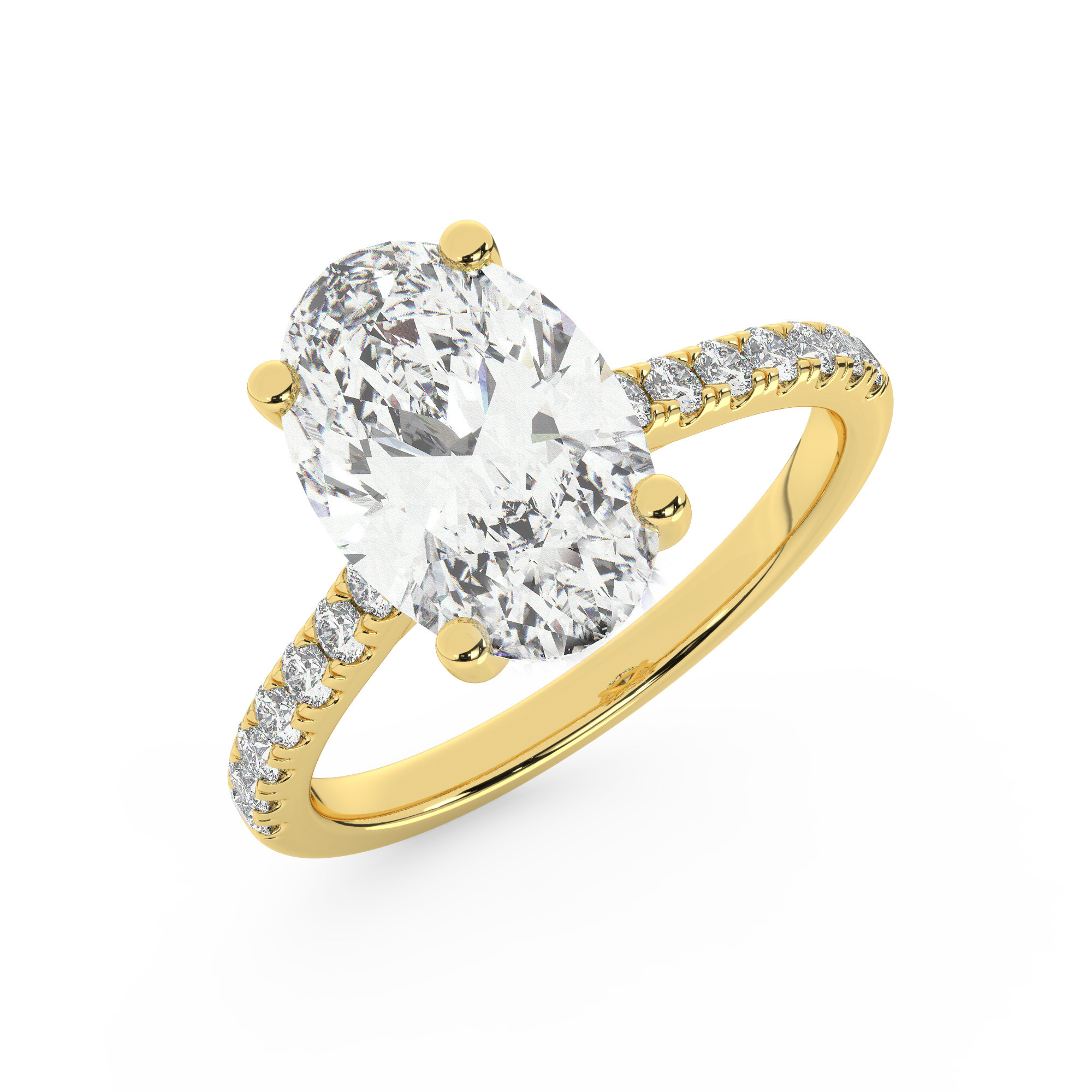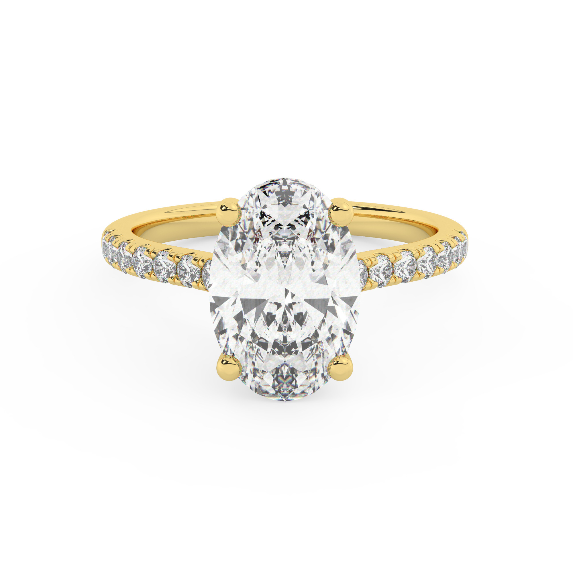 טבעת אירוסין סוליטר ויהלומים בצדדים דגם 50019 כסף מצופה זהב צהוב במרכז אבן מעבדה מוסונייט 4 קראט בחיתוך אובל עם תעודה גמולוגית בינלאומית GRA מסביב ובצדדים אבני מעבדה מוסונייט במשקל כולל של 0.28 קראט בחיתוך עגול