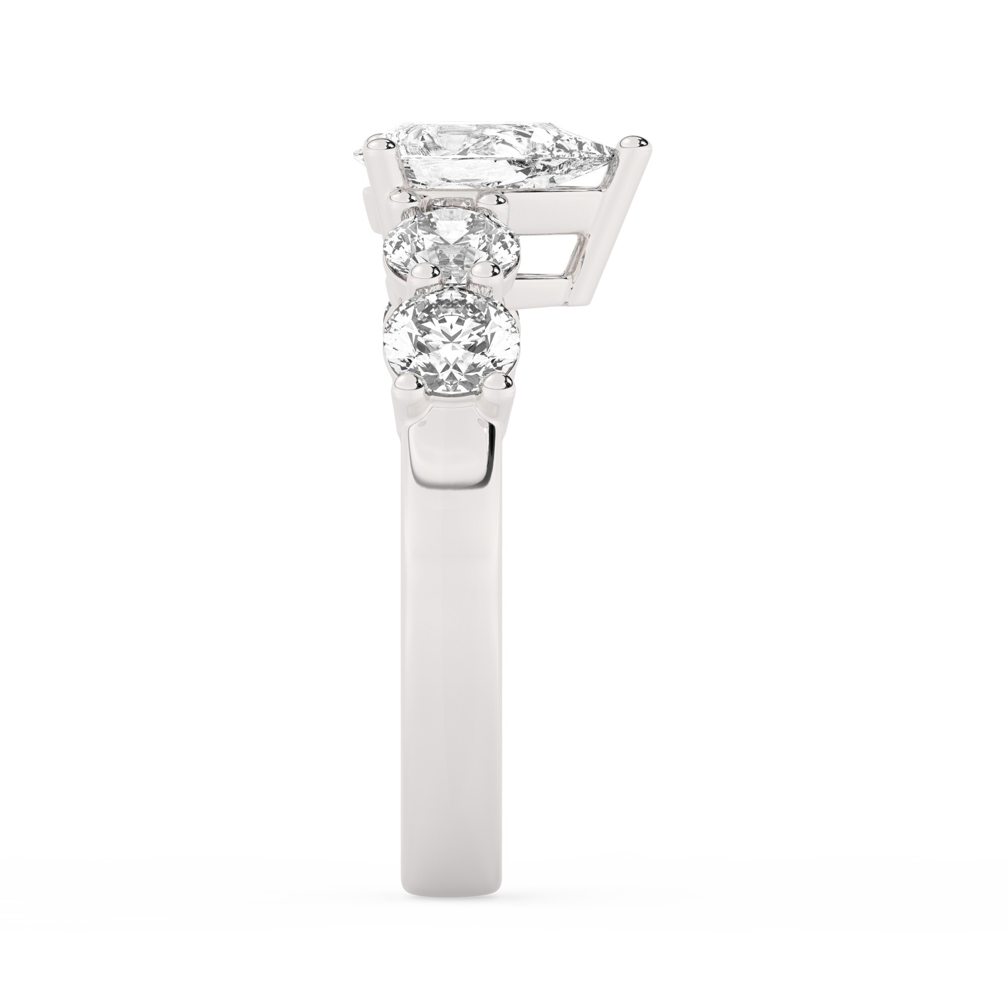 טבעת אירוסין סוליטר ומוסונייט בצדדים דגם 50030 זהב לבן 14 קראט במרכז אבן מעבדה מוסונייט 1 קראט בחיתוך טיפה עם תעודה גמולוגית בינלאומית GRA מסביב ובצדדים אבני מעבדה מוסונייט במשקל כולל של 1.08 קראט בחיתוך עגול