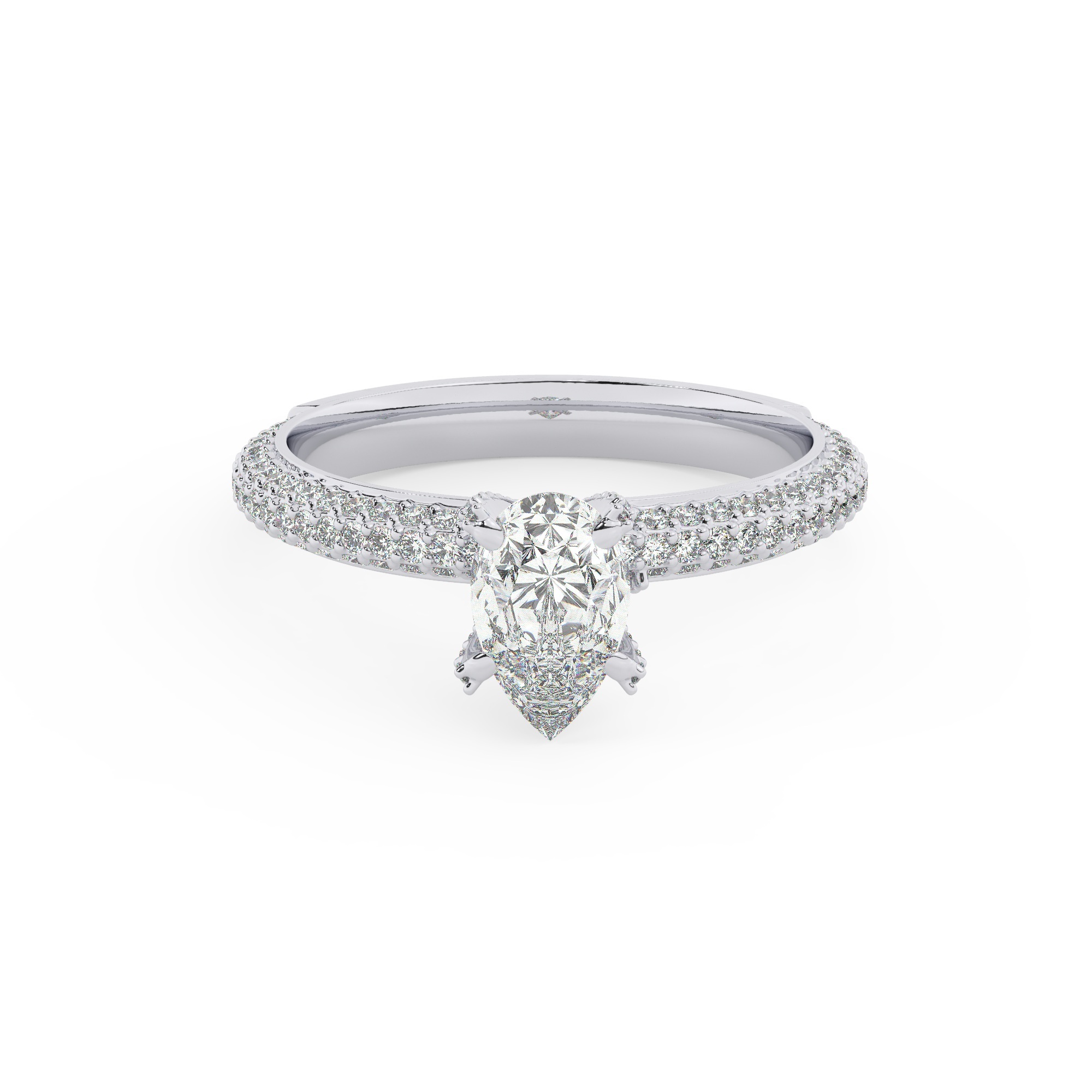 טבעת אירוסין סוליטר מרהיבה בסגנון קלאסי עם נגיעות עוצמתיות – עשויה מכסף מצופה זהב לבן ומשובצת ב-117 אבני מוסונייט מנצנצות במשקל כולל של 1.40 קראט, כולל אבן מרכזית בגזרת טיפה של 1 קראט, בדרגת ניקיון VVS1 וגוון D מושלם.