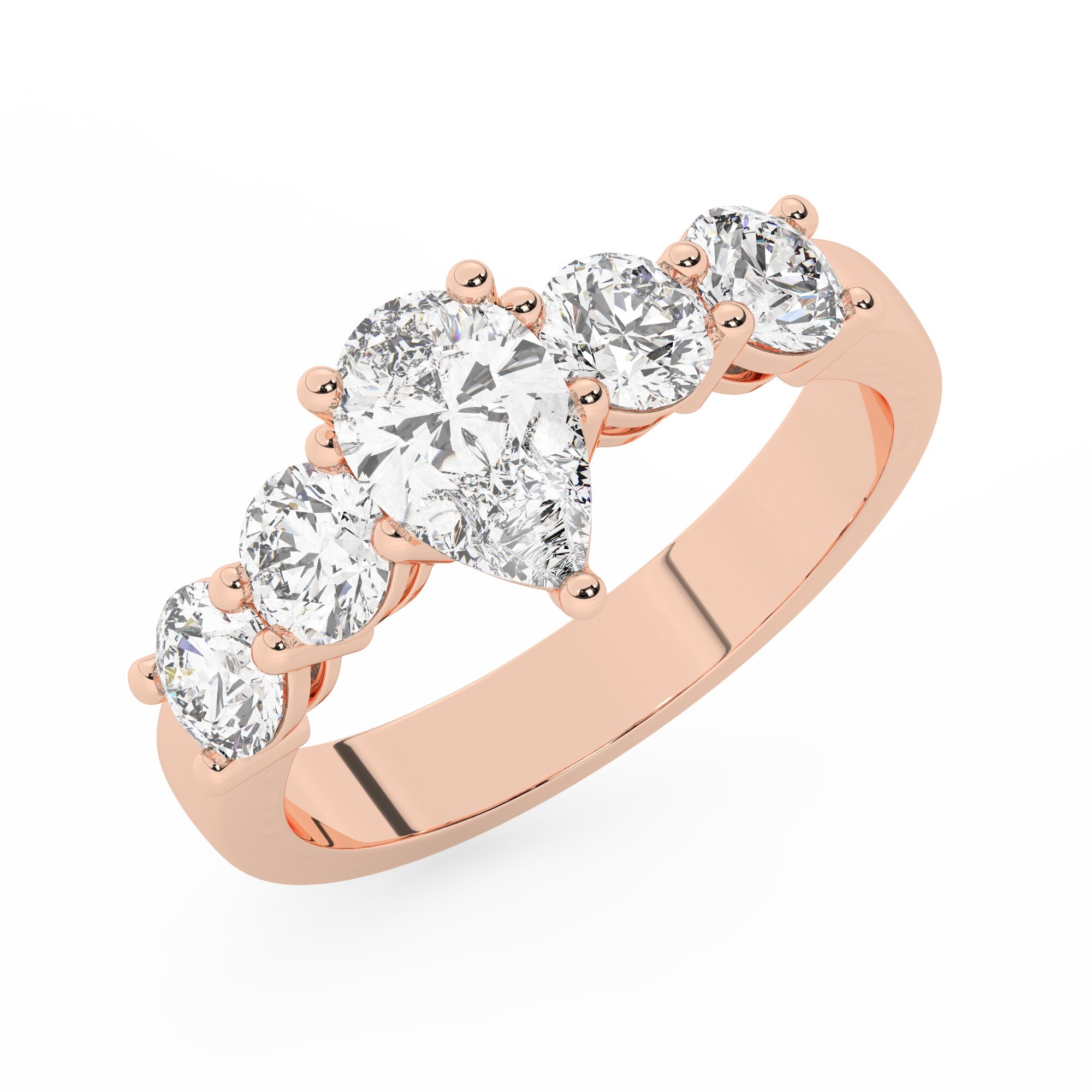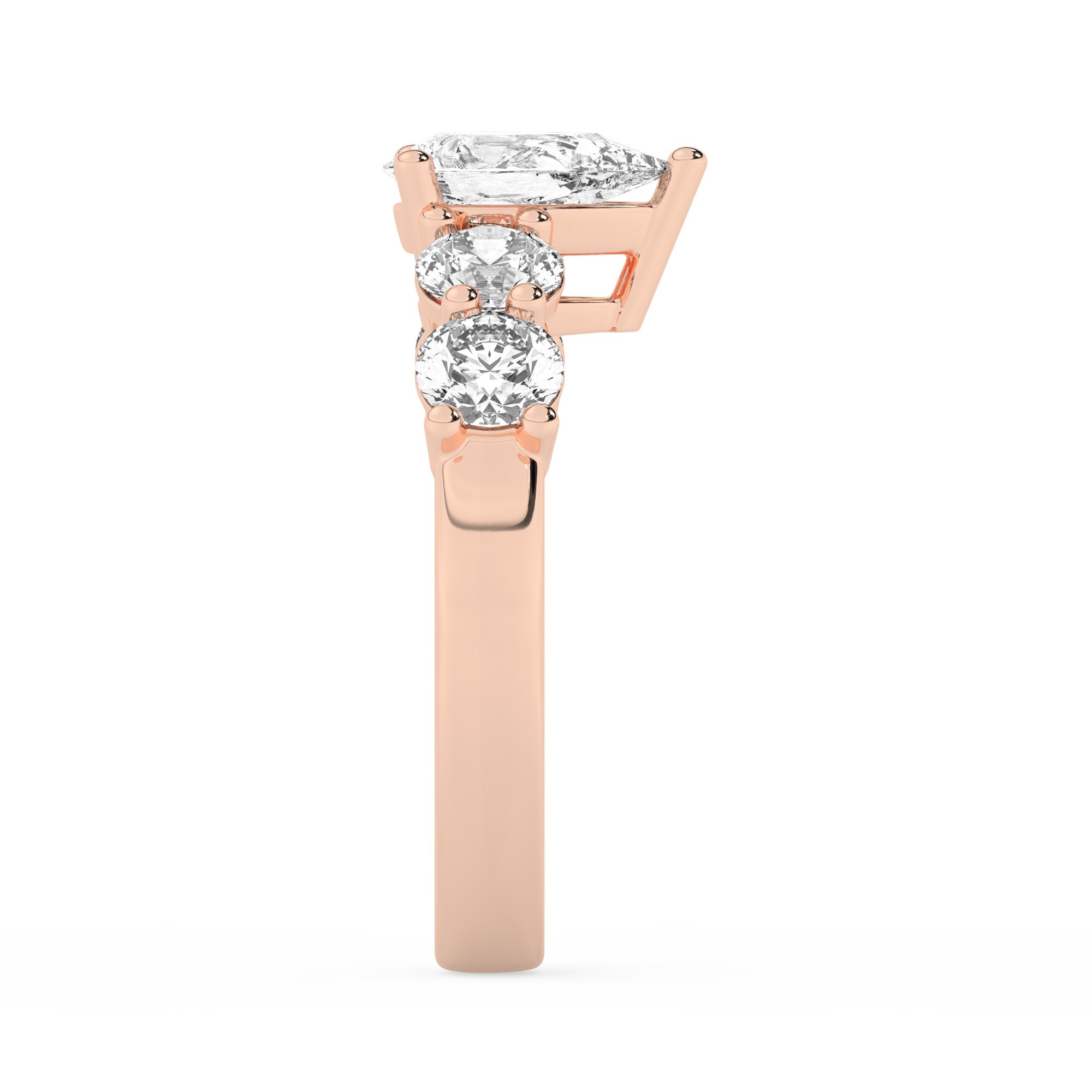 טבעת אירוסין סוליטר ומוסונייט בצדדים דגם 50030 כסף מצופה זהב אדום רוזגולד במרכז אבן מעבדה מוסונייט 1.50 קראט בחיתוך טיפה עם תעודה גמולוגית בינלאומית GRA מסביב ובצדדים אבני מעבדה מוסונייט במשקל כולל של 1.08 קראט בחיתוך עגול