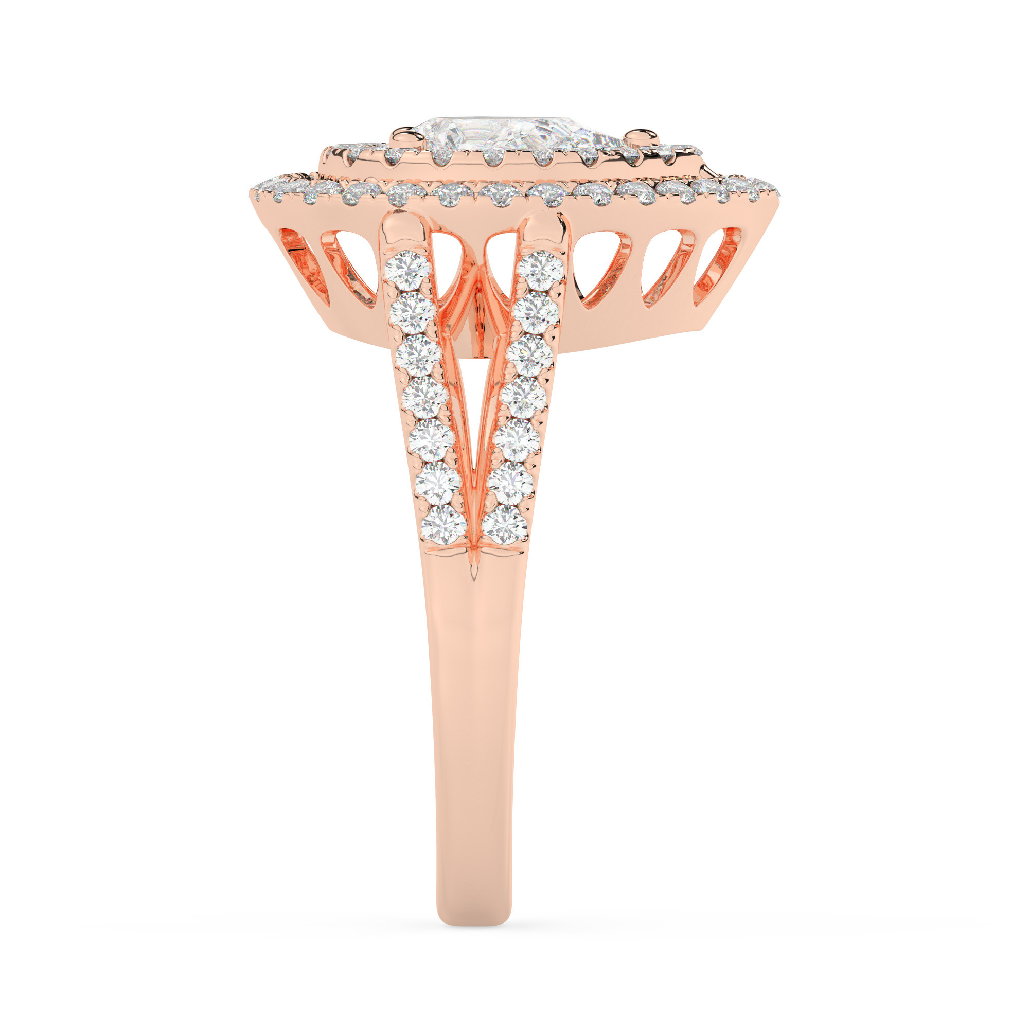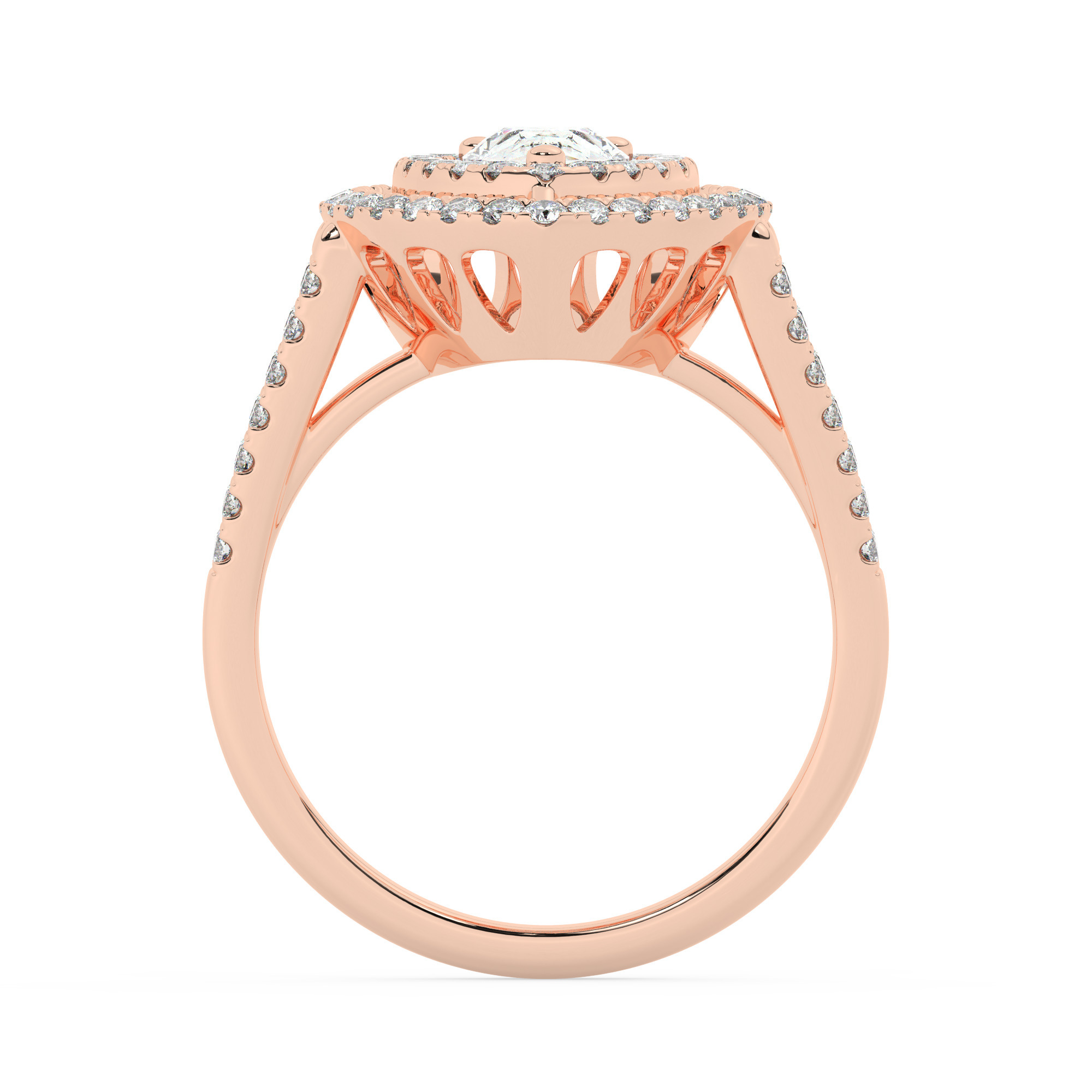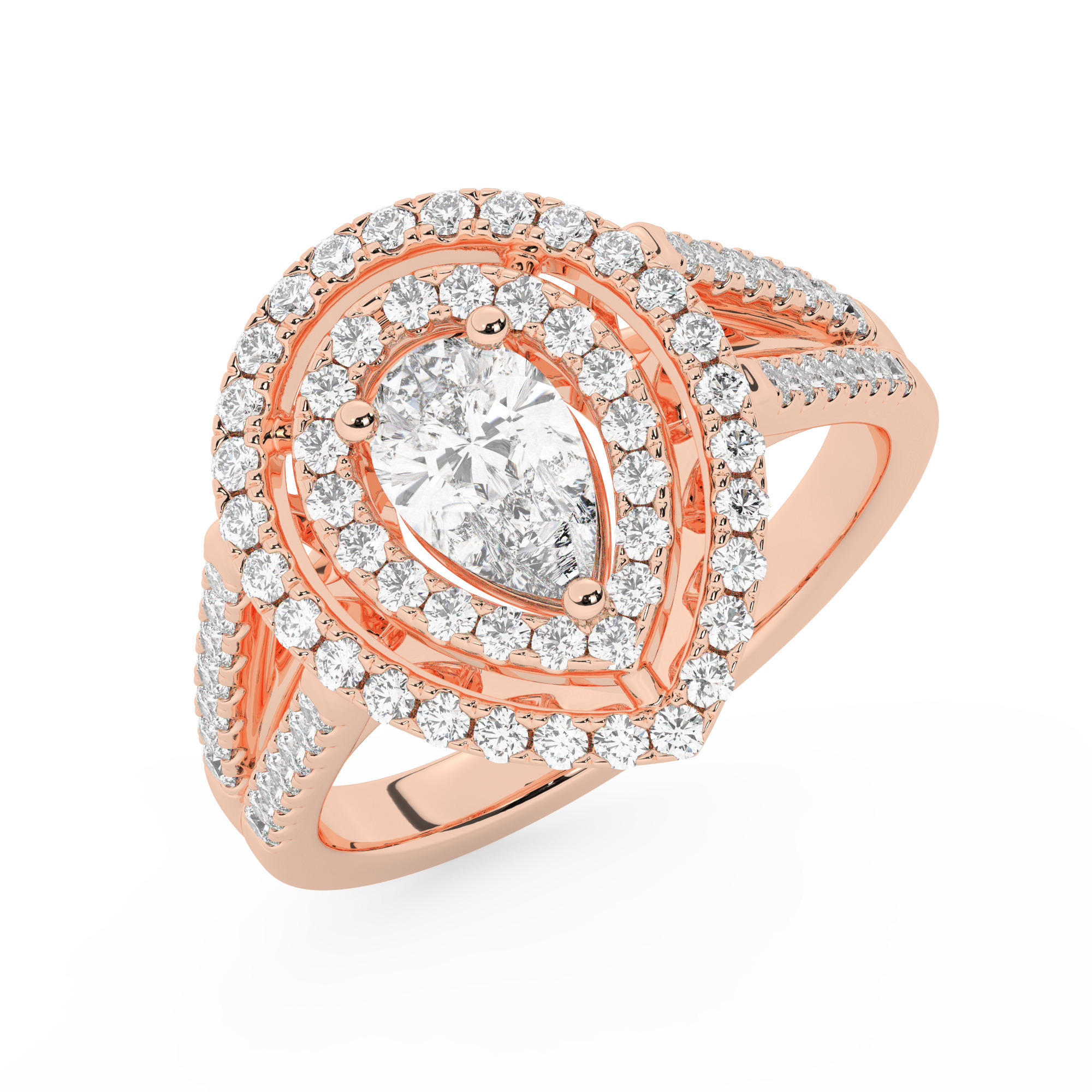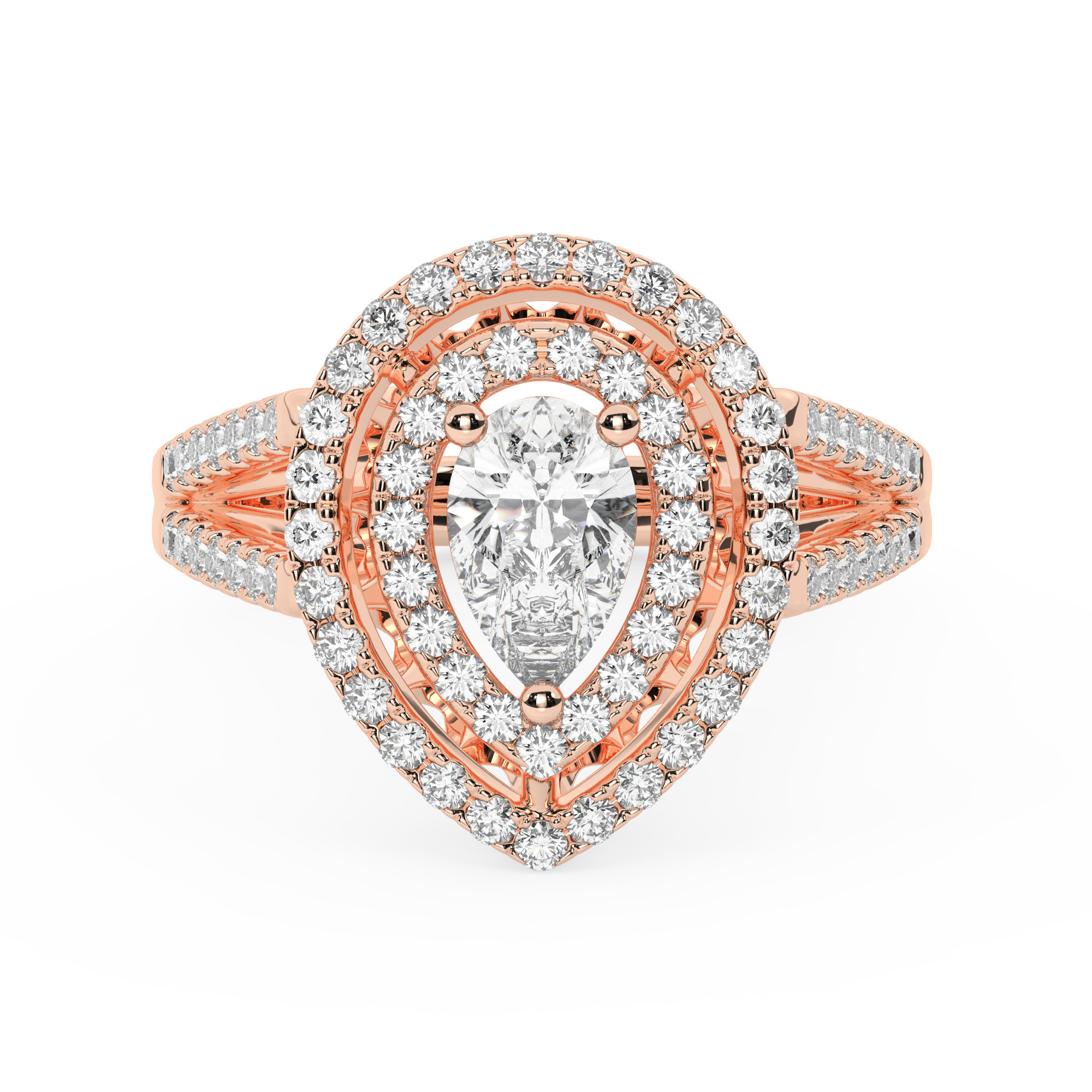 טבעת אירוסין היילו דגם 50025 כסף מצופה זהב אדום רוזגולד במרכז אבן מעבדה מוסונייט 2 קראט בחיתוך טיפה עם תעודה גמולוגית בינלאומית GRA מסביב ובצדדים אבני מעבדה מוסונייט במשקל כולל של 0.62 קראט בחיתוך עגול