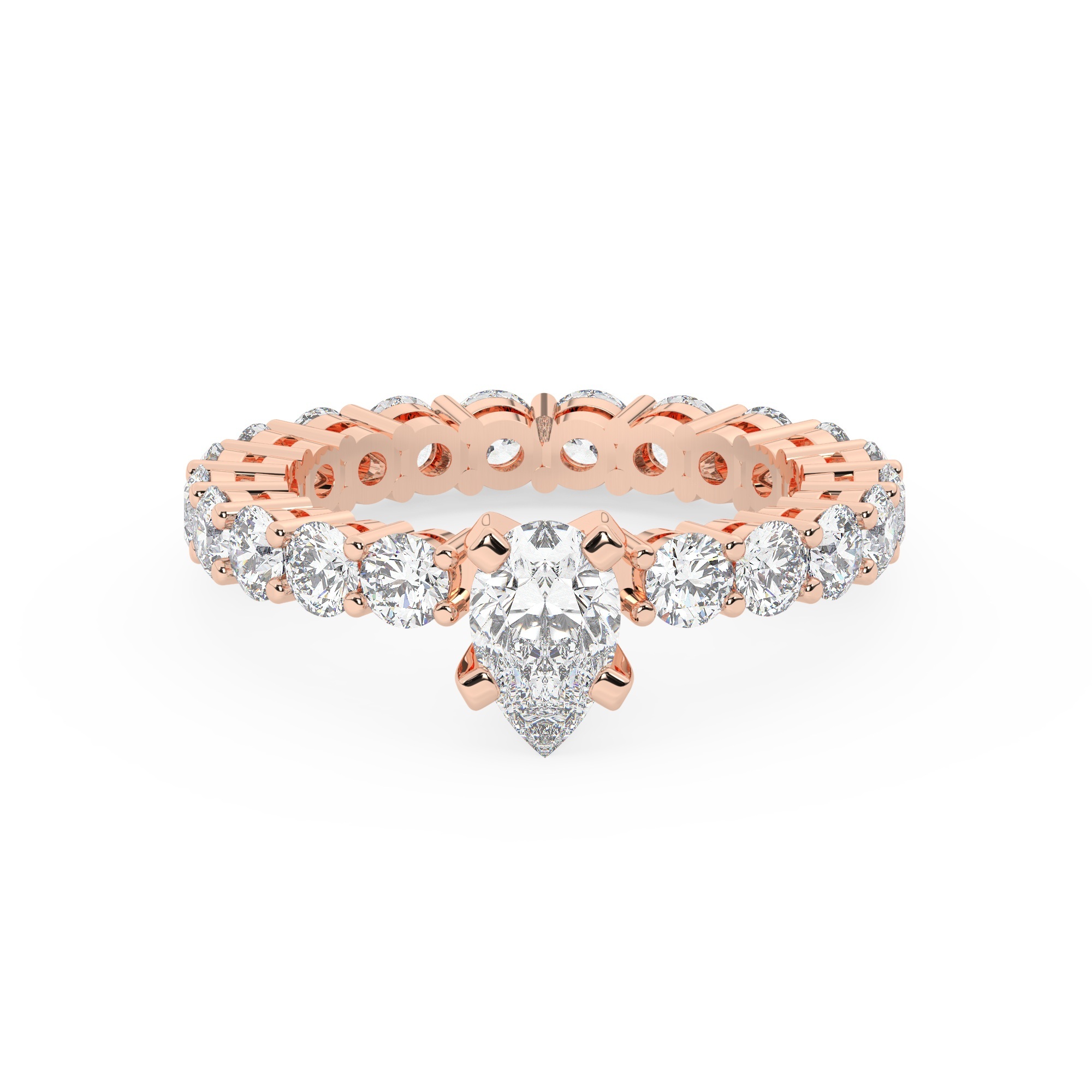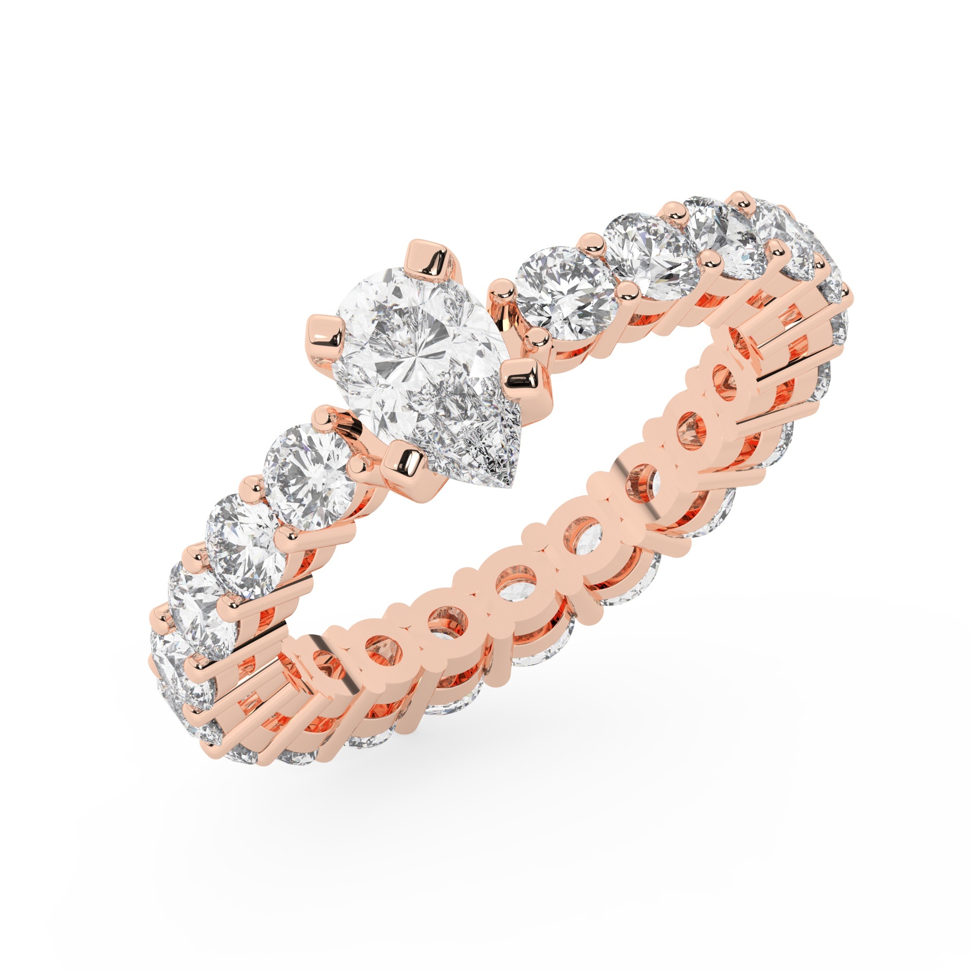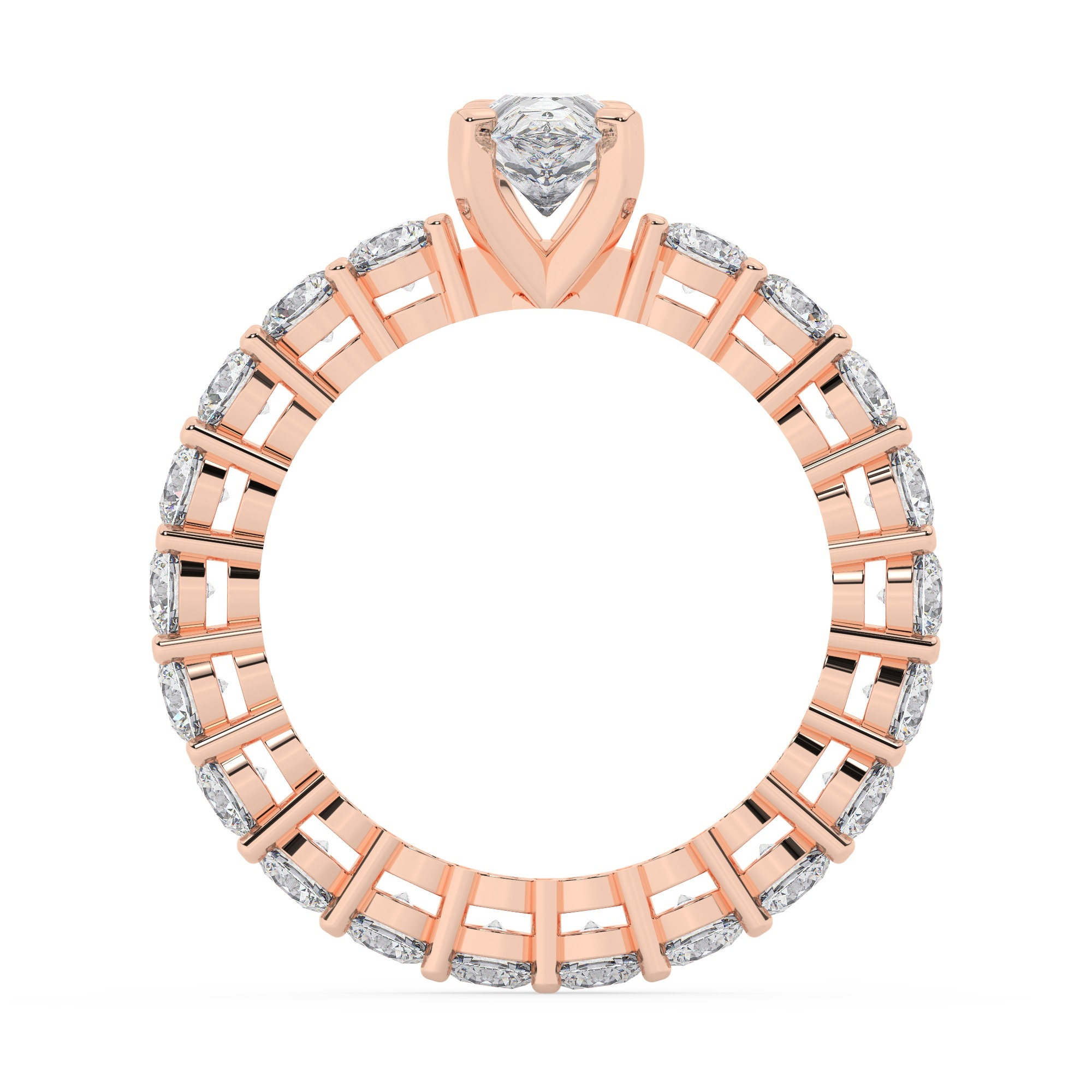 טבעת אירוסין סוליטר ומוסונייט בצדדים איטרנטיני דגם 50044 כסף מצופה זהב אדום רוזגולד במרכז אבן מעבדה מוסונייט 2 קראט בחיתוך טיפה עם תעודה גמולוגית בינלאומית GRA מסביב ובצדדים אבני מעבדה מוסונייט במשקל כולל של 1.80 קראט בחיתוך עגול