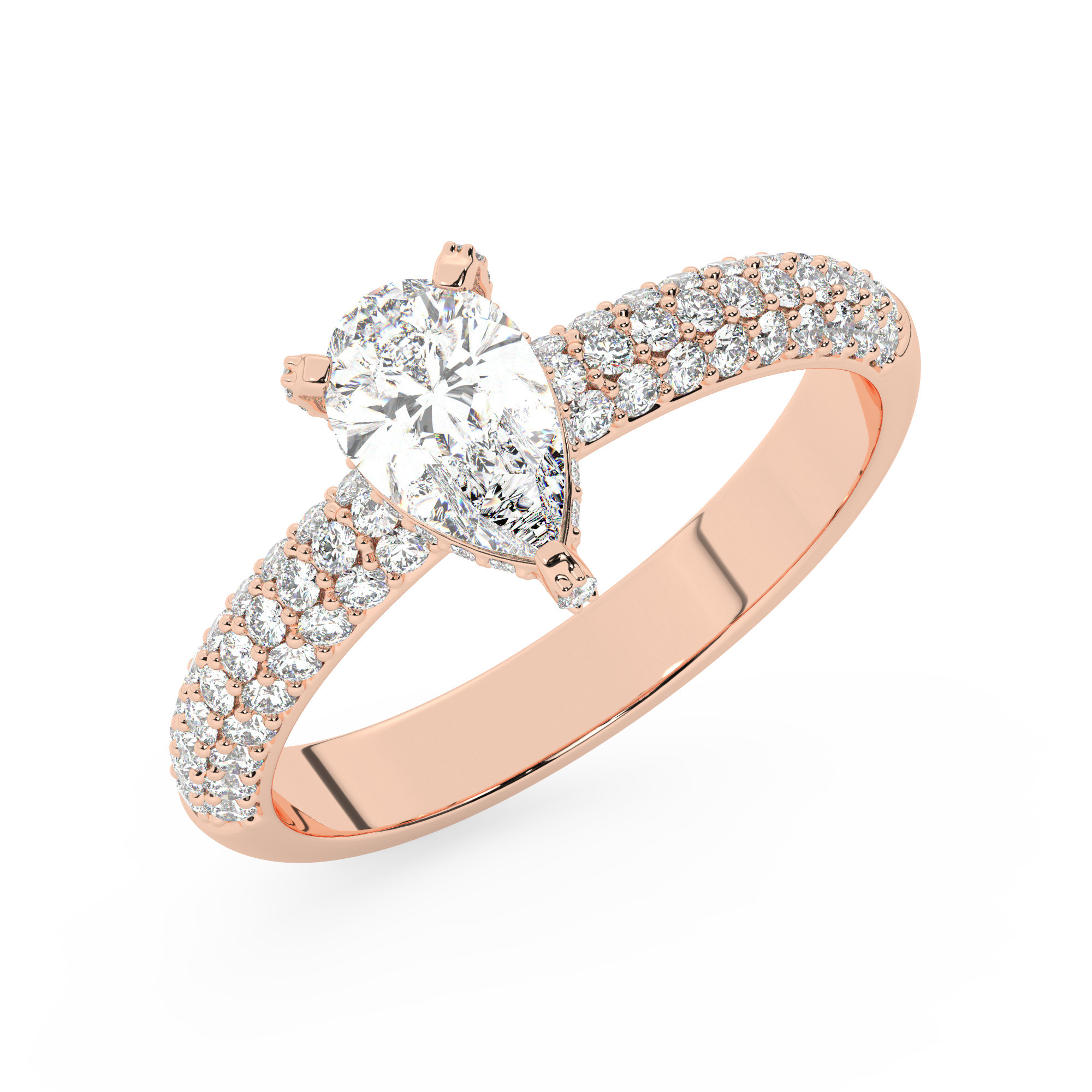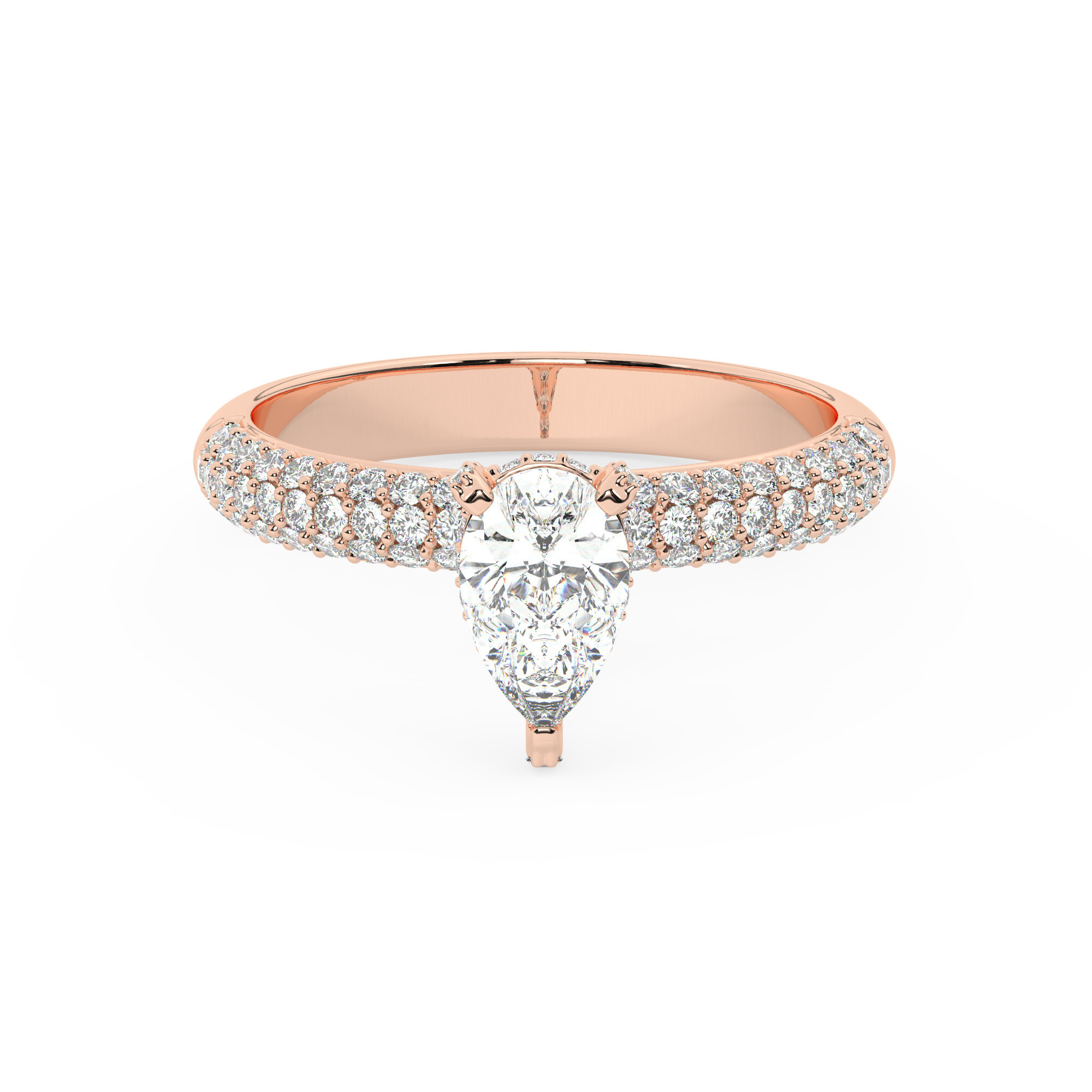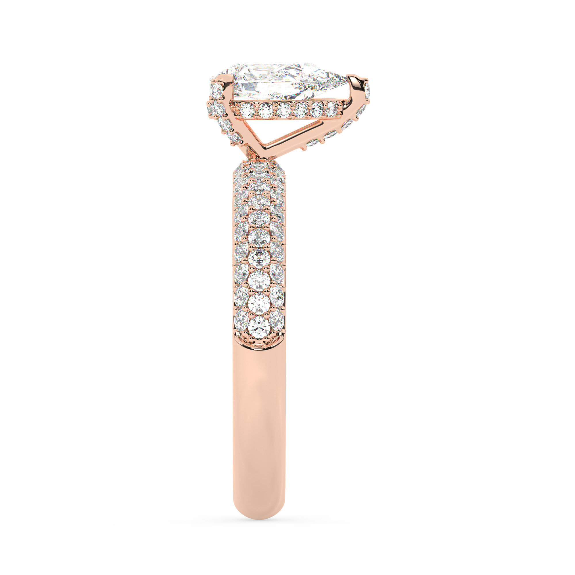 טבעת אירוסין סוליטר יוקרתית בציפוי זהב אדום (רוזגולד), משובצת אבן מוסונייט מרהיבה בצורת טיפה במשקל 2.50 קראט ועוד 100 יהלומים קטנים בצדדים במשקל כולל של 3 קראט. תעודה בינלאומית GRA כלולה.