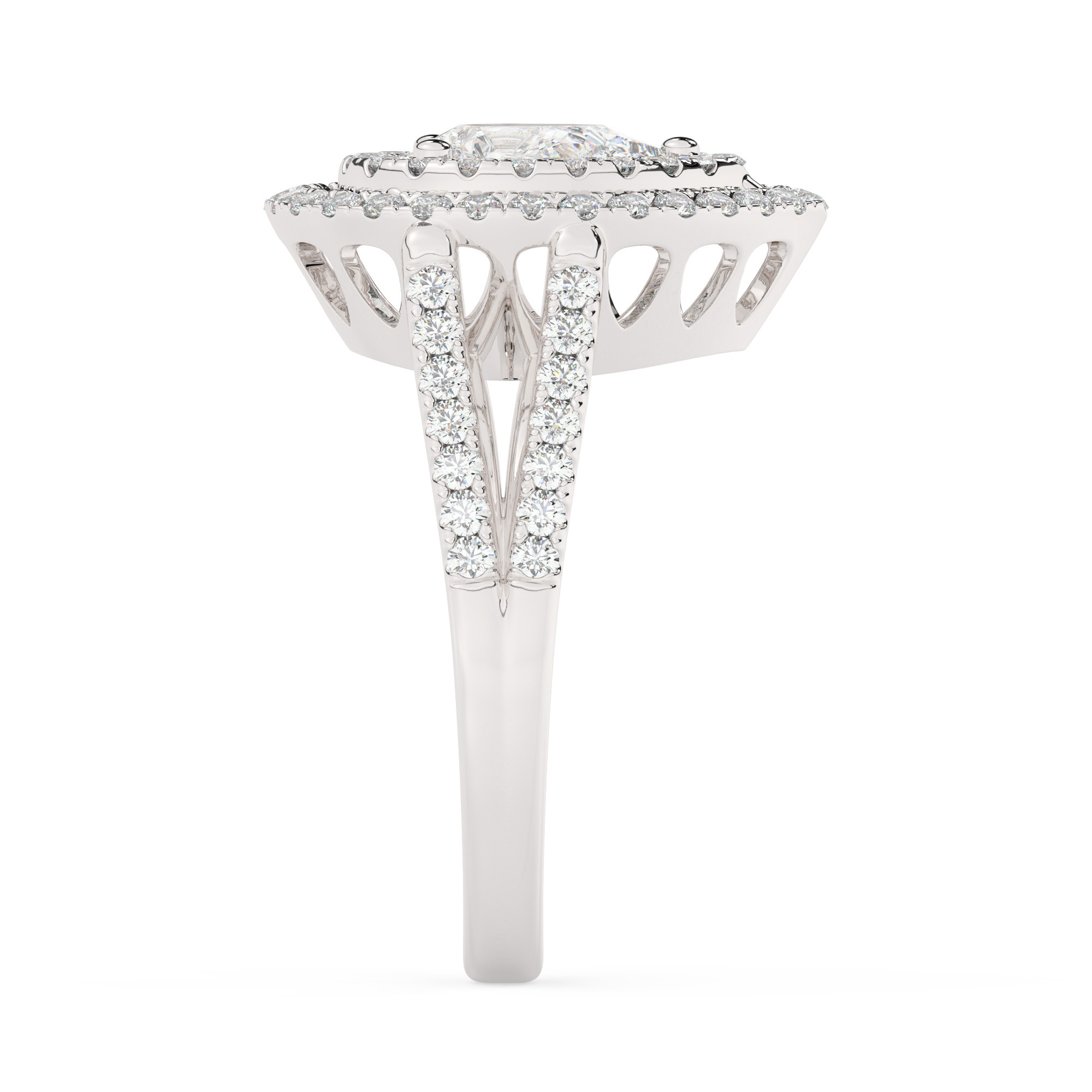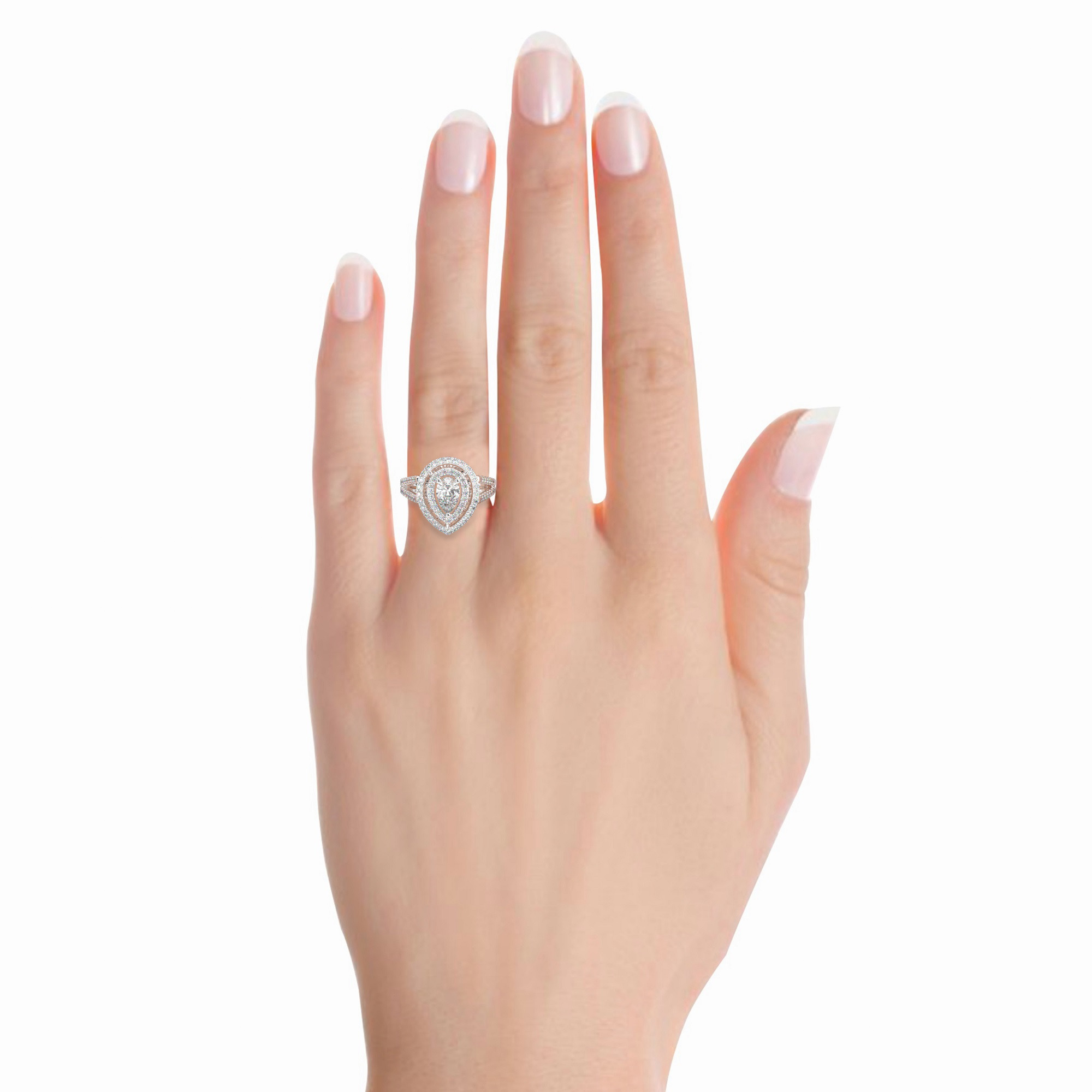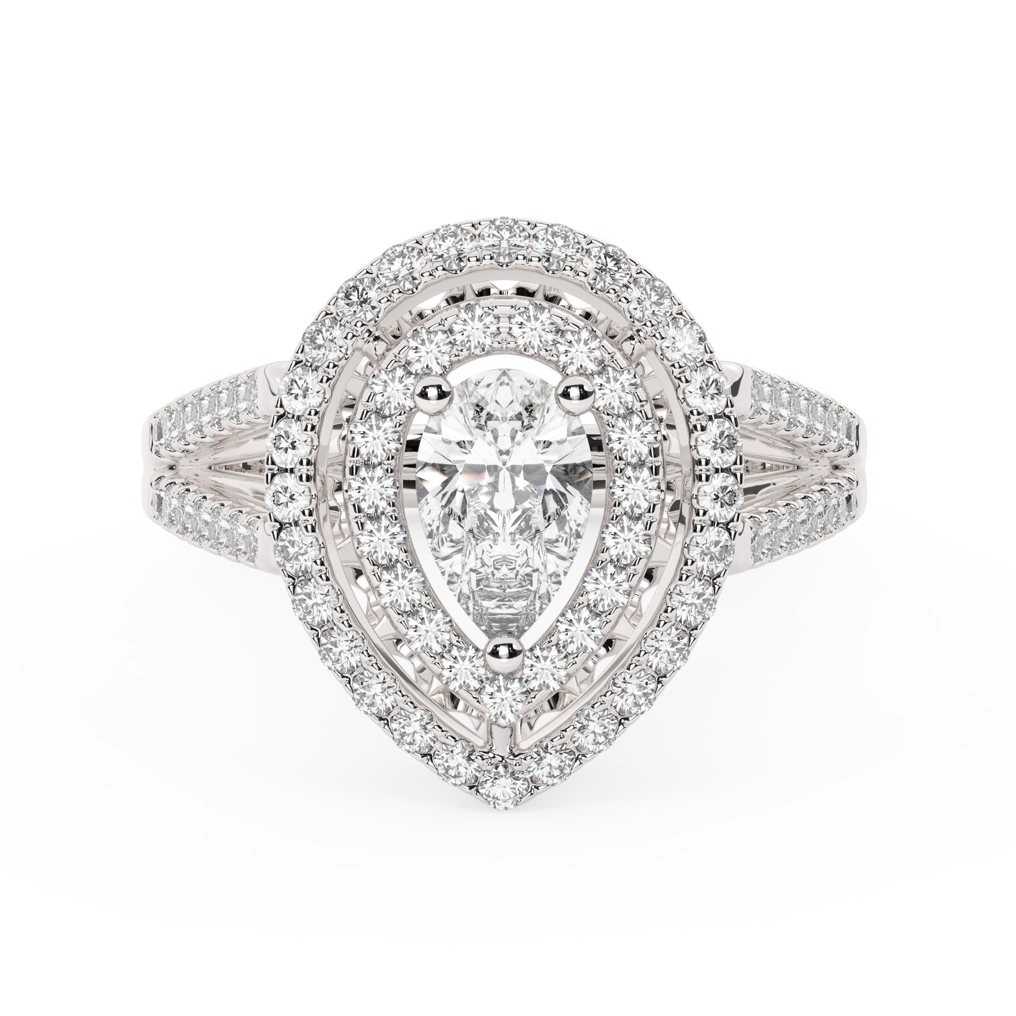 טבעת אירוסין היילו דגם 50025 כסף מצופה זהב לבן במרכז אבן מעבדה מוסונייט 3 קראט בחיתוך טיפה עם תעודה גמולוגית בינלאומית GRA מסביב ובצדדים אבני מעבדה מוסונייט במשקל כולל של 0.62 קראט בחיתוך עגול