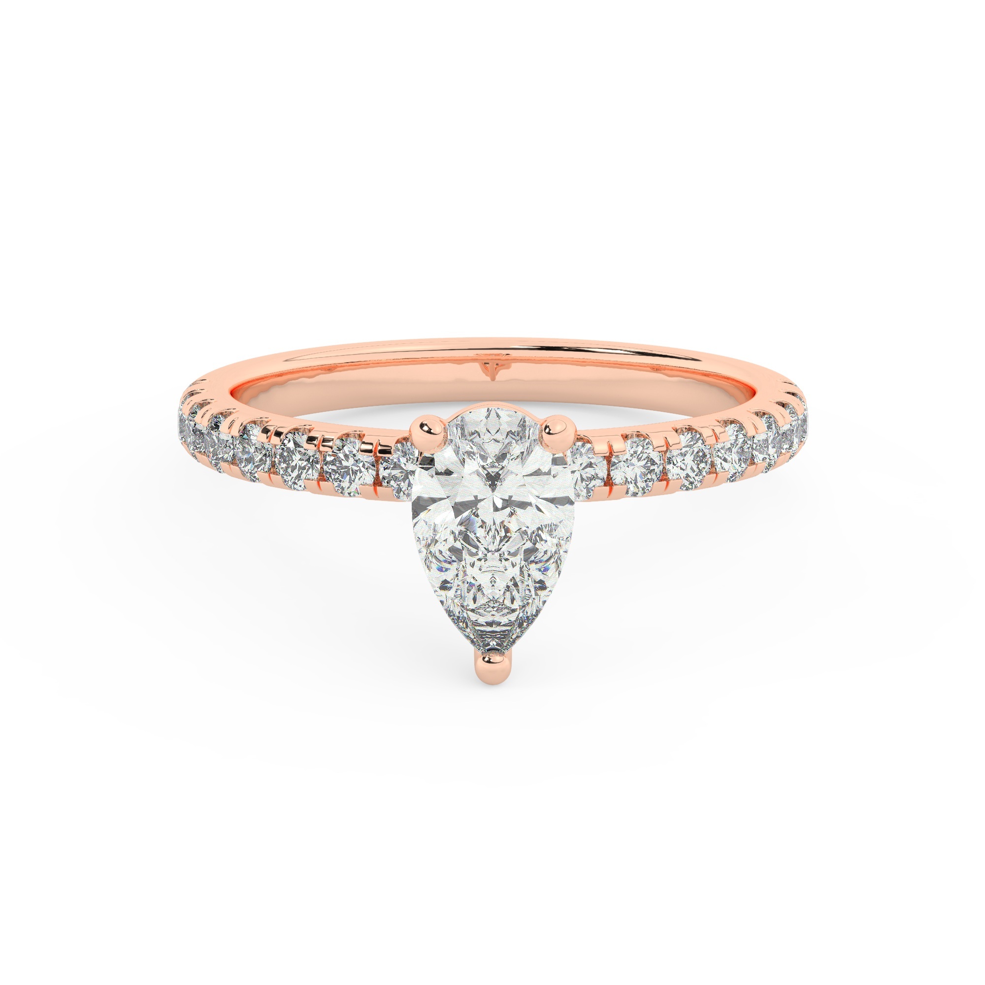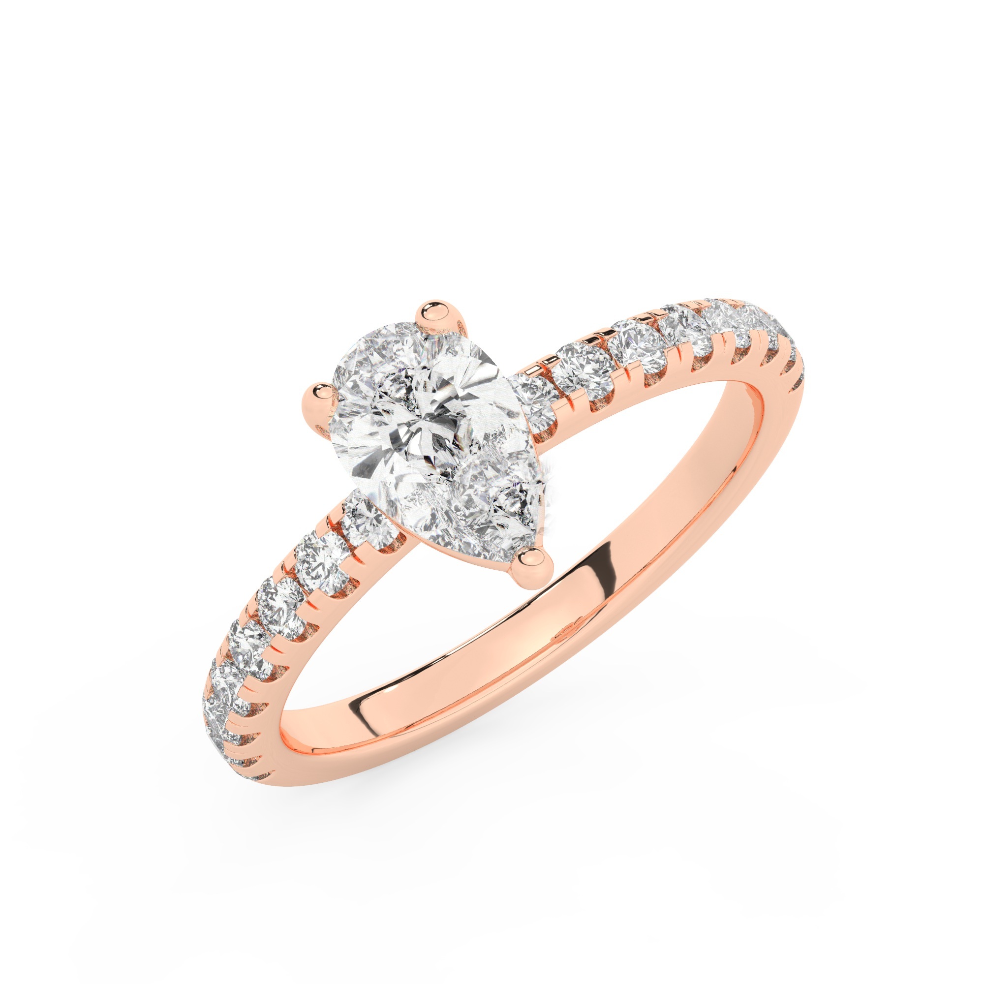 טבעת אירוסין סוליטר ומוסונייט בצדדים דגם 50037 כסף מצופה זהב אדום רוזגולד במרכז אבן מעבדה מוסונייט 4 קראט בחיתוך טיפה עם תעודה גמולוגית בינלאומית GRA מסביב ובצדדים אבני מעבדה מוסונייט במשקל כולל של 0.32 קראט בחיתוך עגול