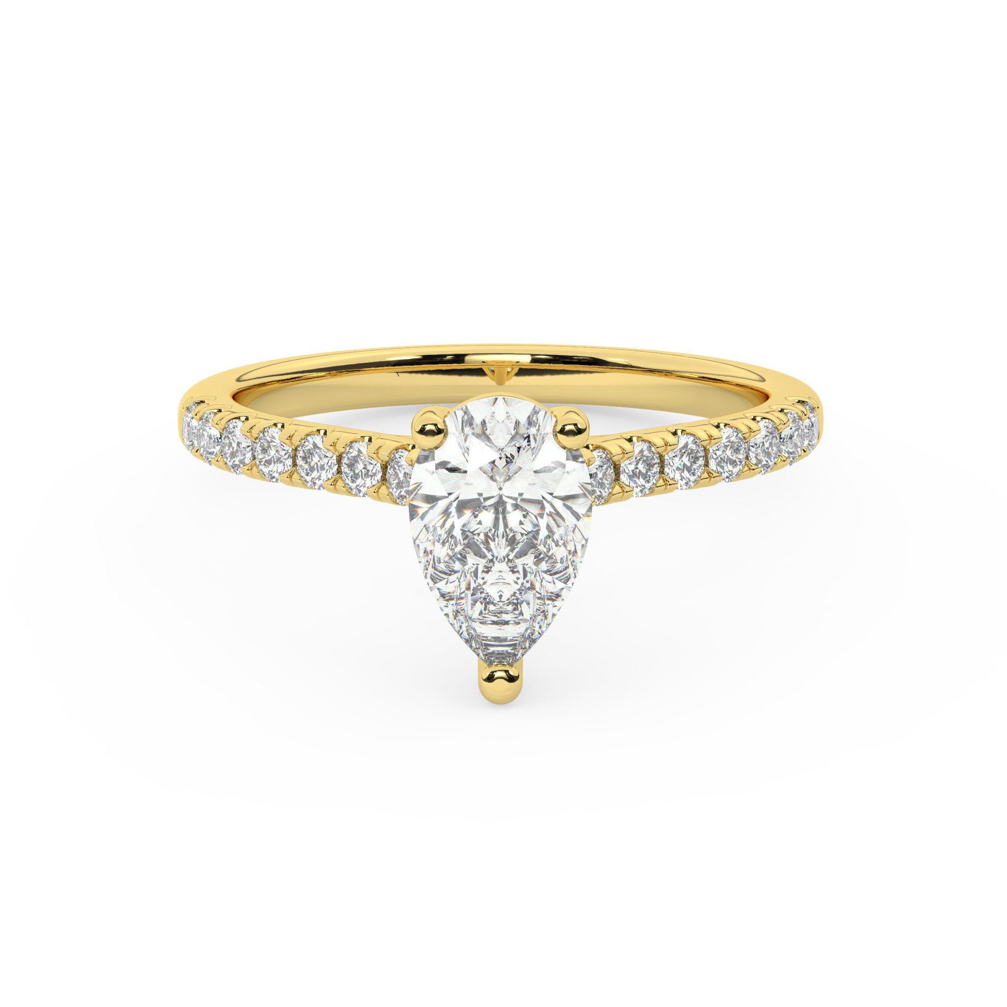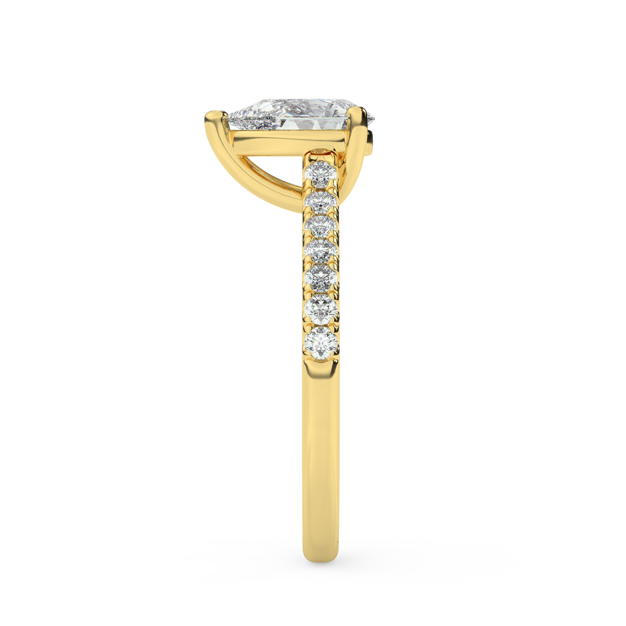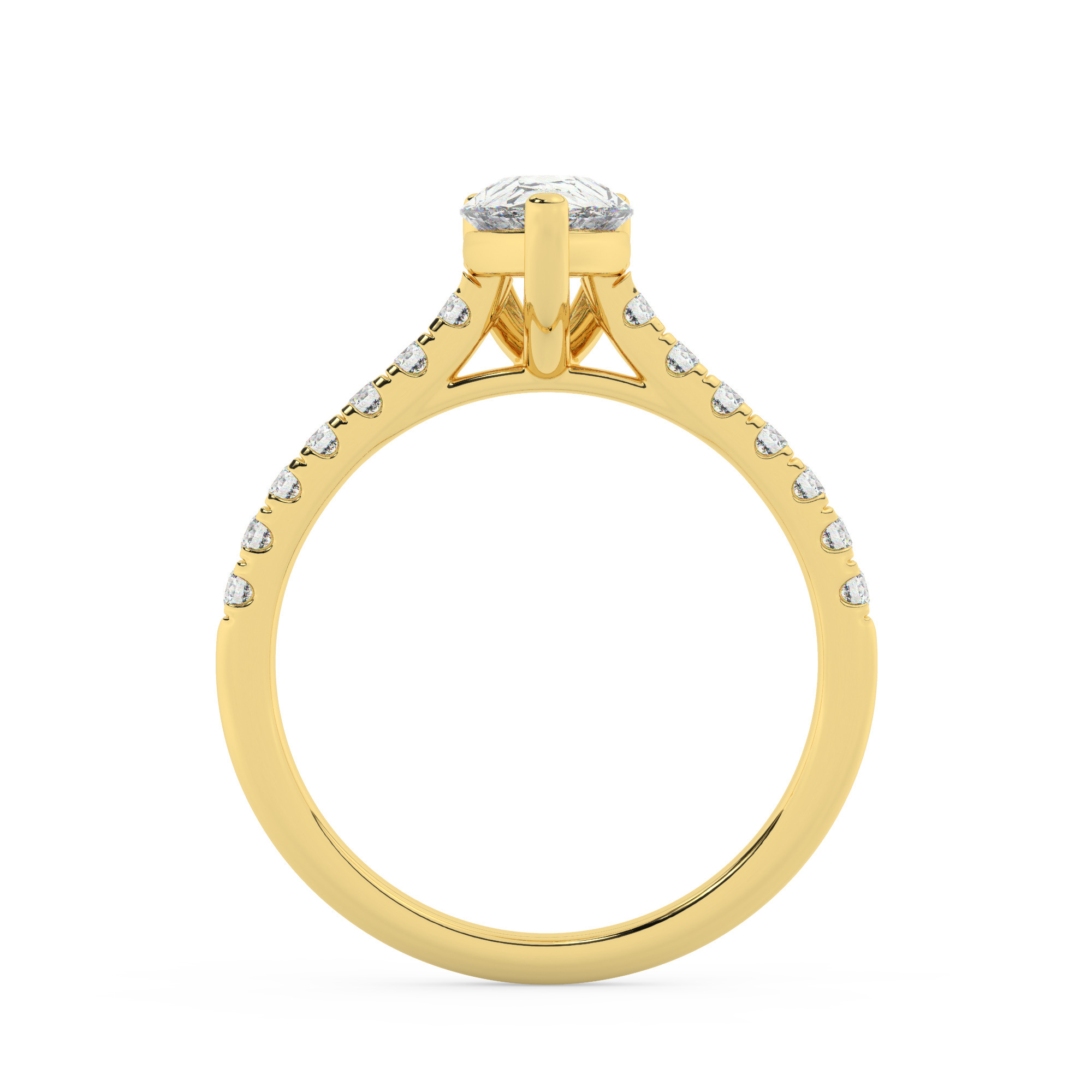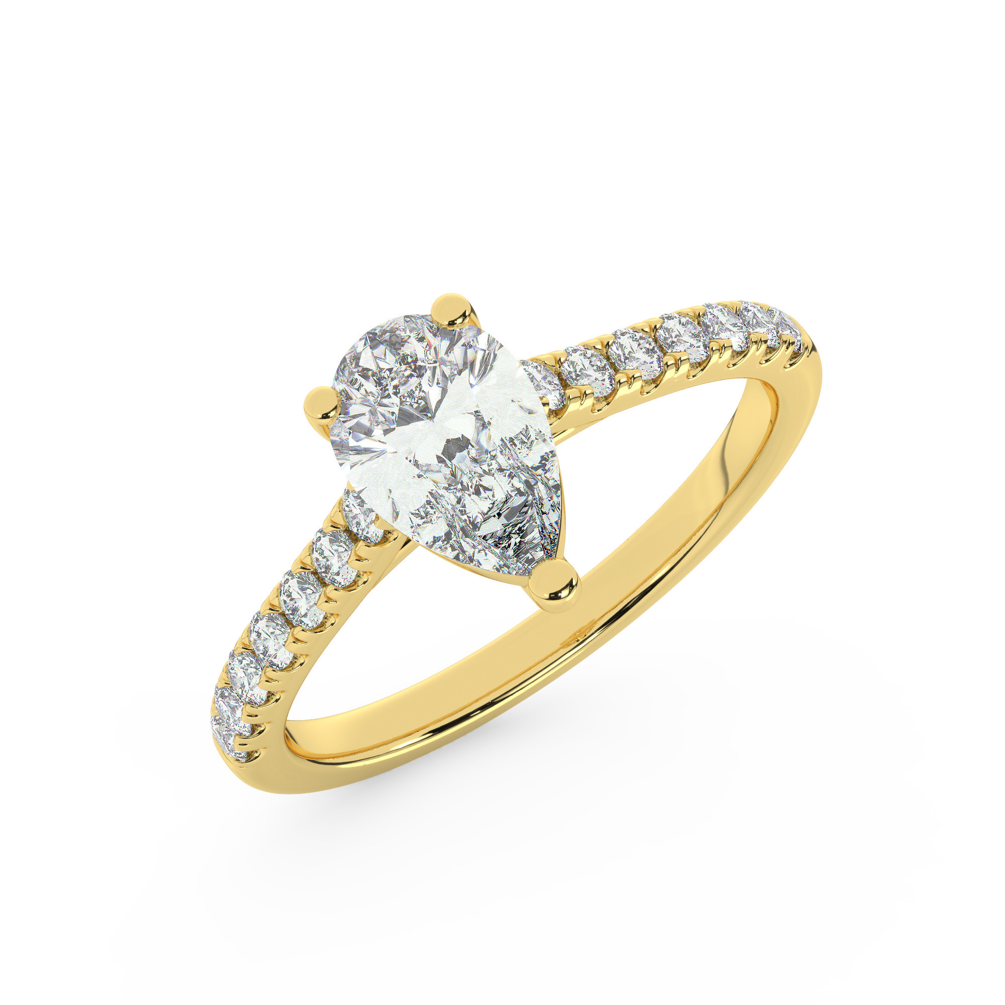 טבעת אירוסין סוליטר ויהלומים בצדדים דגם 50019 כסף מצופה זהב צהוב במרכז אבן מעבדה מוסונייט 4 קראט בחיתוך טיפה עם תעודה גמולוגית בינלאומית GRA מסביב ובצדדים אבני מעבדה מוסונייט במשקל כולל של 0.28 קראט בחיתוך עגול