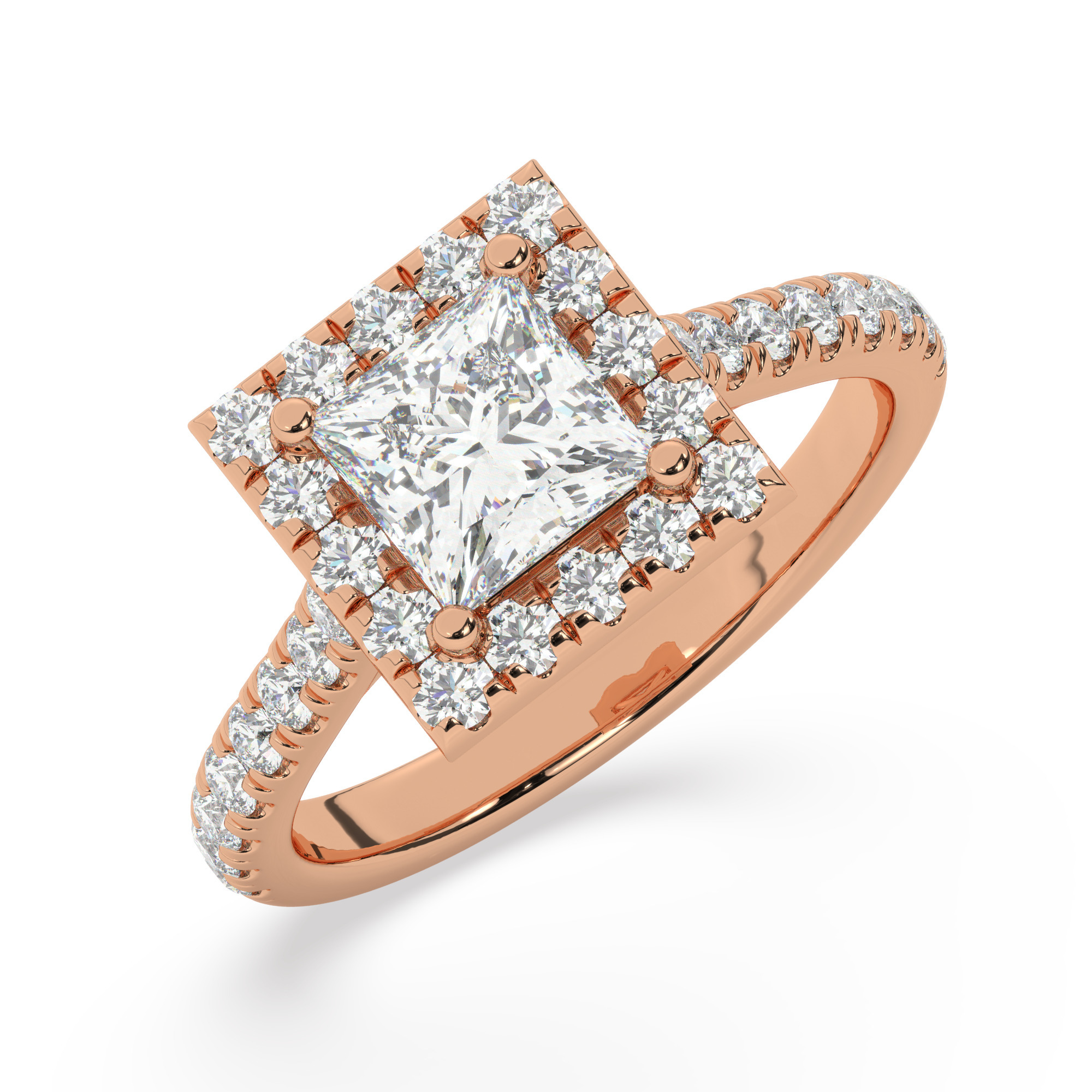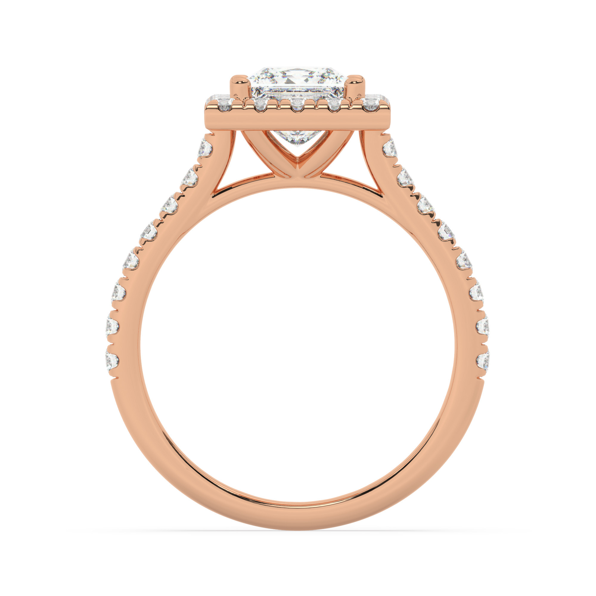 טבעת אירוסין היילו דגם 50026 כסף מצופה זהב אדום רוזגולד במרכז אבן מעבדה מוסונייט 2.50 קראט בחיתוך פרינסס עם תעודה גמולוגית בינלאומית GRA מסביב ובצדדים אבני מעבדה מוסונייט במשקל כולל של 0.68 קראט בחיתוך עגול
