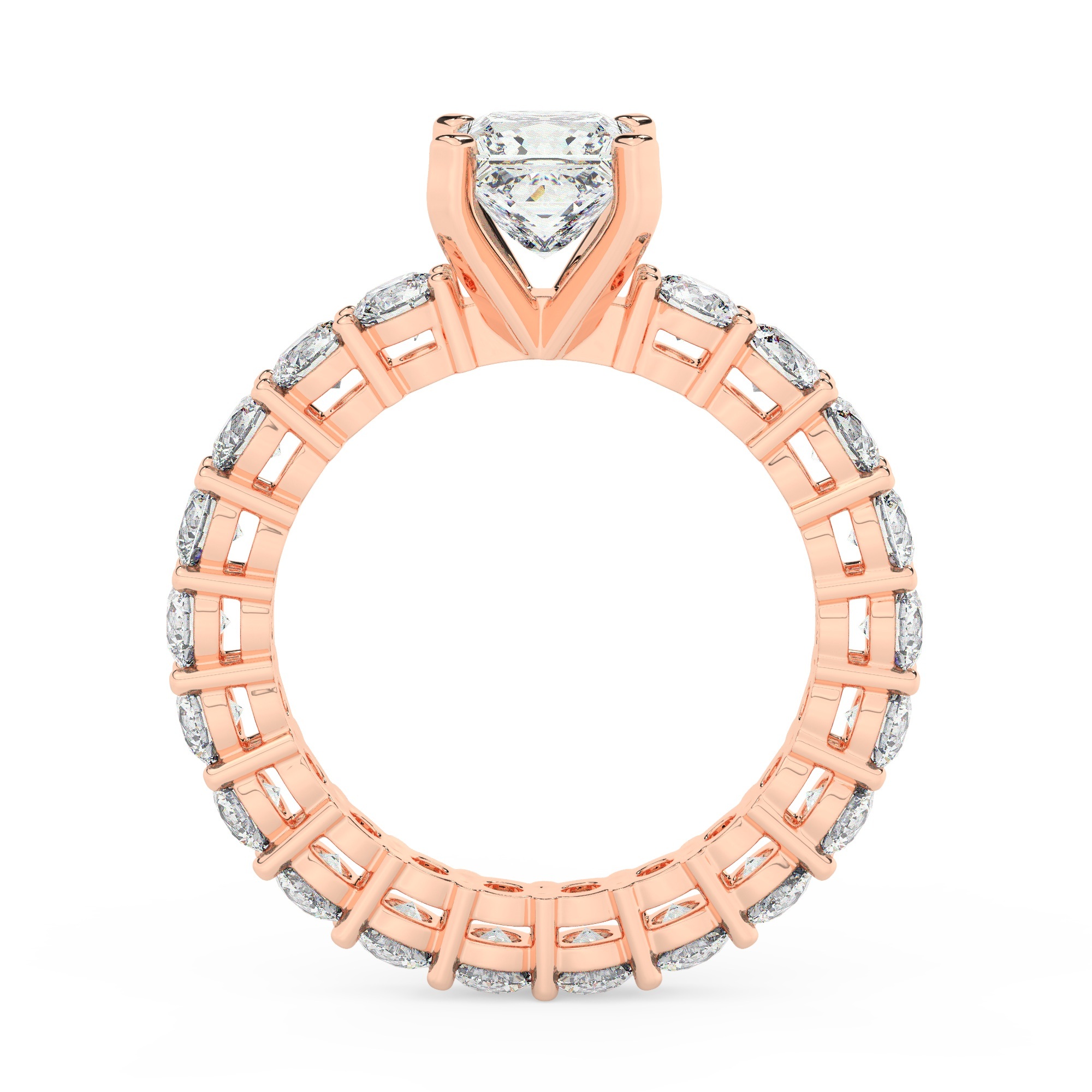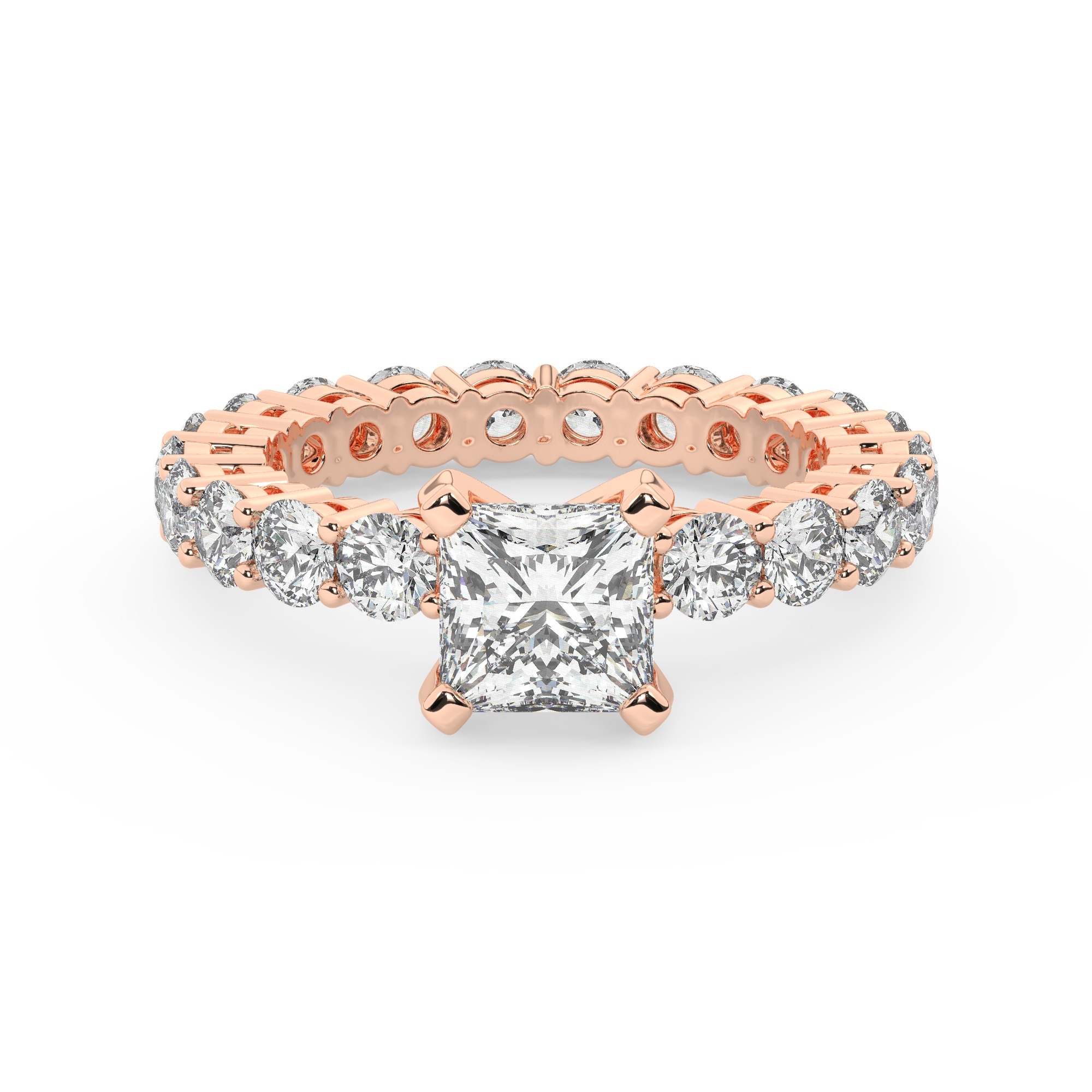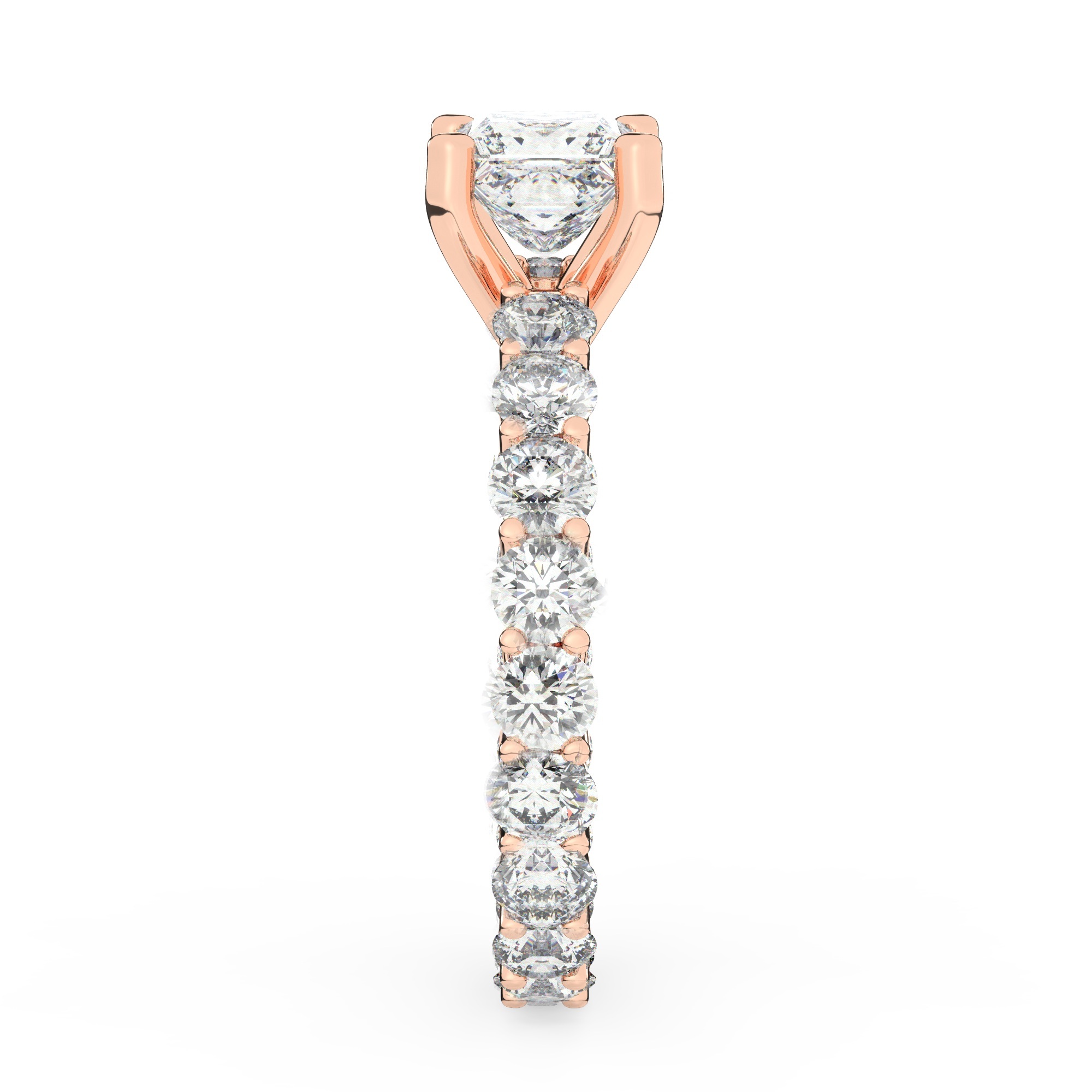 טבעת אירוסין סוליטר ומוסונייט בצדדים איטרנטיני דגם 50044 כסף מצופה זהב אדום רוזגולד במרכז אבן מעבדה מוסונייט 2.50 קראט בחיתוך פרינסס עם תעודה גמולוגית בינלאומית GRA מסביב ובצדדים אבני מעבדה מוסונייט במשקל כולל של 1.80 קראט בחיתוך עגול