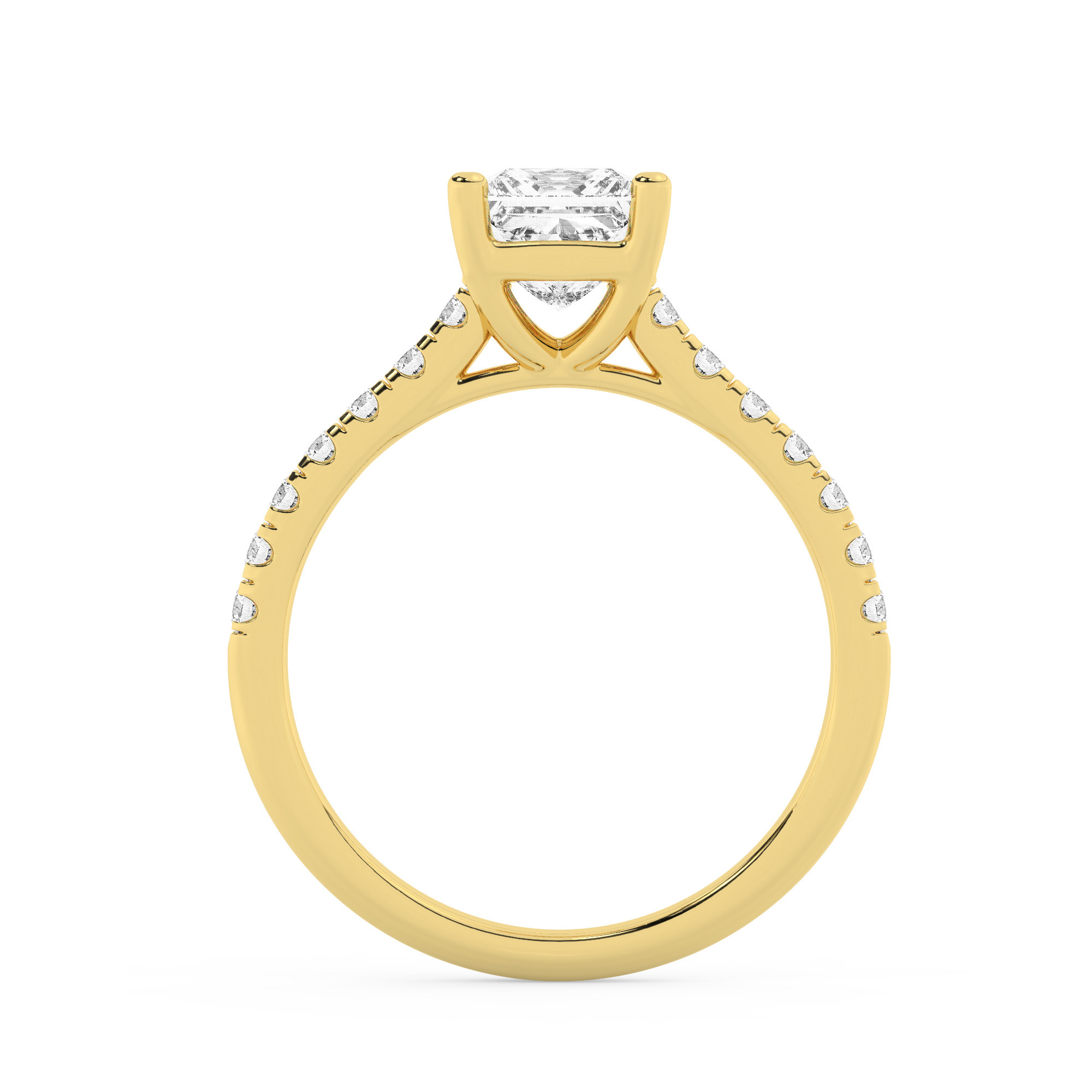 טבעת אירוסין סוליטר ויהלומים בצדדים דגם 50019 כסף מצופה זהב צהוב במרכז אבן מעבדה מוסונייט 4 קראט בחיתוך פרינסס עם תעודה גמולוגית בינלאומית GRA מסביב ובצדדים אבני מעבדה מוסונייט במשקל כולל של 0.28 קראט בחיתוך עגול