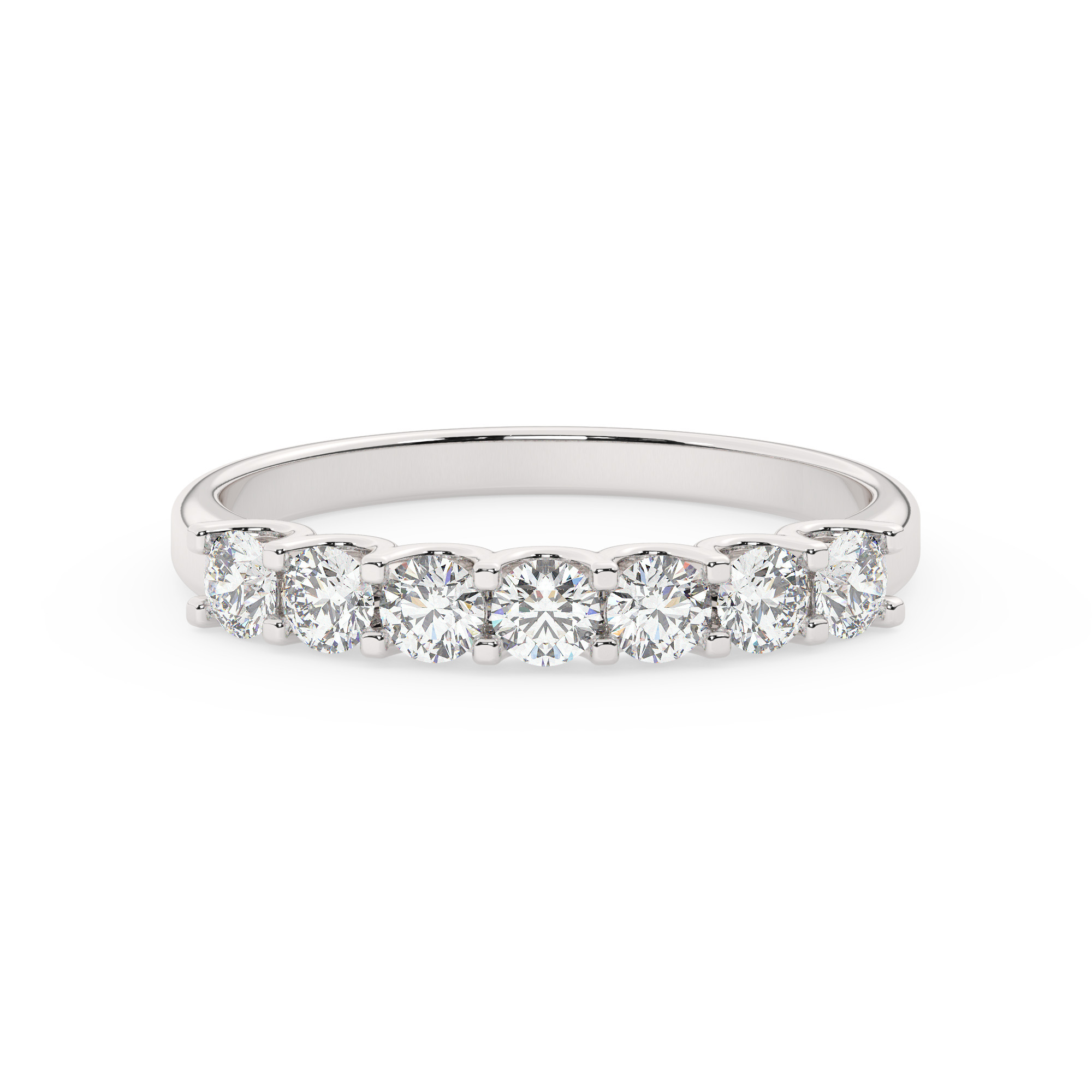 בטבעת משובצים 7 אבני מעבדה מוסונייט בחיתוך עגול במשקל כולל של 0.60 קרט עם תעודה גמולוגית.