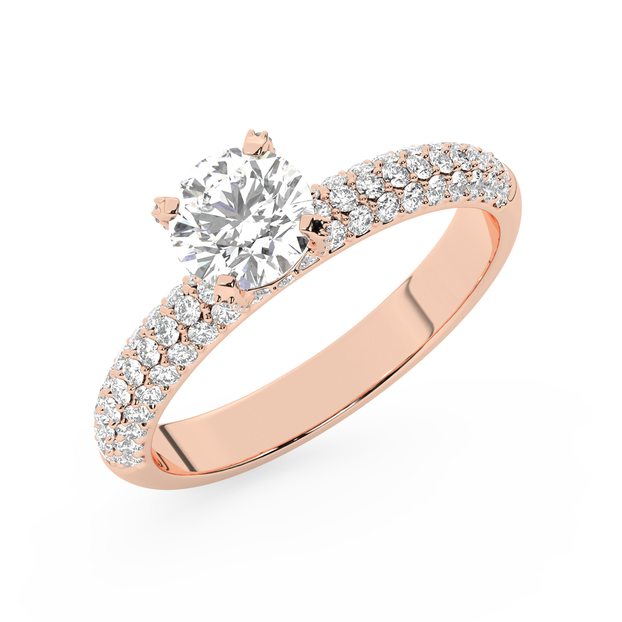 טבעת אירוסין סוליטר ומוסונייט בצדדים דגם 50014 כסף מצופה זהב אדום רוזגולד במרכז אבן מעבדה מוסונייט 0.75 קראט בחיתוך עגול עם תעודה גמולוגית מסביב ובצדדים אבני מעבדה מוסונייט במשקל כולל של 0.50 קראט בחיתוך עגול
