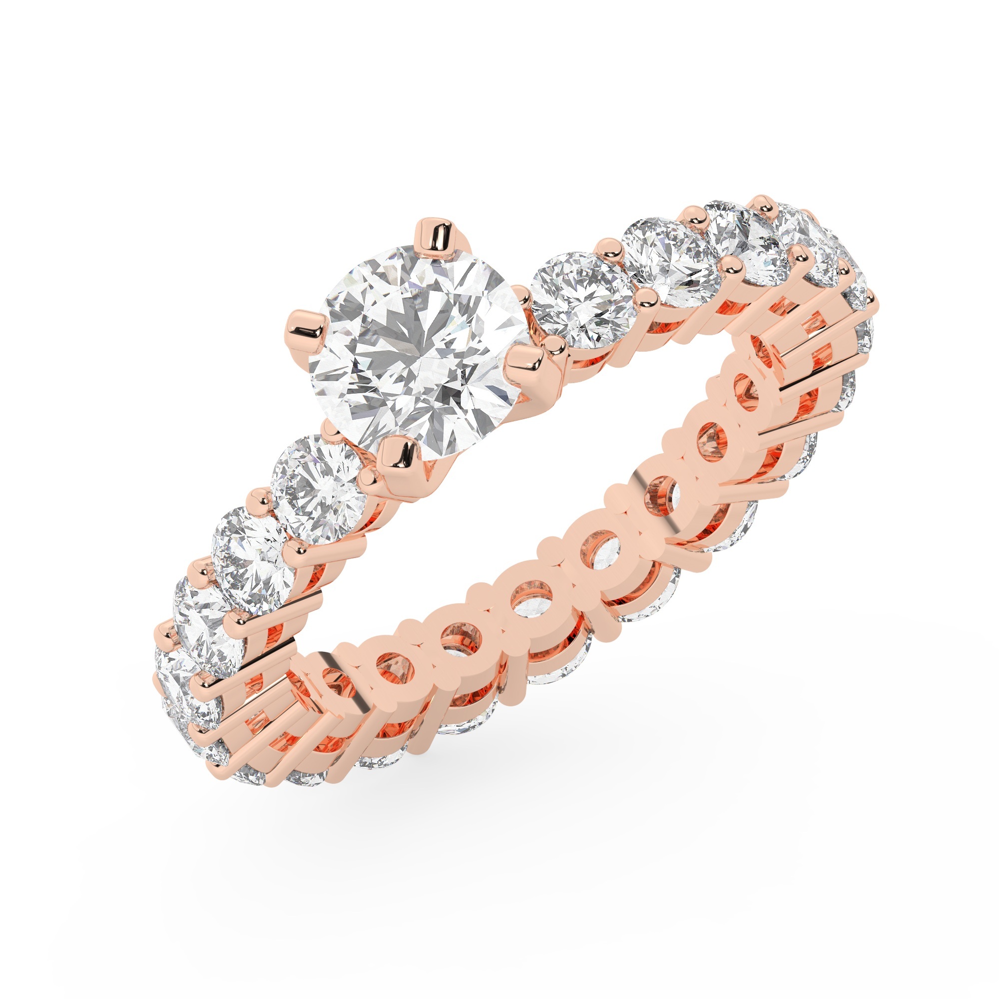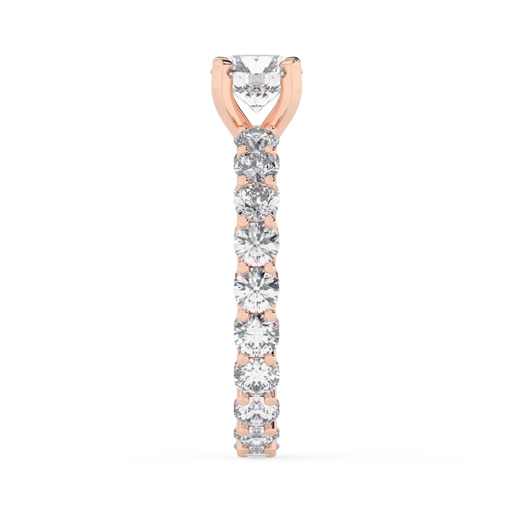 טבעת אירוסין סוליטר ומוסונייט בצדדים איטרנטיני דגם 50044 זהב אדום רוזגולד 14 קראט במרכז אבן מעבדה מוסונייט 1 קראט בחיתוך עגול עם תעודה גמולוגית בינלאומית GRA מסביב ובצדדים אבני מעבדה מוסונייט במשקל כולל של 1.80 קראט בחיתוך עגול