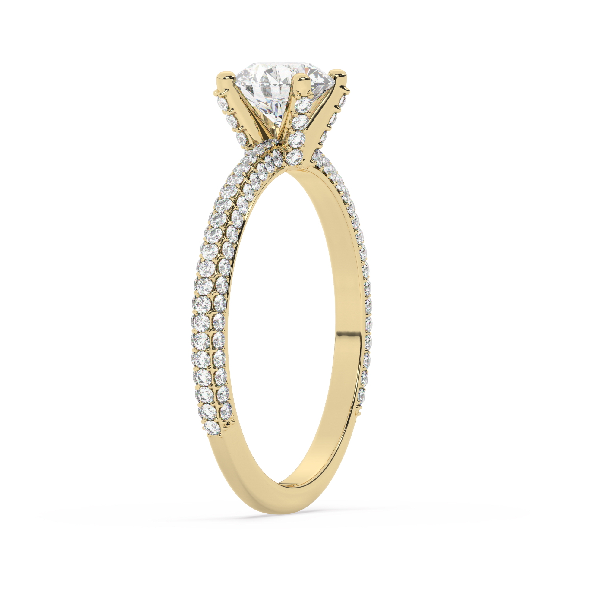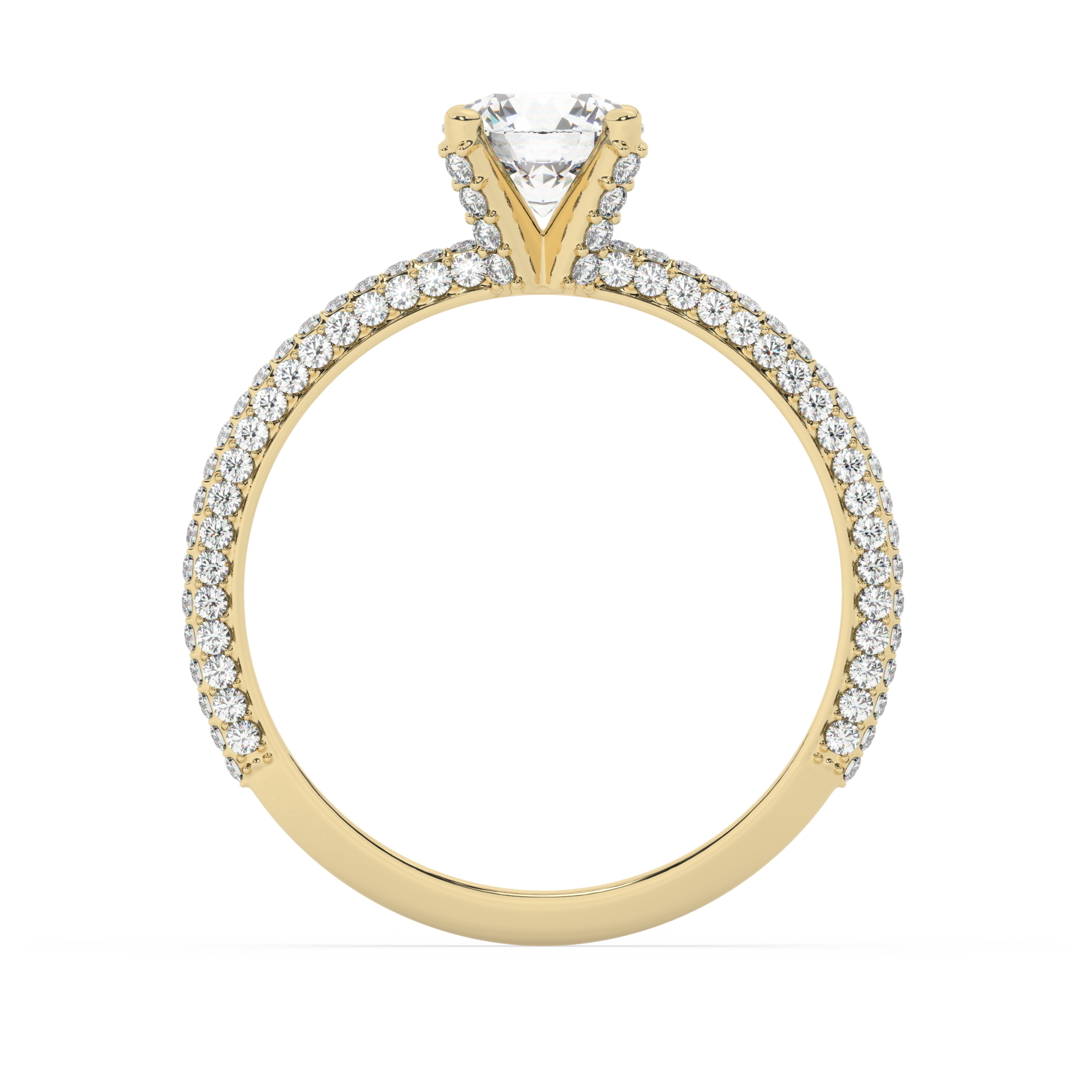 טבעת אירוסין סוליטר ויהלומים בצדדים דגם 50012 כסף מצופה זהב צהוב במרכז אבן מעבדה מוסונייט 1 קראט בחיתוך עגול עם תעודה גמולוגית בינלאומית GRA מסביב ובצדדים אבני מעבדה מוסונייט במשקל כולל של 0.40 קראט בחיתוך עגול