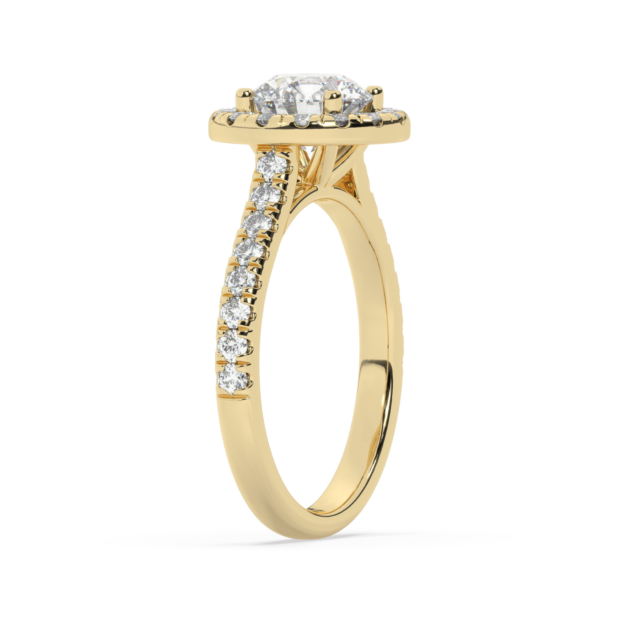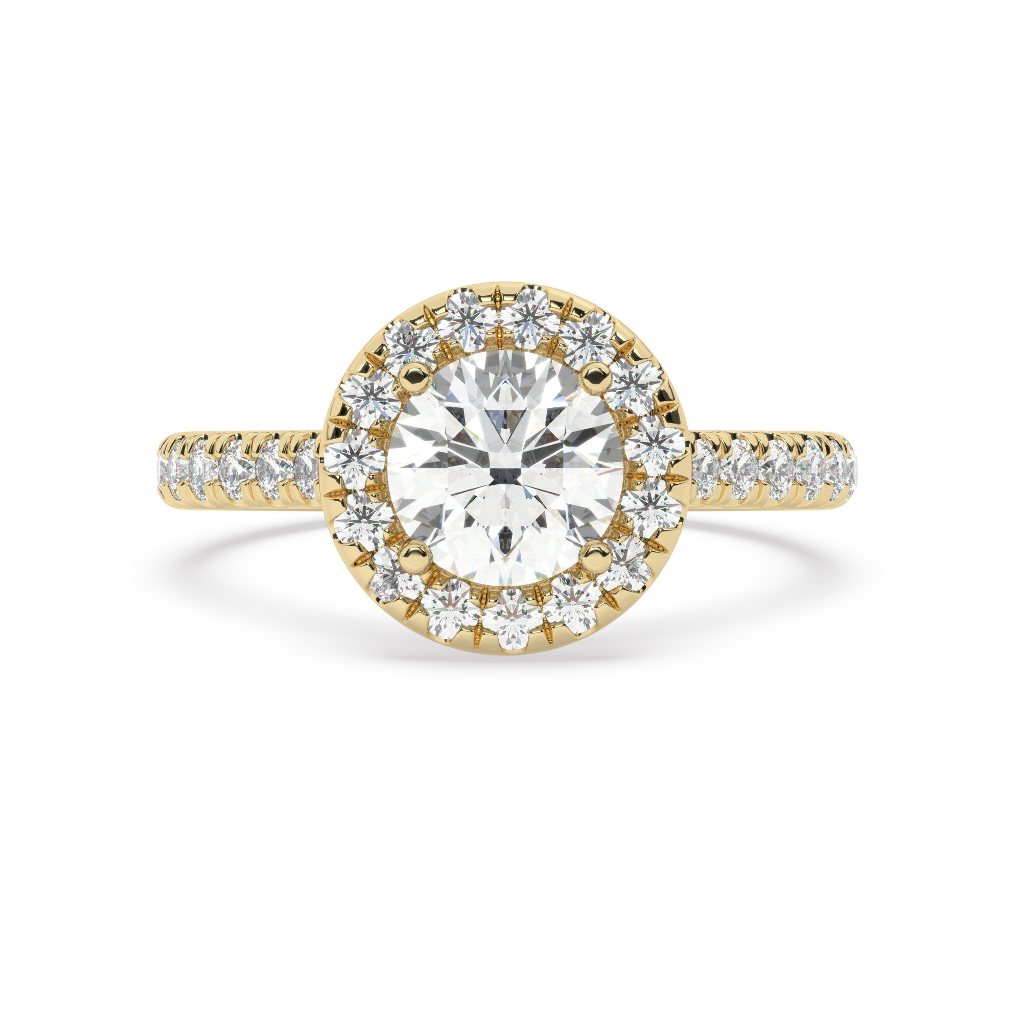 טבעת אירוסין היילו דגם 50026 כסף מצופה זהב צהוב במרכז אבן מעבדה מוסונייט 1.50 קראט בחיתוך עגול עם תעודה גמולוגית בינלאומית GRA מסביב ובצדדים אבני מעבדה מוסונייט במשקל כולל של 0.62 קראט בחיתוך עגול