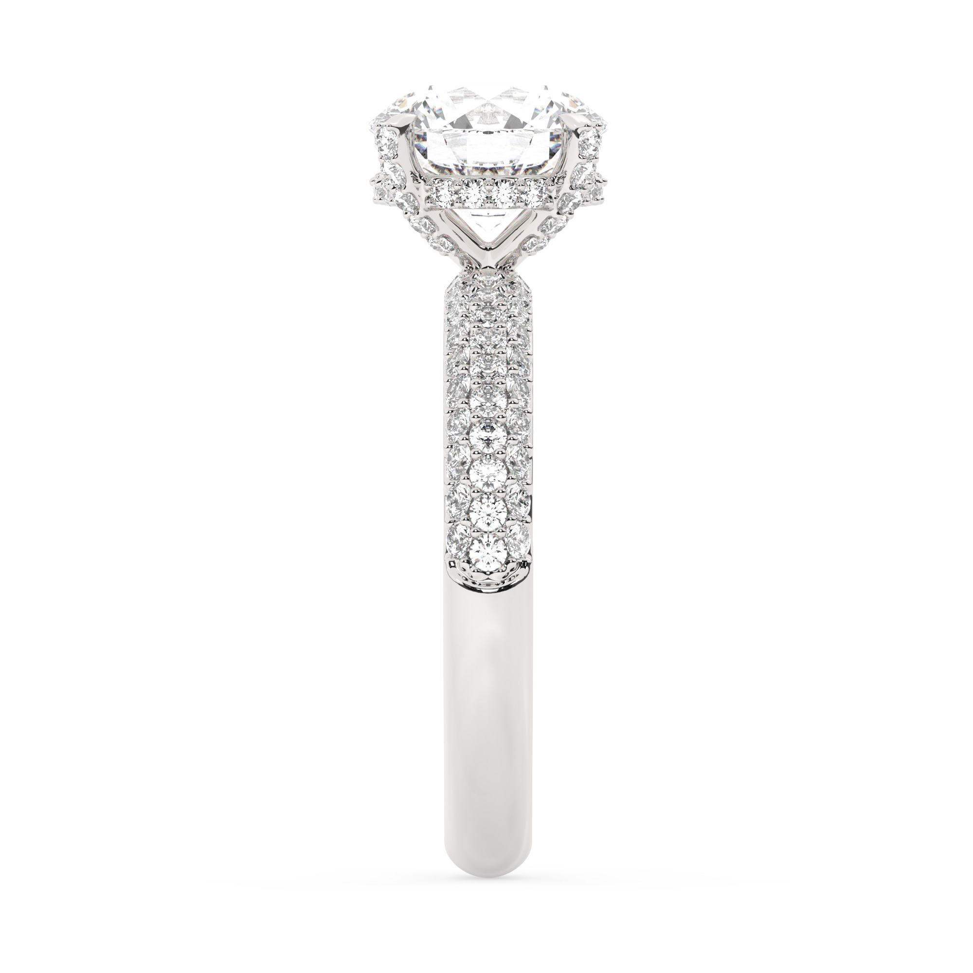 טבעת אירוסין מרשימה העשויה מזהב לבן 14 קראט עם 101 אבנים נוצצות במשקל כולל של 2.50 קראט. האבן המרכזית היא מוסונייט עגול מרהיב במשקל 2 קראט, בצבע D ובניקיון VVS1, עם תעודה גמולוגית בינלאומית GRA.