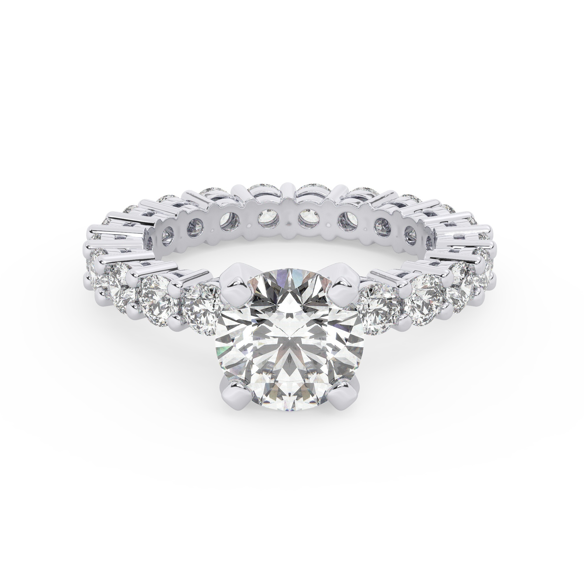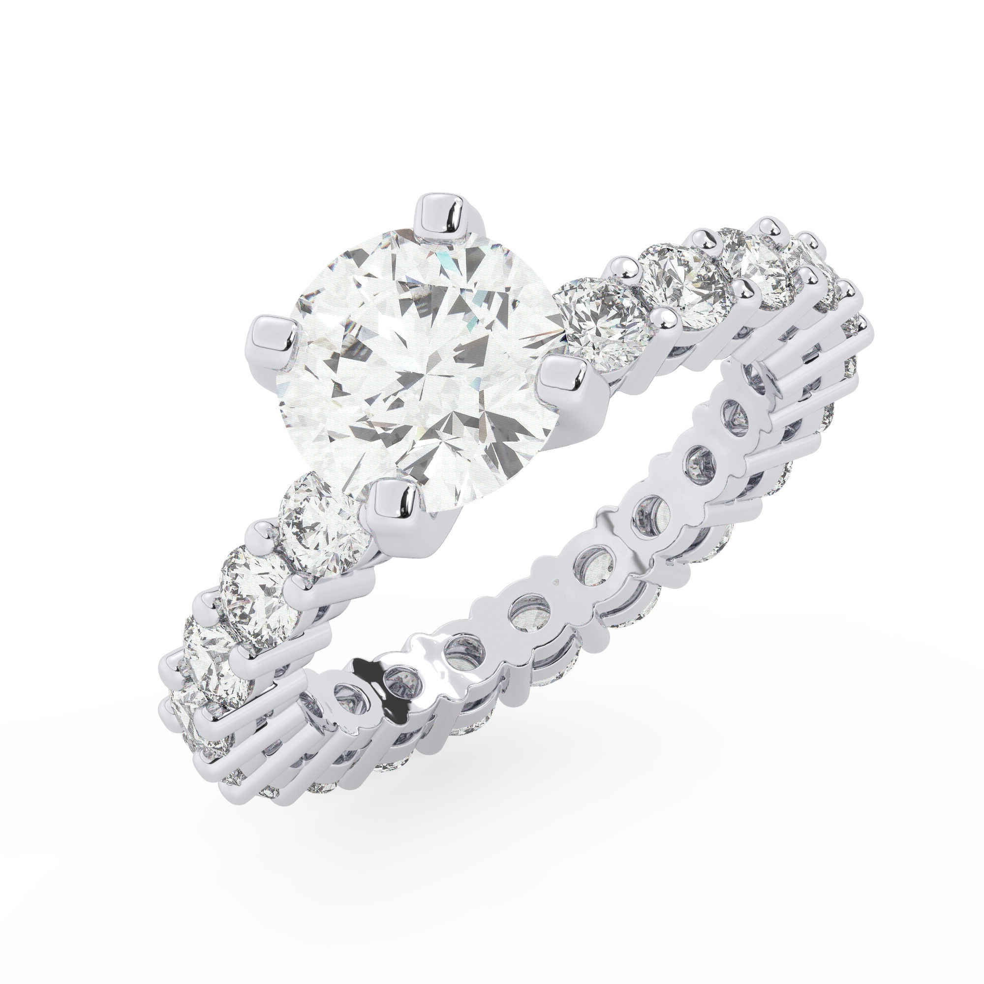 טבעת אירוסין סוליטר ומוסונייט בצדדים איטרנטיני דגם 50044 כסף מצופה זהב לבן במרכז אבן מעבדה מוסונייט 2 קראט בחיתוך עגול עם תעודה גמולוגית בינלאומית GRA מסביב ובצדדים אבני מעבדה מוסונייט במשקל כולל של 1.80 קראט בחיתוך עגול