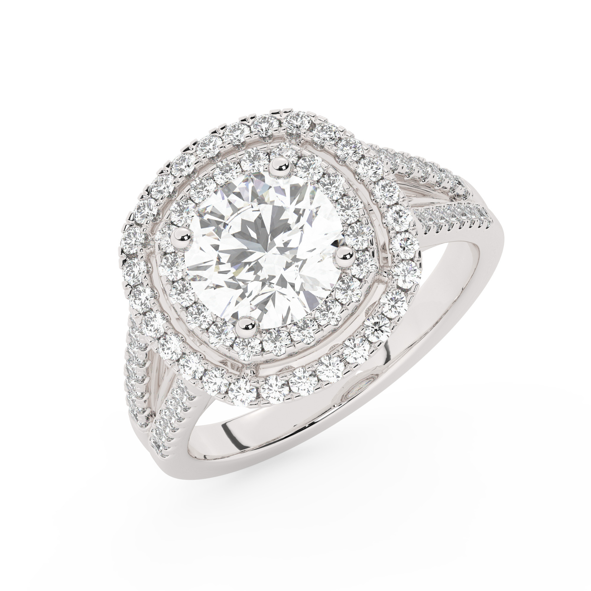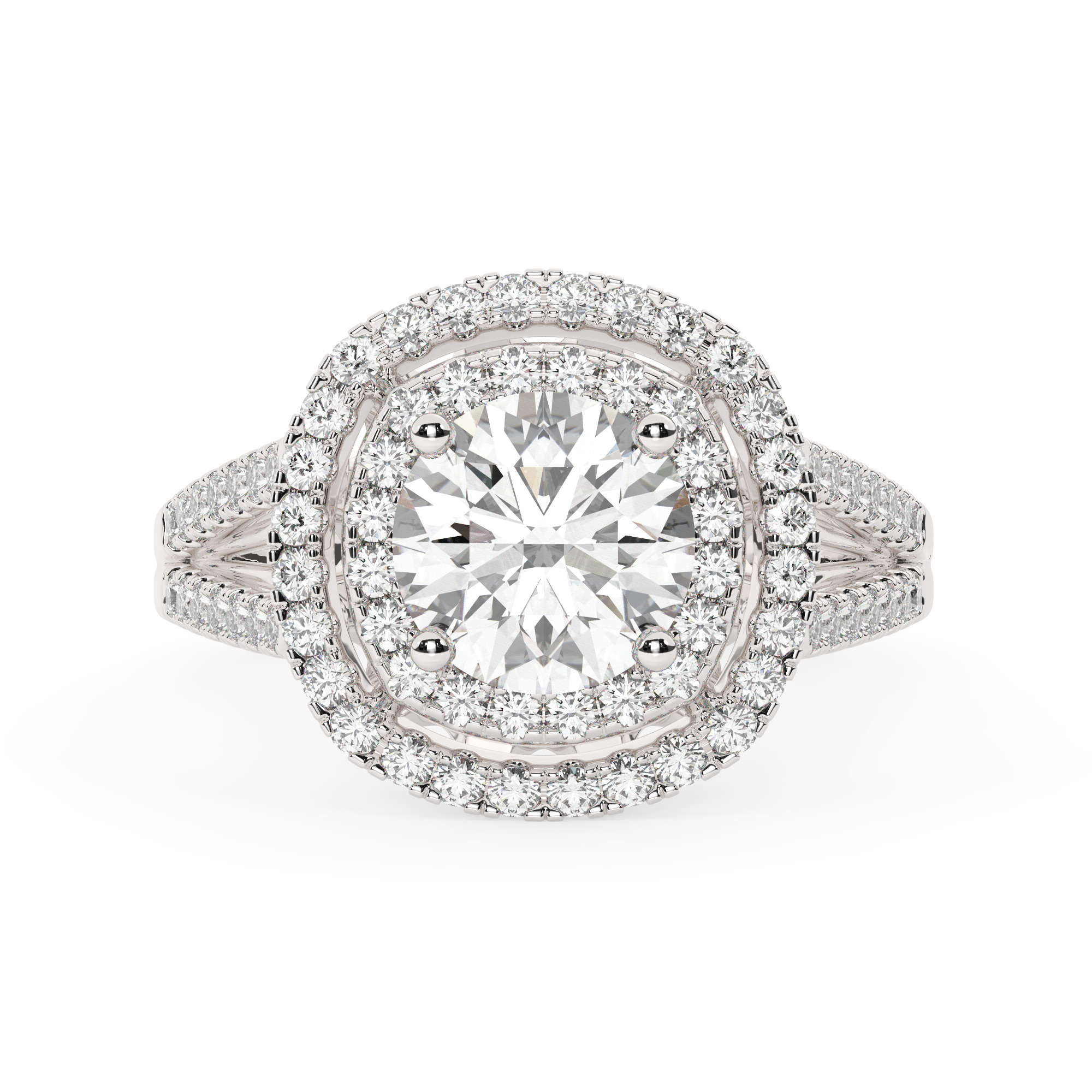 טבעת אירוסין היילו דגם 50025 כסף מצופה זהב לבן במרכז אבן מעבדה מוסונייט 2.50 קראט בחיתוך עגול עם תעודה גמולוגית בינלאומית GRA מסביב ובצדדים אבני מעבדה מוסונייט במשקל כולל של 0.62 קראט בחיתוך עגול