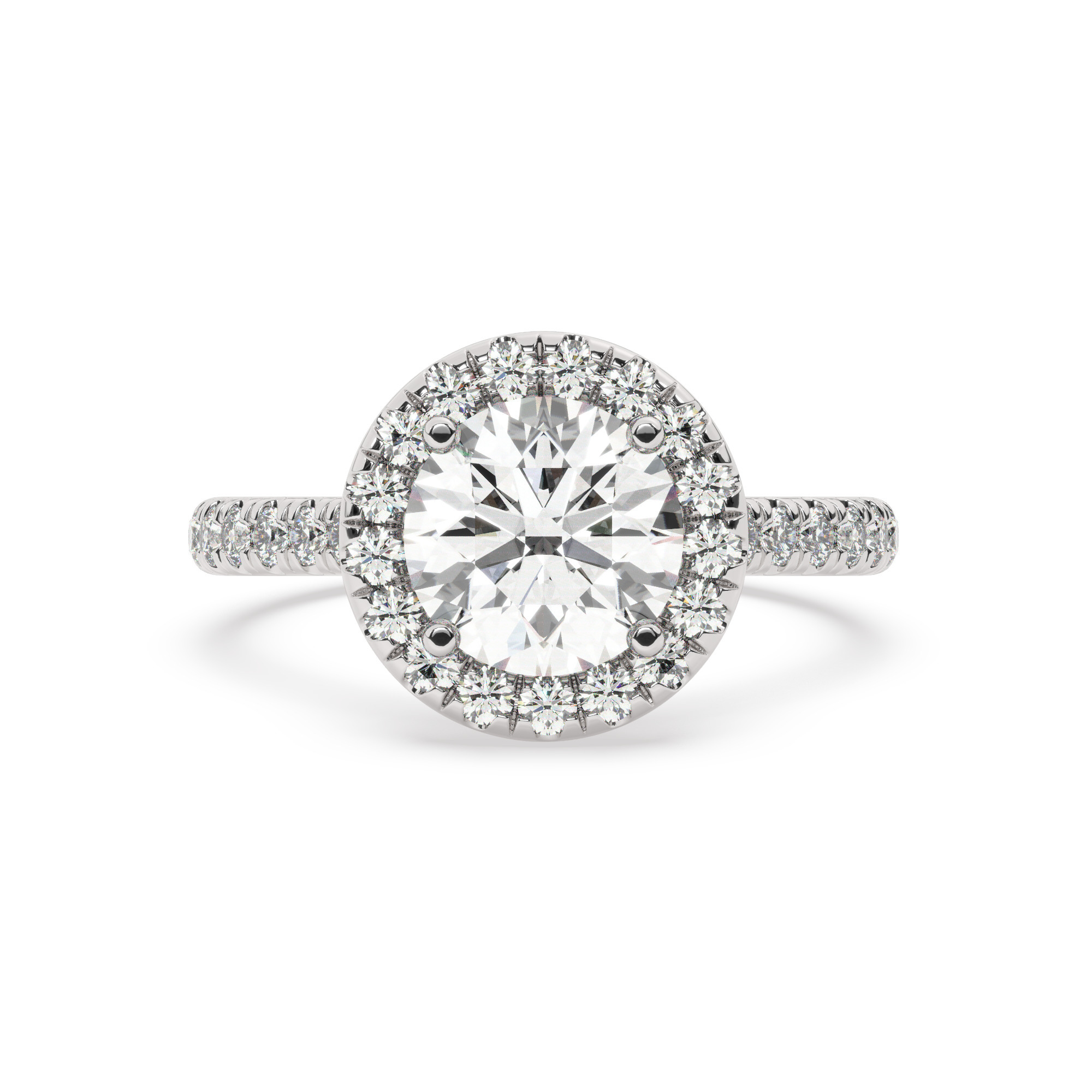 טבעת אירוסין היילו דגם 50026 כסף מצופה זהב לבן במרכז אבן מעבדה מוסונייט 2.50 קראט בחיתוך עגול עם תעודה גמולוגית בינלאומית GRA מסביב ובצדדים אבני מעבדה מוסונייט במשקל כולל של 0.68 קראט בחיתוך עגול
