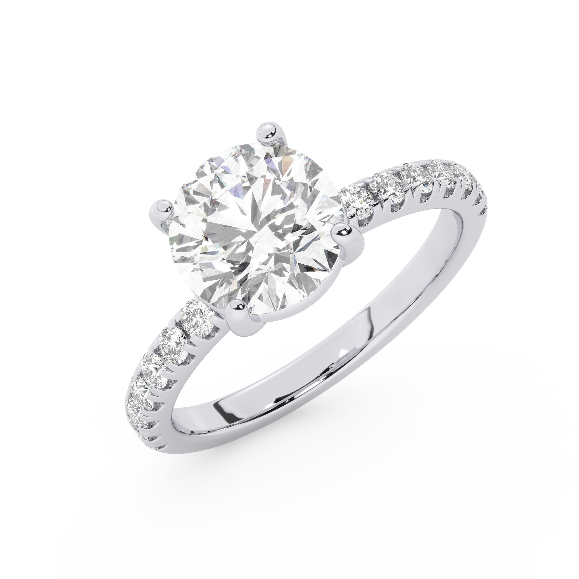 טבעת אירוסין סוליטר ומוסונייט בצדדים דגם 50037 כסף מצופה זהב לבן במרכז אבן מעבדה מוסונייט 2.50 קראט בחיתוך עגול עם תעודה גמולוגית בינלאומית GRA מסביב ובצדדים אבני מעבדה מוסונייט במשקל כולל של 0.32 קראט בחיתוך עגול