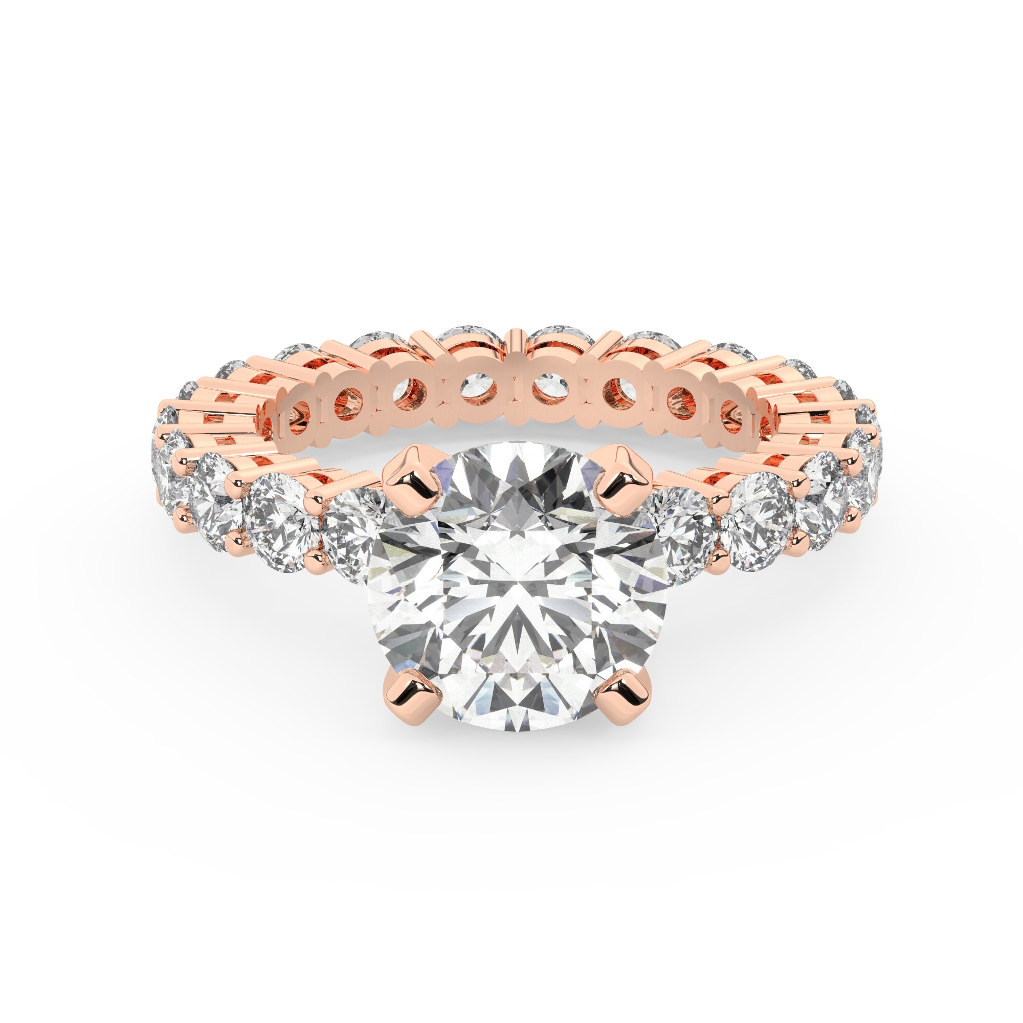 טבעת אירוסין סוליטר ומוסונייט בצדדים איטרנטיני דגם 50044 כסף מצופה זהב אדום רוזגולד במרכז אבן מעבדה מוסונייט 3 קראט בחיתוך עגול עם תעודה גמולוגית בינלאומית GRA מסביב ובצדדים אבני מעבדה מוסונייט במשקל כולל של 1.80 קראט בחיתוך עגול