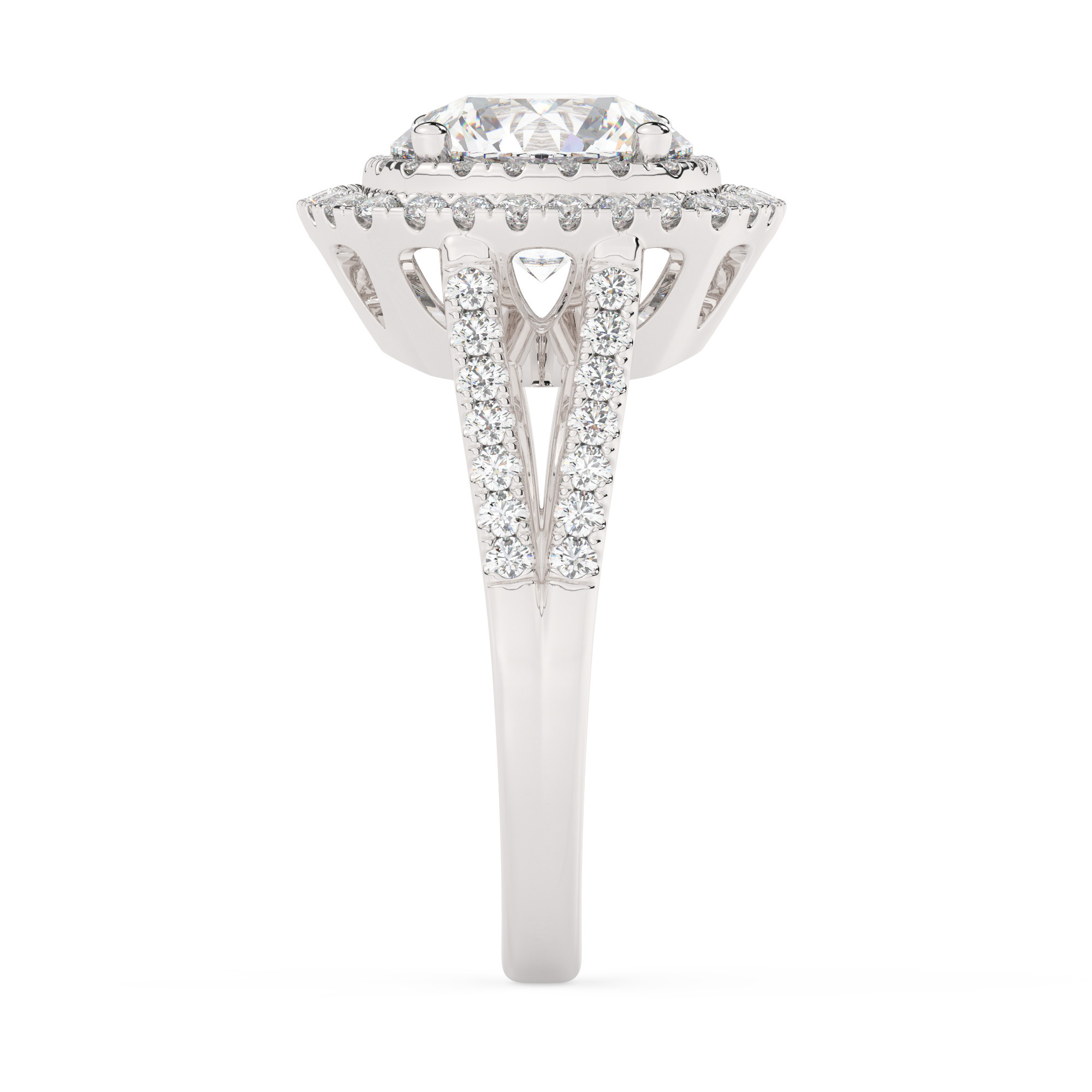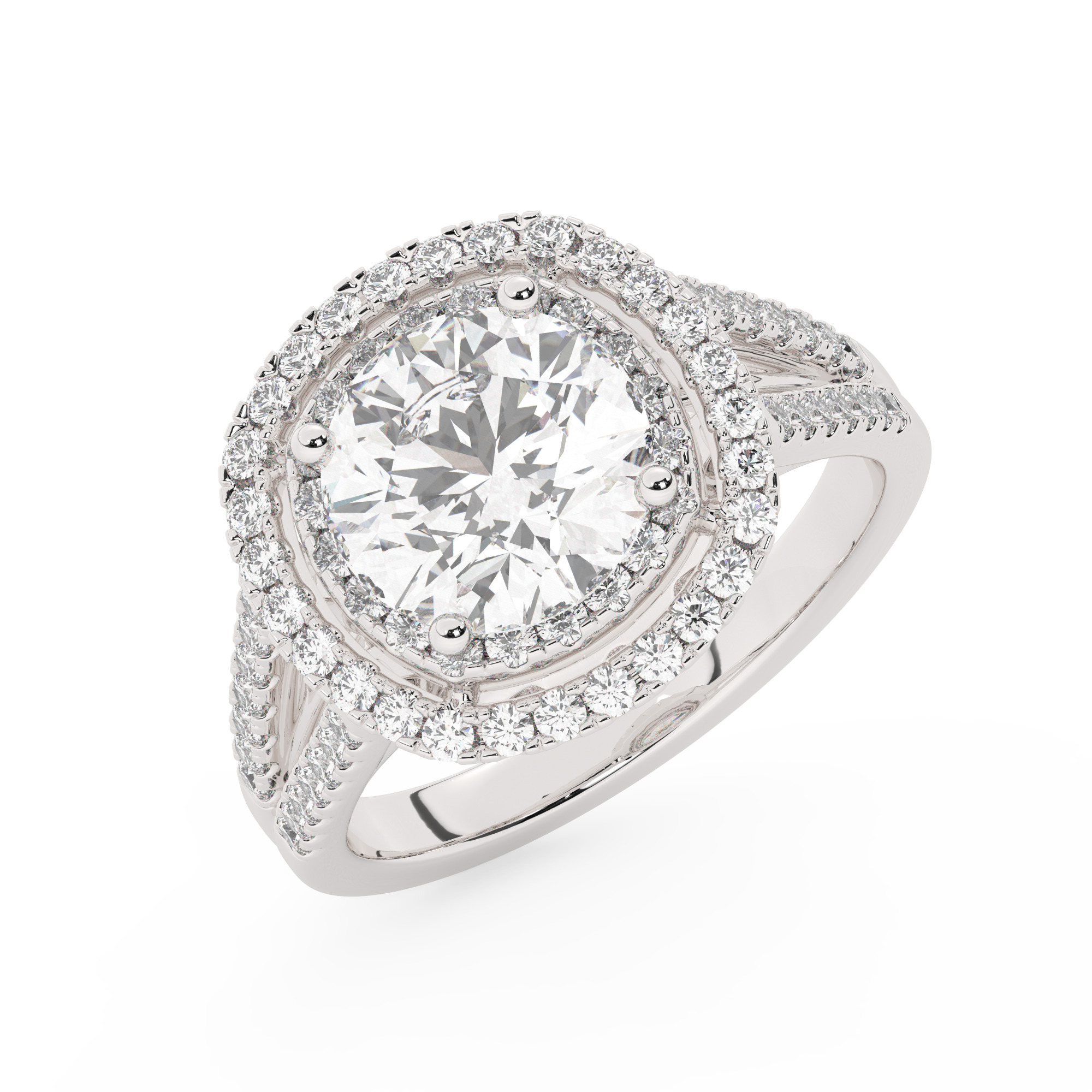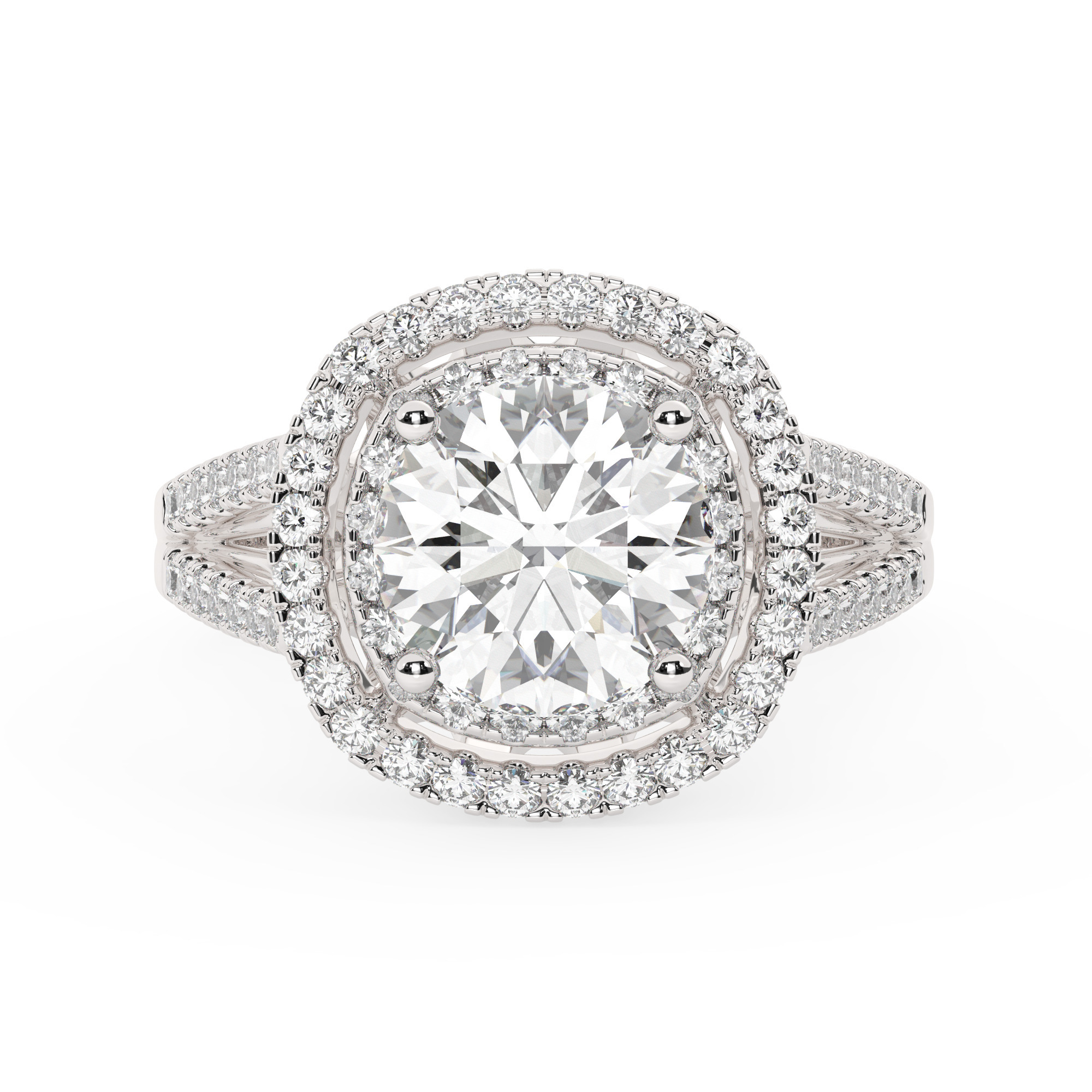 טבעת אירוסין היילו דגם 50025 כסף מצופה זהב לבן במרכז אבן מעבדה מוסונייט 3 קראט בחיתוך עגול עם תעודה גמולוגית בינלאומית GRA מסביב ובצדדים אבני מעבדה מוסונייט במשקל כולל של 0.62 קראט בחיתוך עגול