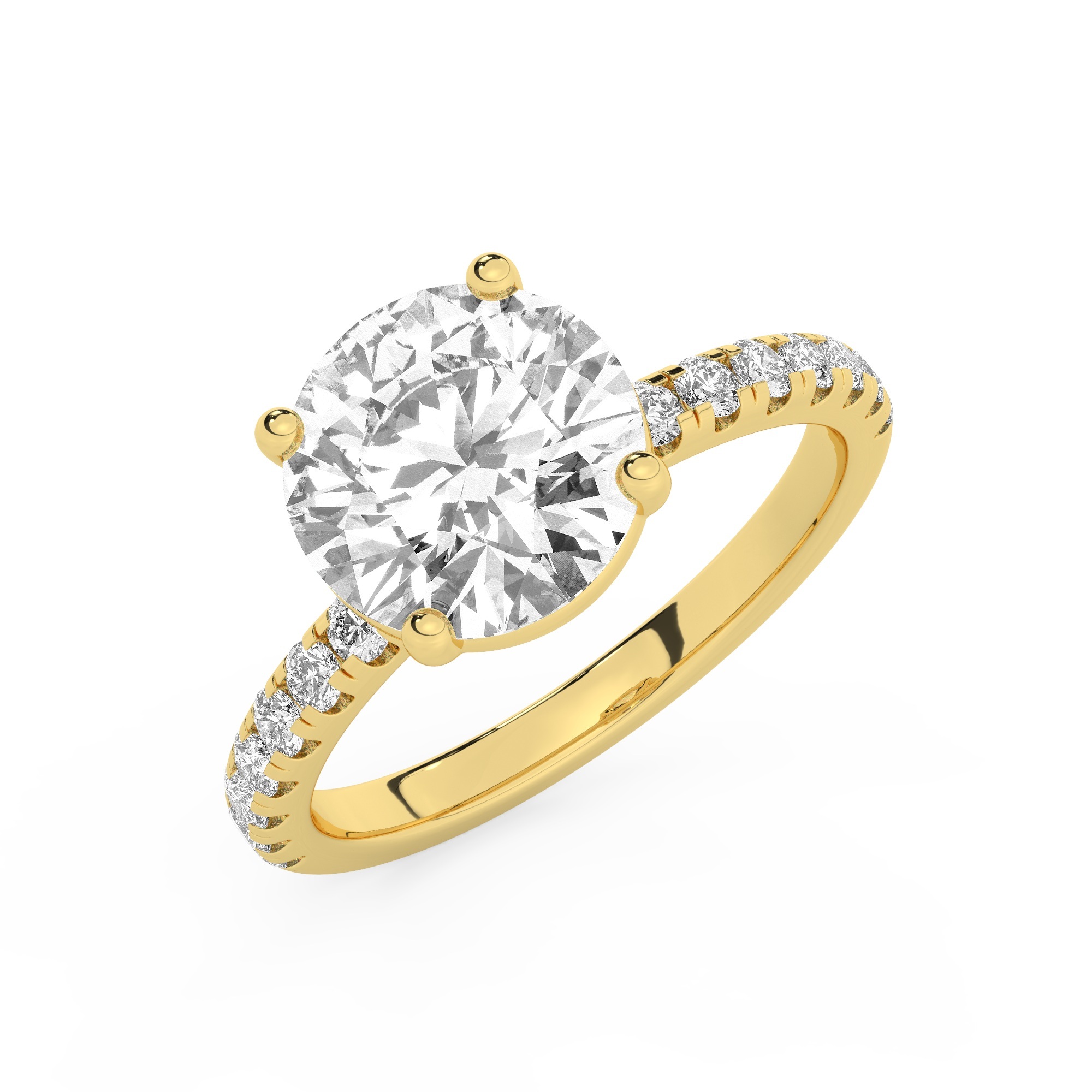 טבעת אירוסין סוליטר ומוסונייט בצדדים דגם 50037 כסף מצופה זהב צהוב במרכז אבן מעבדה מוסונייט 3 קראט בחיתוך עגול עם תעודה גמולוגית בינלאומית GRA מסביב ובצדדים אבני מעבדה מוסונייט במשקל כולל של 0.32 קראט בחיתוך עגול