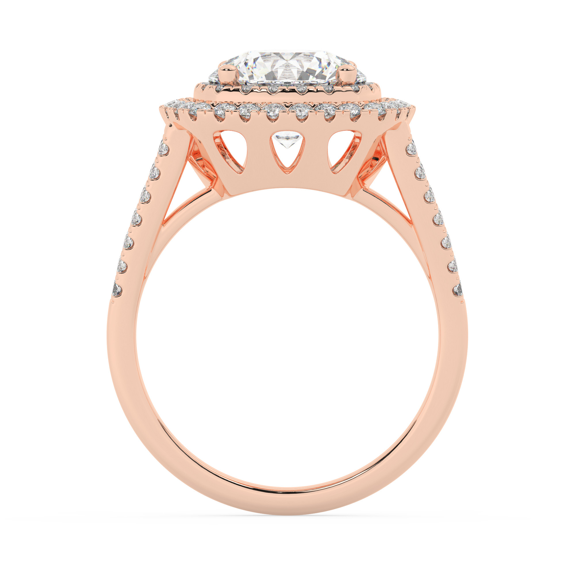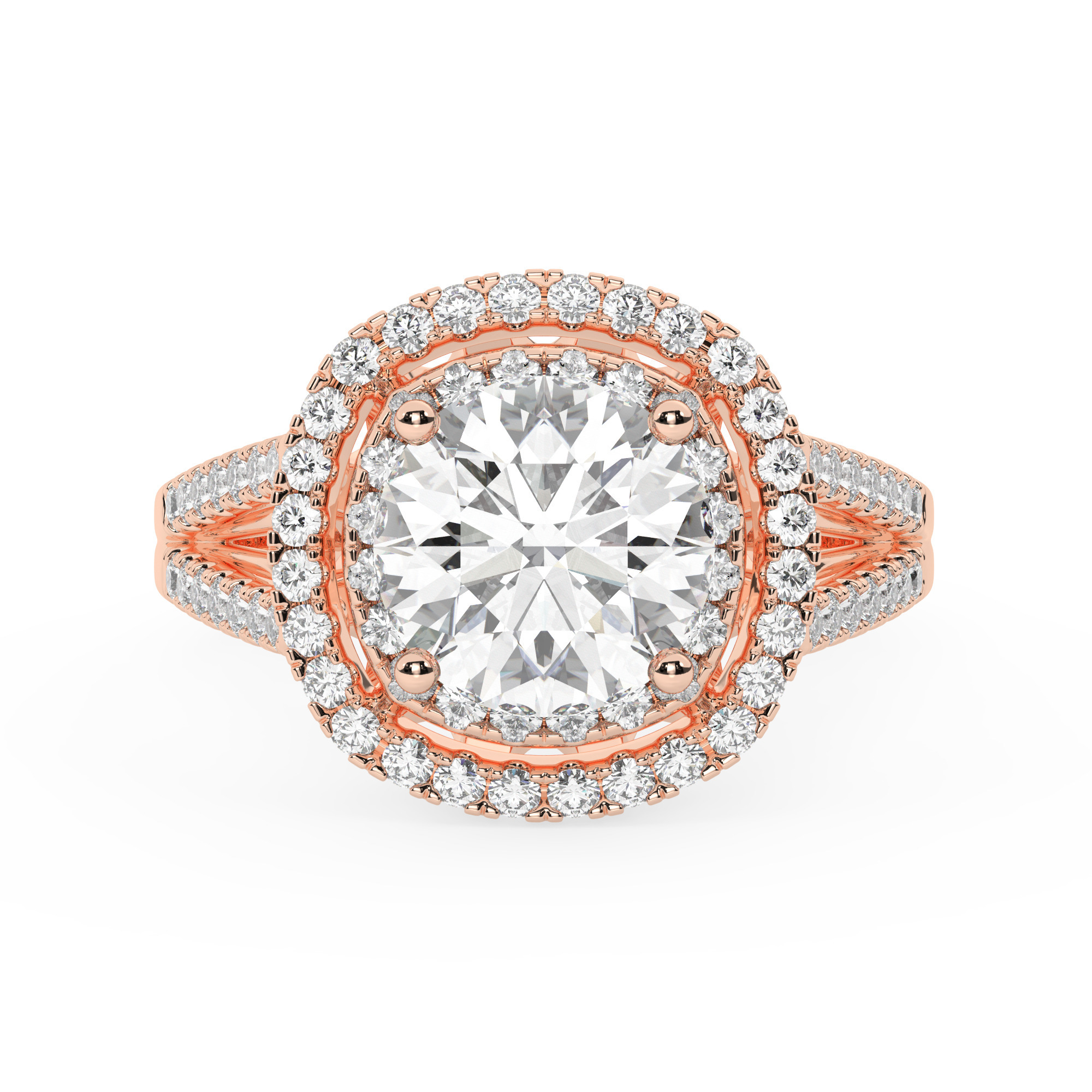 טבעת אירוסין היילו דגם 50025 כסף מצופה זהב אדום רוזגולד במרכז אבן מעבדה מוסונייט 4 קראט בחיתוך עגול עם תעודה גמולוגית בינלאומית GRA מסביב ובצדדים אבני מעבדה מוסונייט במשקל כולל של 0.62 קראט בחיתוך עגול