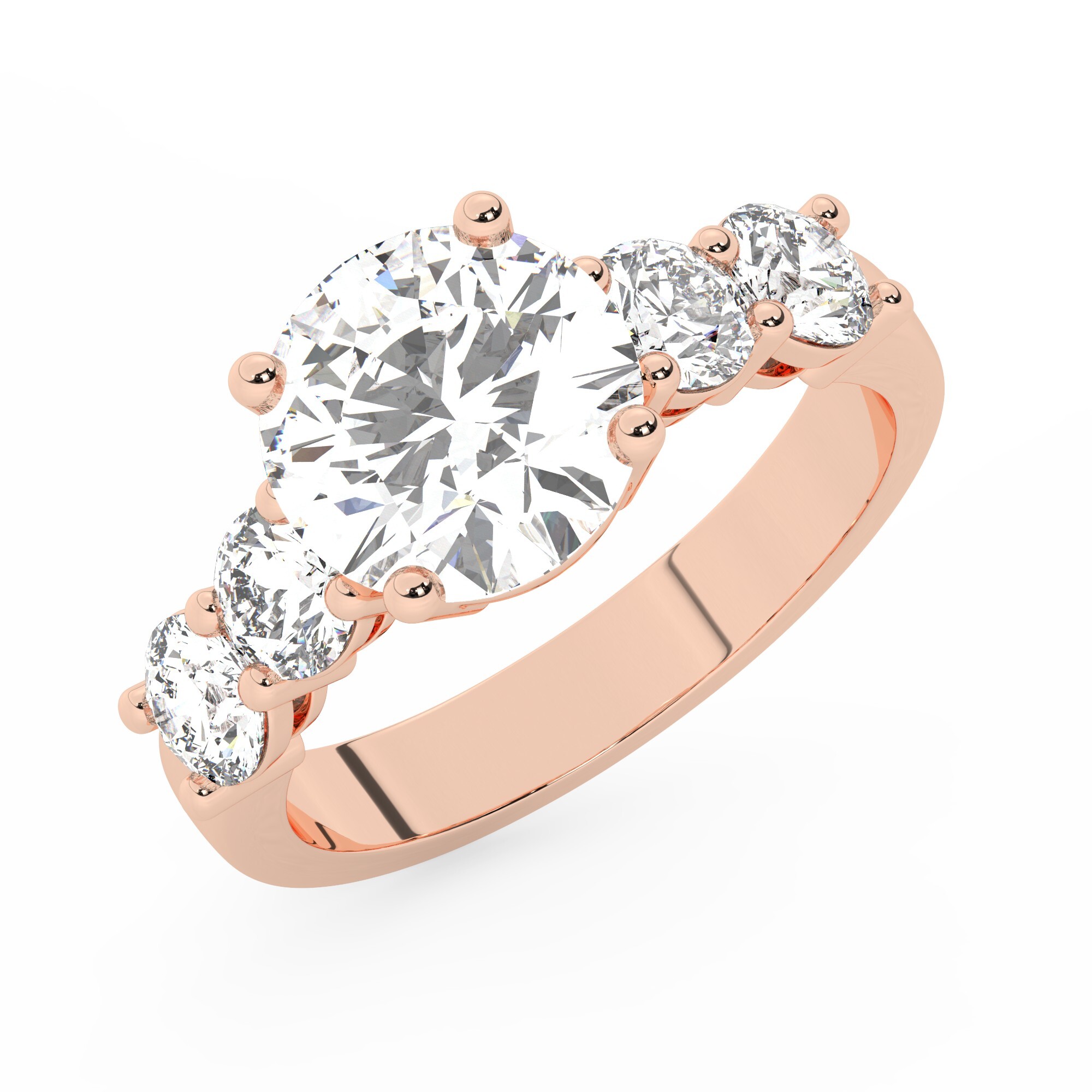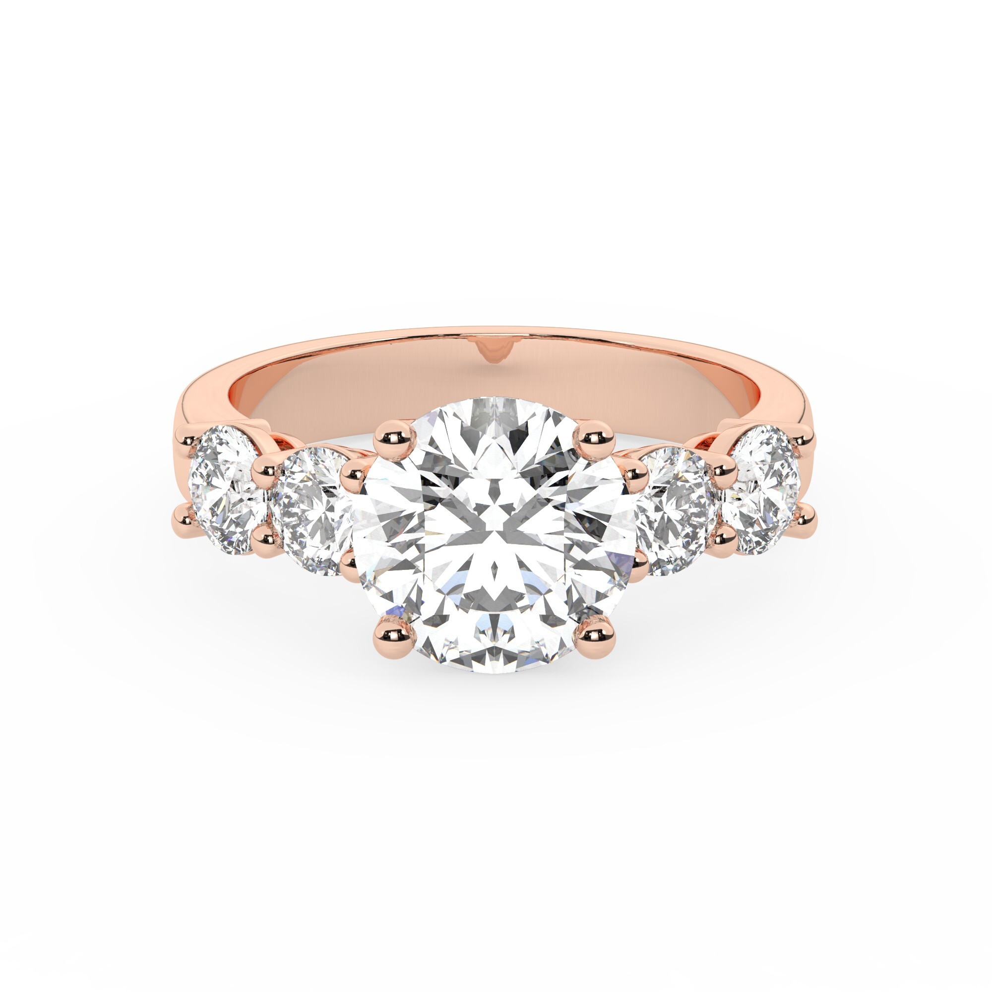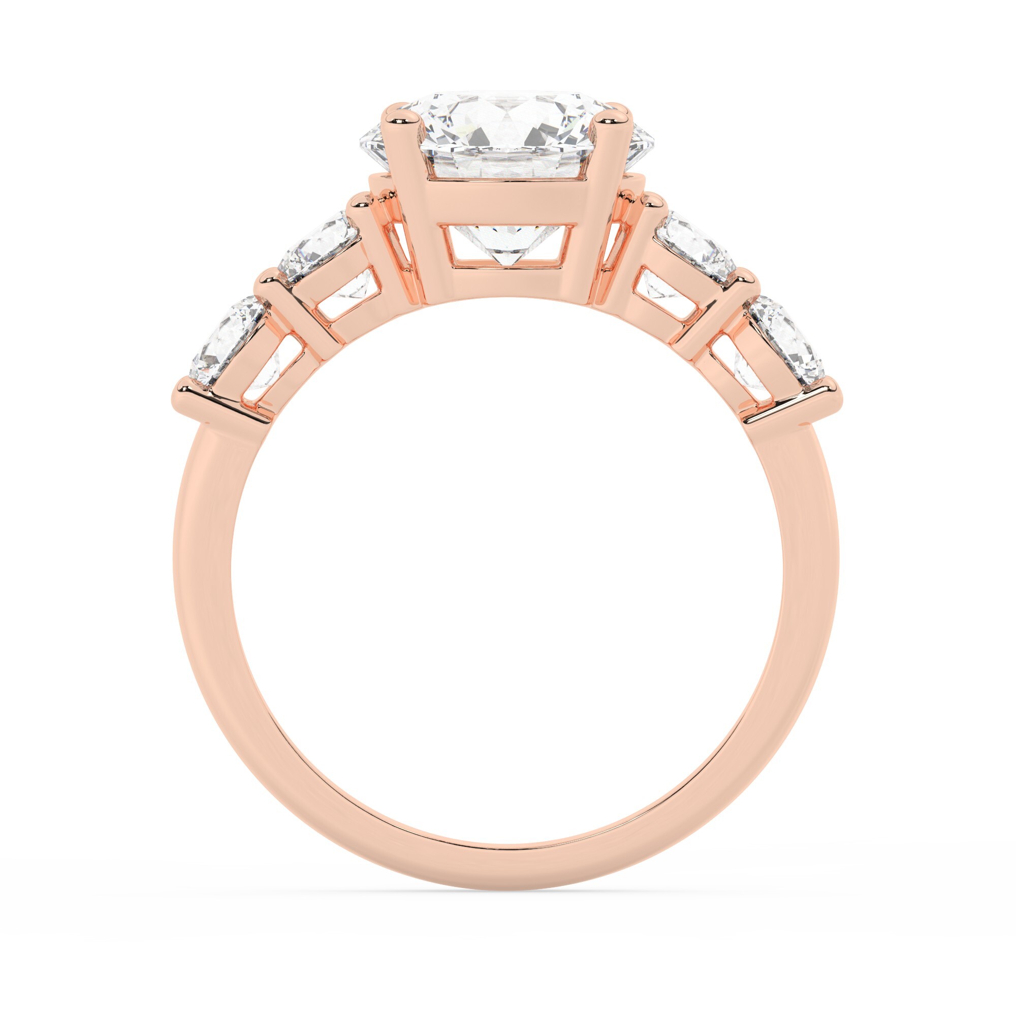טבעת אירוסין סוליטר ומוסונייט בצדדים דגם 50030 כסף מצופה זהב אדום רוזגולד במרכז אבן מעבדה מוסונייט 4 קראט בחיתוך עגול עם תעודה גמולוגית בינלאומית GRA מסביב ובצדדים אבני מעבדה מוסונייט במשקל כולל של 1.08 קראט בחיתוך עגול