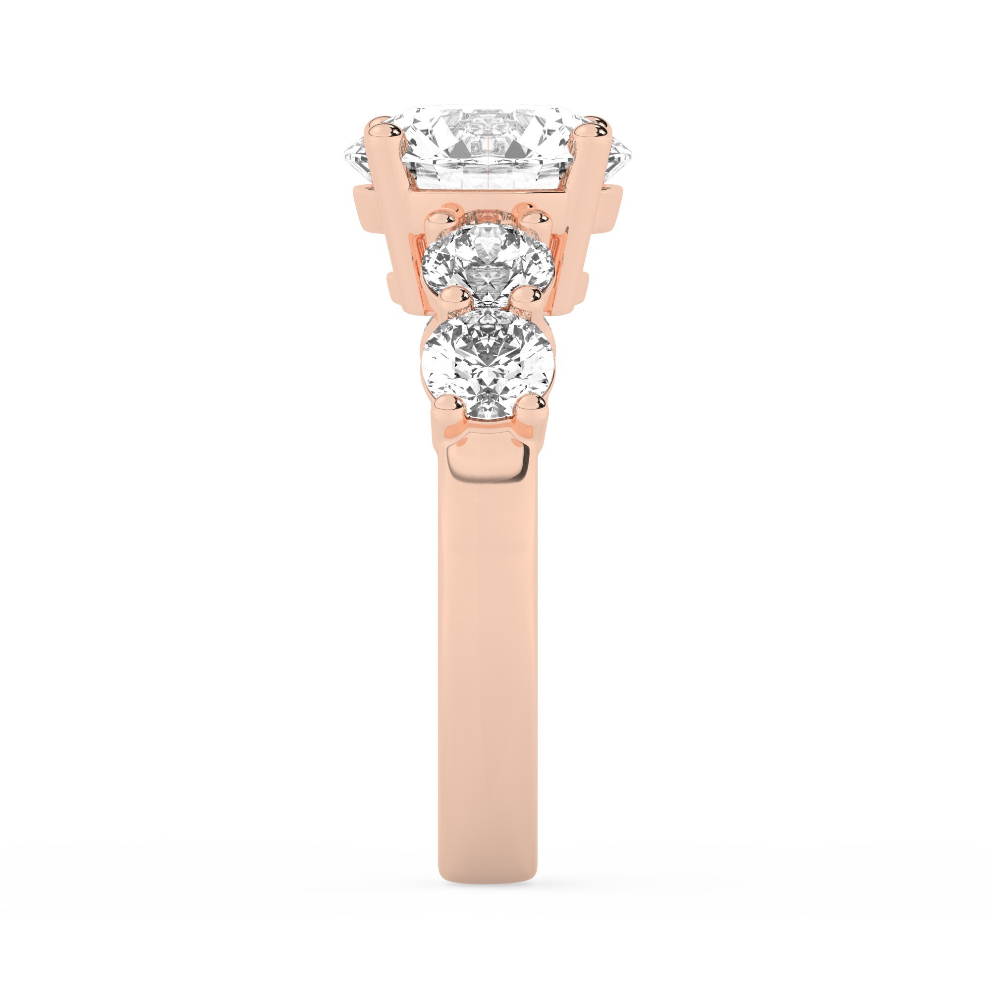סביב האבן המרכזית מצויות ארבע אבני צד מוסונייט נוספות, אשר כולן עגולות ובעלות צבע ובהירות גבוהות כמו האבן המרכזית. יחדיו, הן יוצרות מראה לוהט ונוצץ, מה שגורם לטבעת הזו לבלוט בין שאר הטבעות.