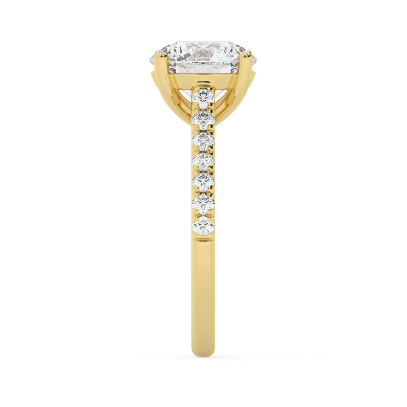 טבעת אירוסין סוליטר ויהלומים בצדדים דגם 50019 כסף מצופה זהב צהוב במרכז אבן מעבדה מוסונייט 4 קראט בחיתוך עגול עם תעודה גמולוגית בינלאומית GRA מסביב ובצדדים אבני מעבדה מוסונייט במשקל כולל של 0.28 קראט בחיתוך עגול