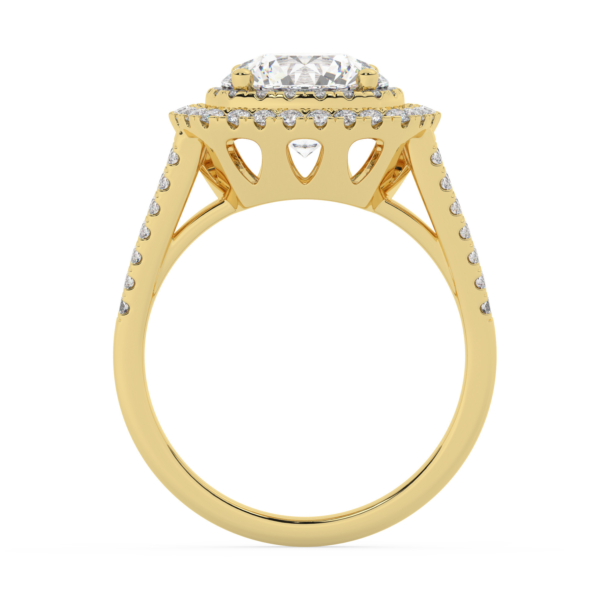 טבעת אירוסין היילו דגם 50025 כסף מצופה זהב צהוב במרכז אבן מעבדה מוסונייט 4 קראט בחיתוך עגול עם תעודה גמולוגית בינלאומית GRA מסביב ובצדדים אבני מעבדה מוסונייט במשקל כולל של 0.62 קראט בחיתוך עגול