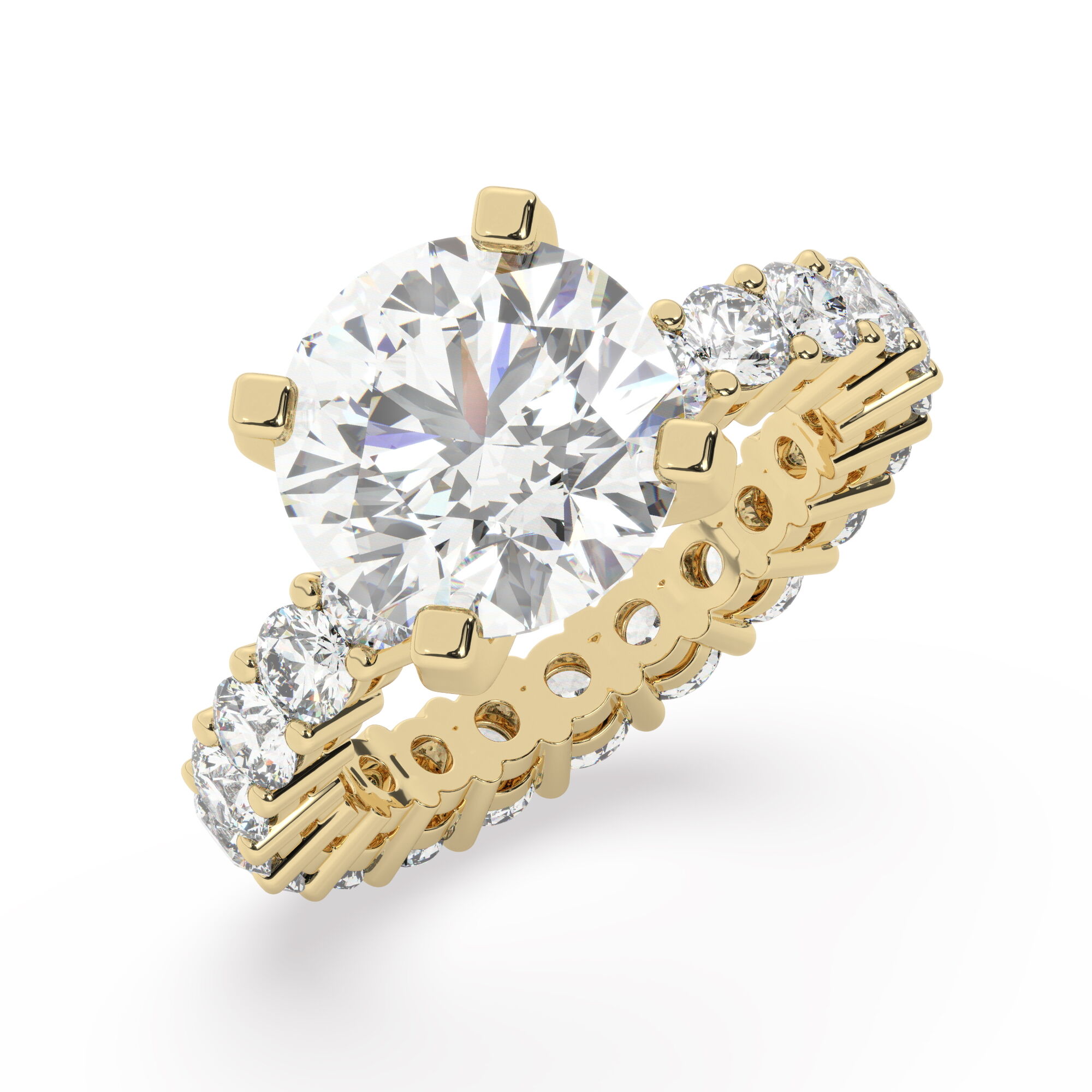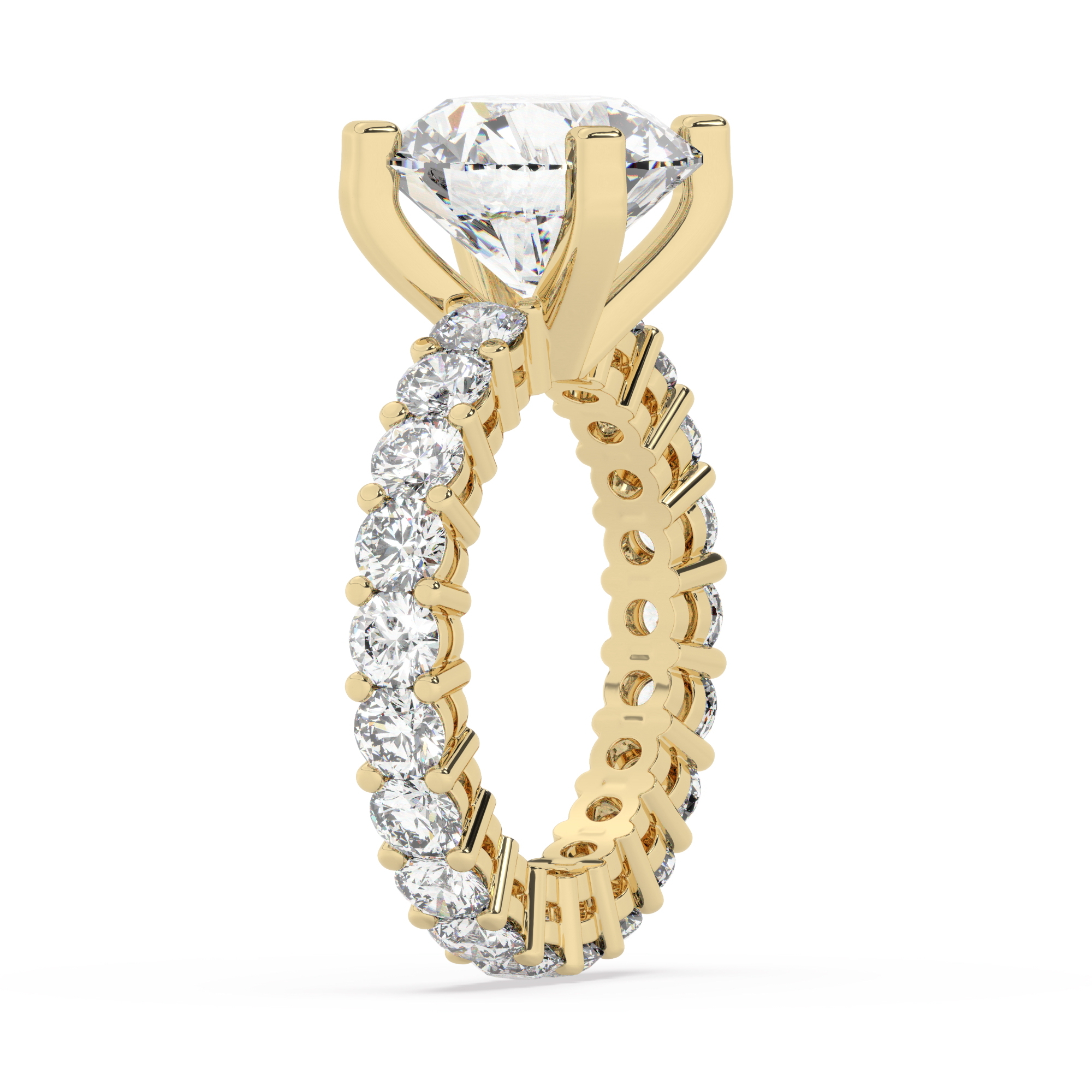 טבעת אירוסין סוליטר ומוסונייט בצדדים איטרנטיני דגם 50044 כסף מצופה זהב צהוב במרכז אבן מעבדה מוסונייט 4 קראט בחיתוך עגול עם תעודה גמולוגית בינלאומית GRA מסביב ובצדדים אבני מעבדה מוסונייט במשקל כולל של 1.80 קראט בחיתוך עגול