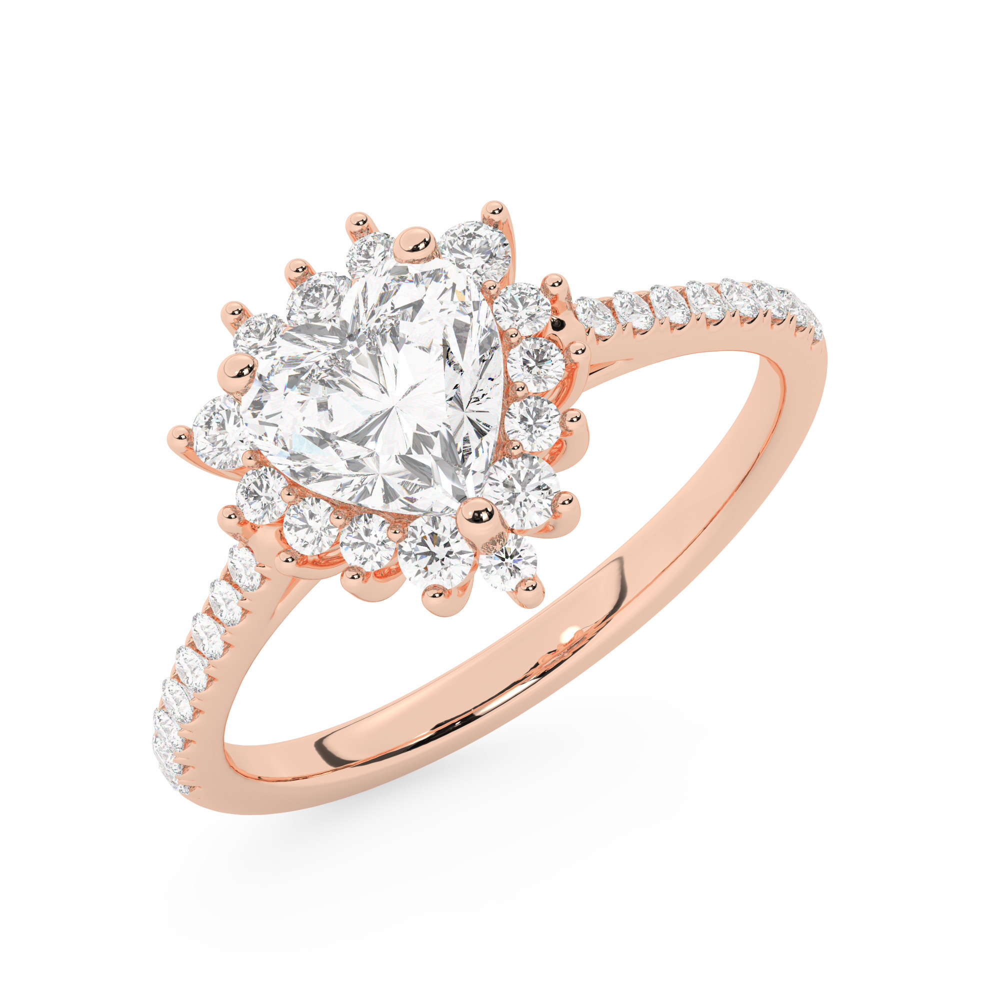 טבעת אירוסין היילו דגם 50024 זהב אדום רוזגולד 14 קראט במרכז יהלום טבעי 1 קראט בחיתוך לב עם תעודה גמולוגית אמריקאית GIA מסביב ובצדדים יהלומים טבעים במשקל כולל של 0.39 קראט בחיתוך עגול