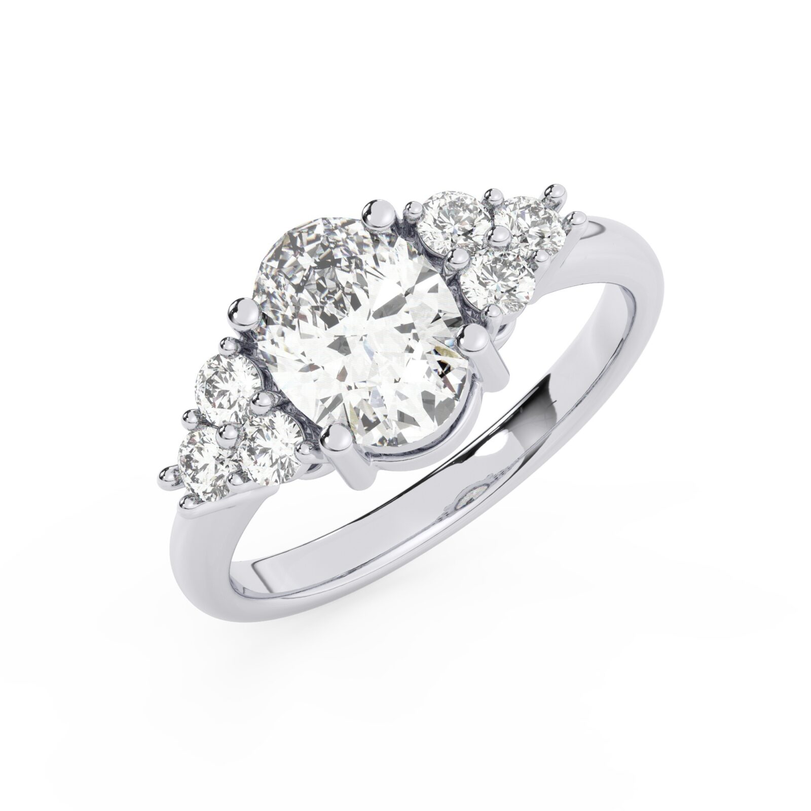 טבעת אירוסין סוליטר ויהלומים בצדדים דגם 50041 זהב לבן 14 קראט במרכז יהלום טבעי 0.75 קראט בחיתוך אובל עם תעודה גמולוגית אמריקאית GIA מסביב ובצדדים יהלומים טבעים במשקל כולל של 0.30 קראט בחיתוך עגול