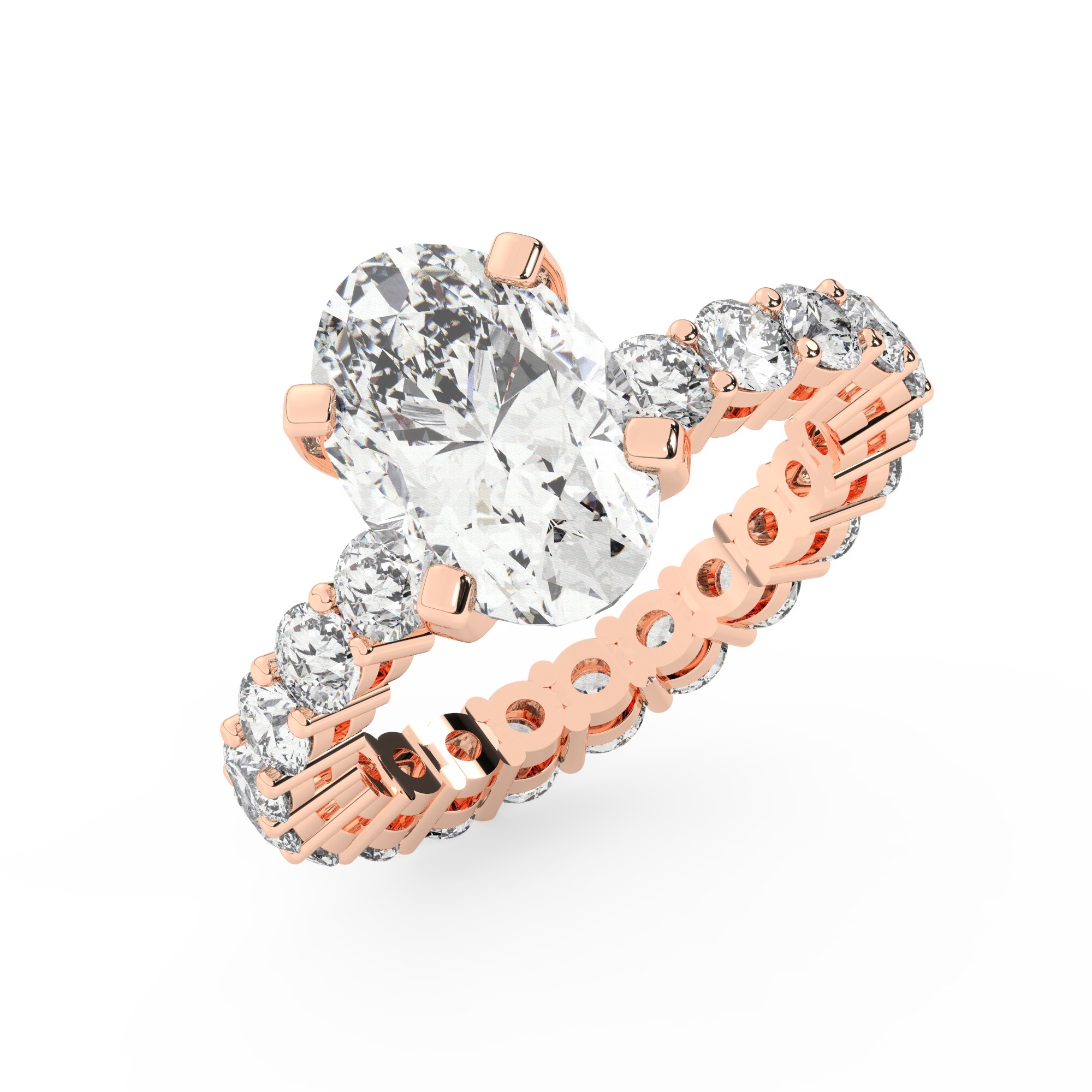 טבעת אירוסין סוליטר ויהלומים בצדדים איטרנטיני דגם 50044 זהב אדום רוזגולד 14 קראט במרכז יהלום טבעי 3 קראט בחיתוך אובל עם תעודה גמולוגית אמריקאית GIA מסביב ובצדדים יהלומים טבעים במשקל כולל של 1.80 קראט בחיתוך עגול