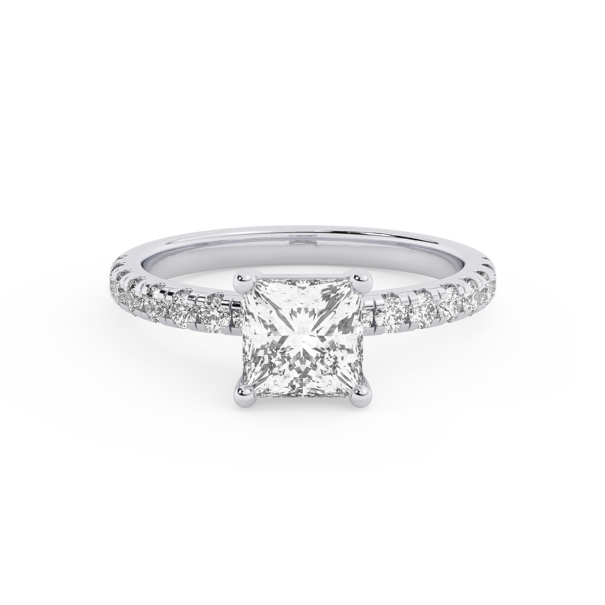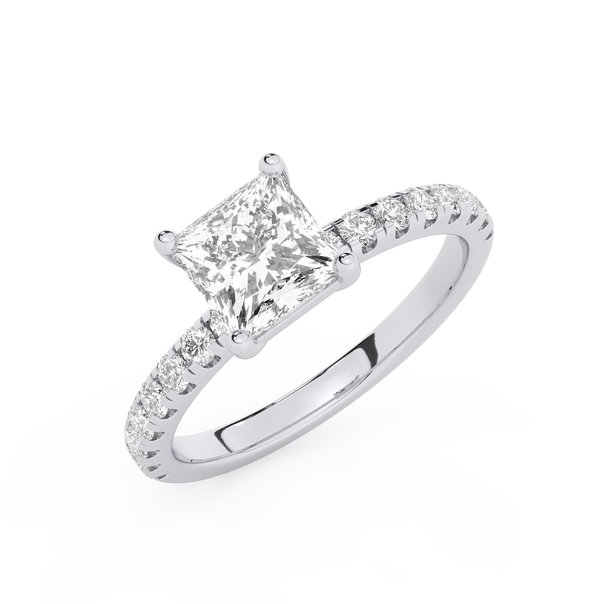 טבעת אירוסין סוליטר ויהלומים בצדדים דגם 50037 זהב לבן 14 קראט במרכז יהלום טבעי 4 קראט בחיתוך פרינסס עם תעודה גמולוגית אמריקאית GIA מסביב ובצדדים יהלומים טבעים במשקל כולל של 0.32 קראט בחיתוך עגול