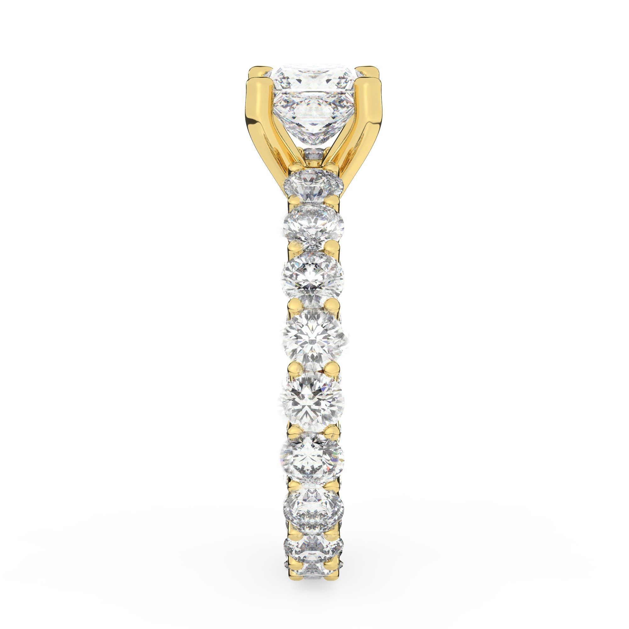טבעת אירוסין סוליטר ויהלומים בצדדים איטרנטיני דגם 50044 זהב צהוב 14 קראט במרכז יהלום טבעי 4 קראט בחיתוך פרינסס עם תעודה גמולוגית אמריקאית GIA מסביב ובצדדים יהלומים טבעים במשקל כולל של 1.80 קראט בחיתוך עגול