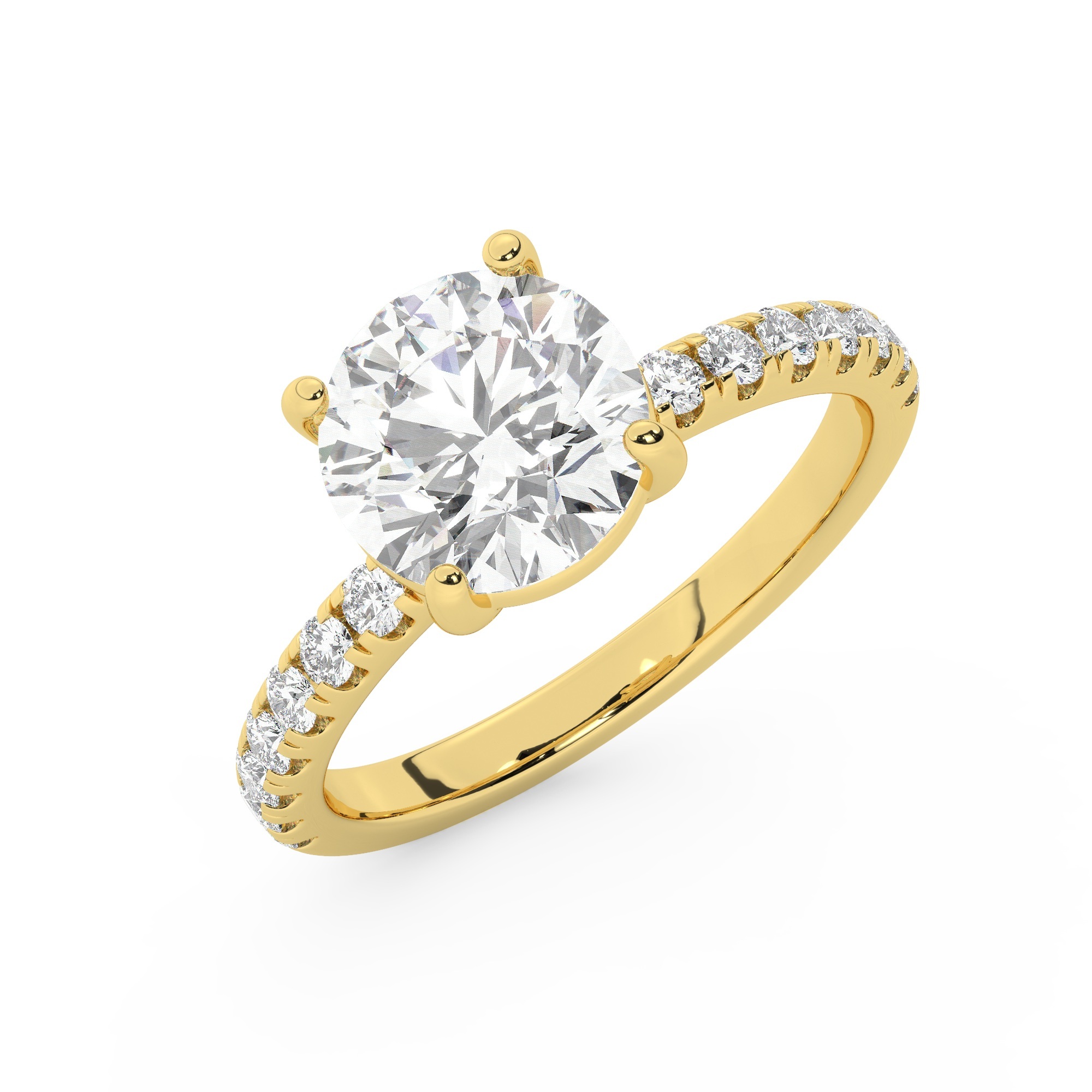טבעת אירוסין סוליטר ויהלומים בצדדים דגם 50037 זהב צהוב 14 קראט במרכז יהלום טבעי 2.50 קראט בחיתוך עגול עם תעודה גמולוגית אמריקאית GIA מסביב ובצדדים יהלומים טבעים במשקל כולל של 0.32 קראט בחיתוך עגול