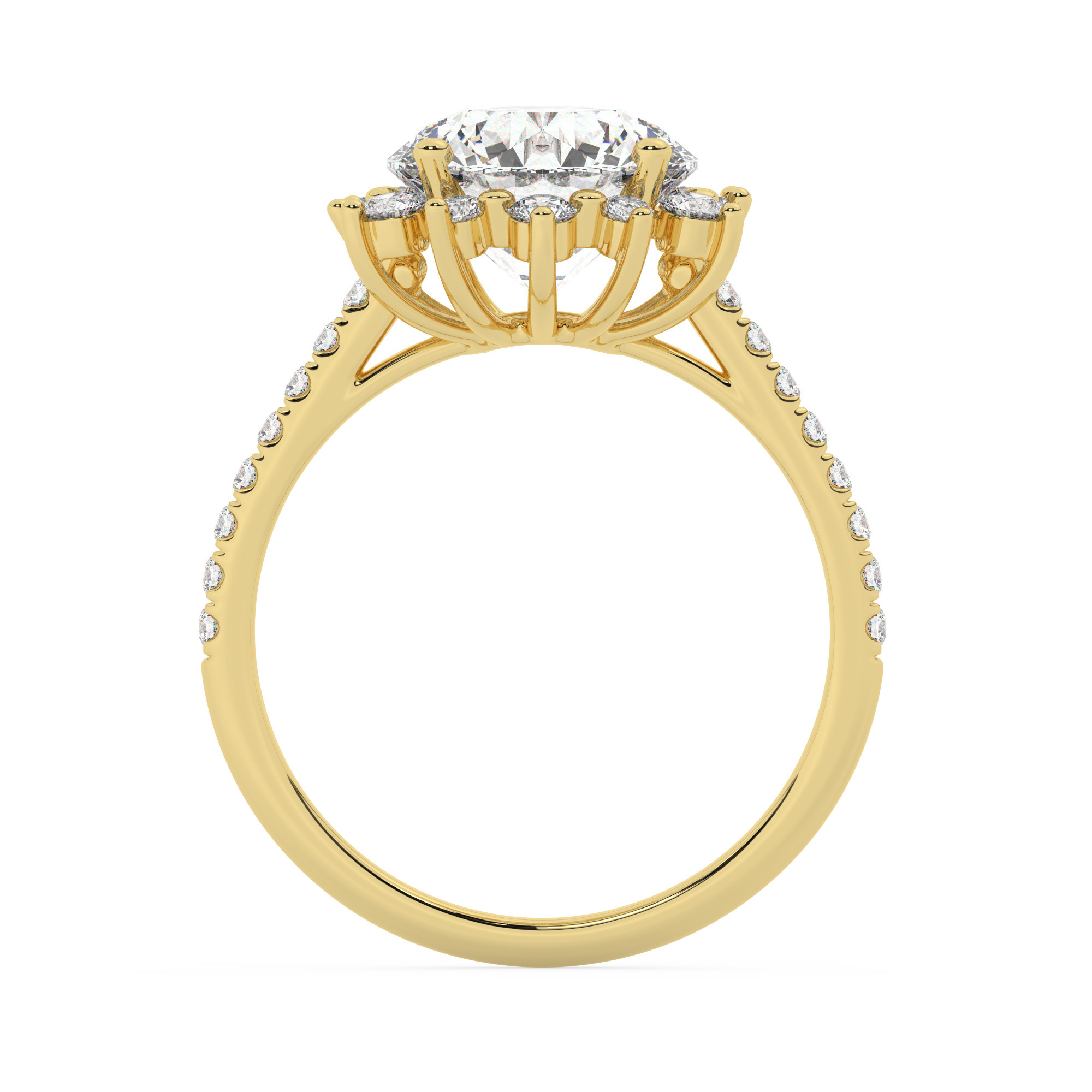 טבעת אירוסין היילו דגם 50024 זהב צהוב 14 קראט במרכז יהלום טבעי 3 קראט בחיתוך עגול עם תעודה גמולוגית אמריקאית GIA מסביב ובצדדים יהלומים טבעים במשקל כולל של 0.39 קראט בחיתוך עגול