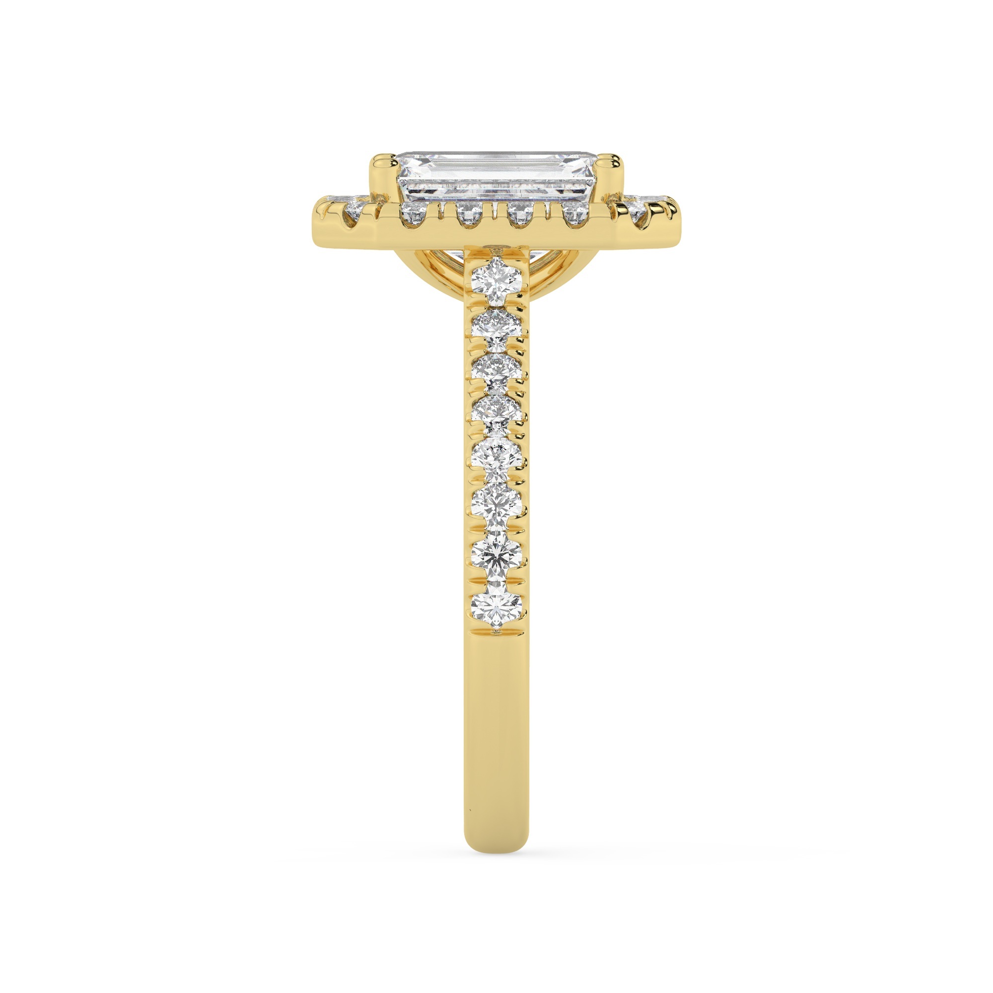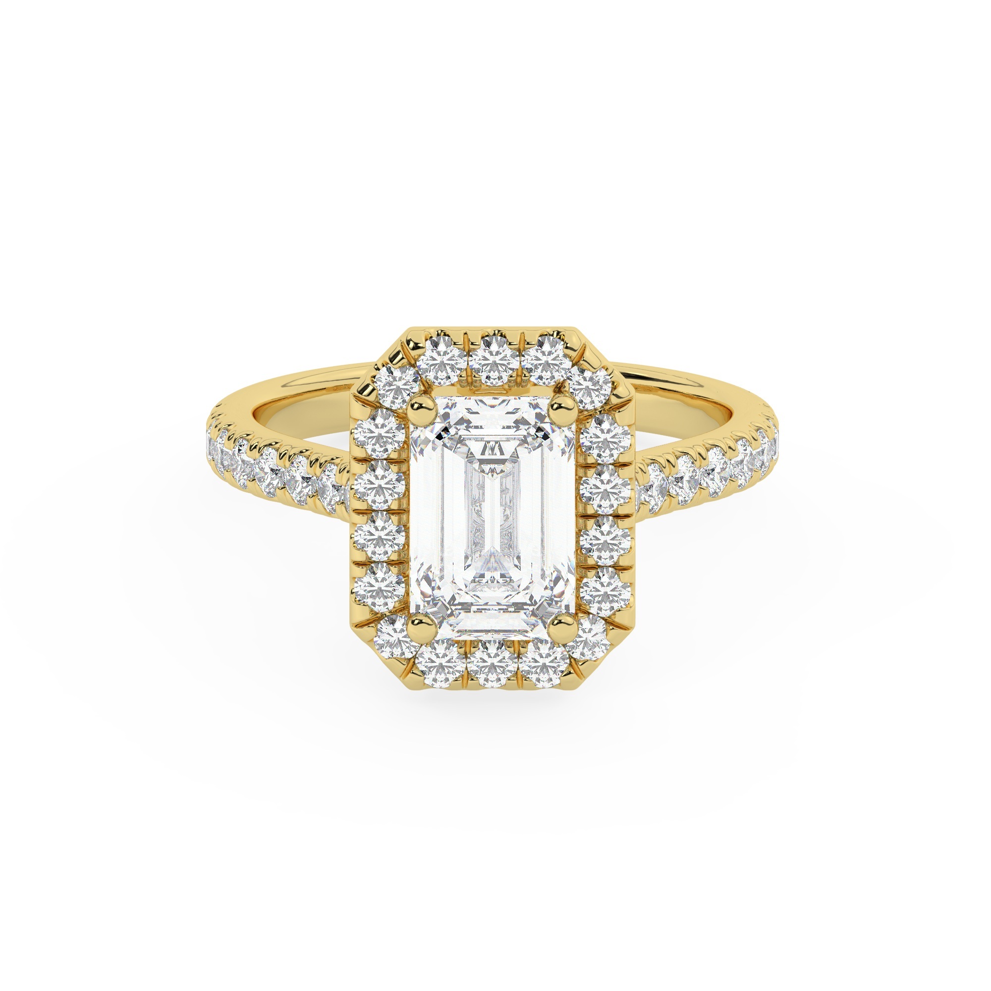 טבעת אירוסין היילו דגם 50026 זהב צהוב 14 קראט במרכז זירקוניה 1 קראט בחיתוך אמרלד מסביב ובצדדים זירקונים בחיתוך עגול
