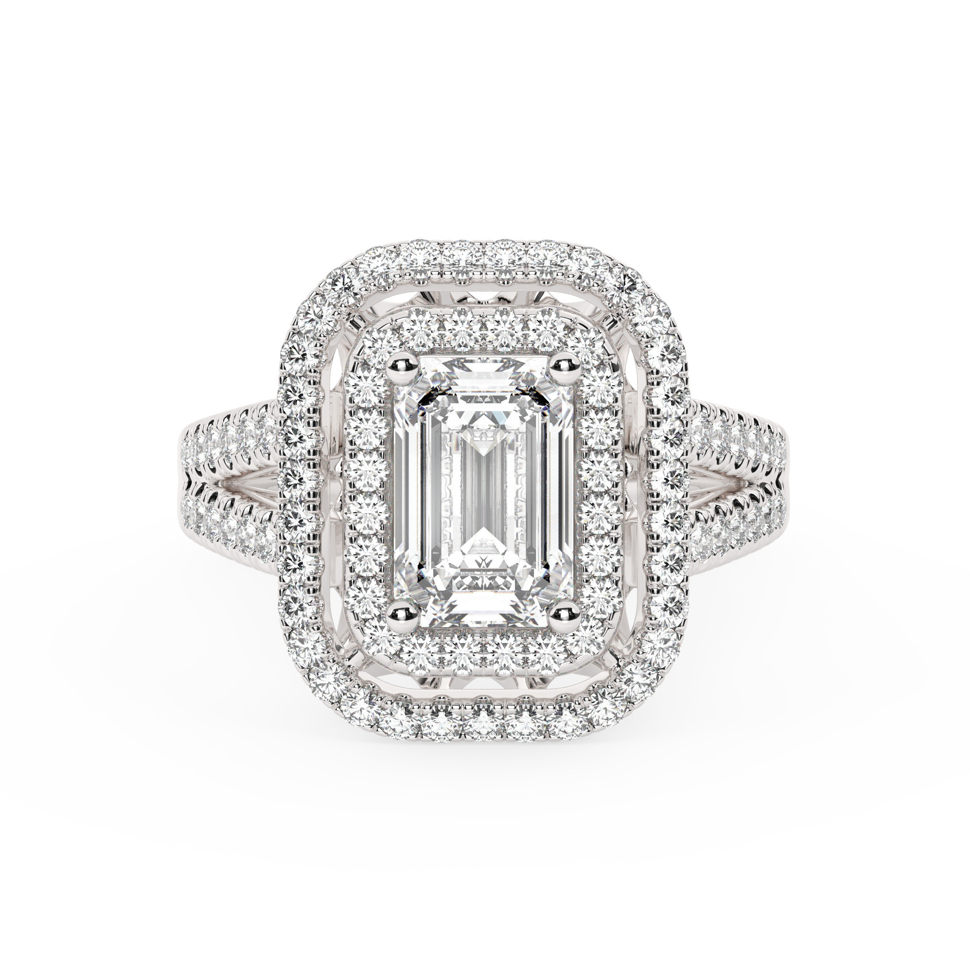טבעת אירוסין היילו דגם 50025 כסף מצופה זהב לבן במרכז זירקוניה 1 קראט בחיתוך אמרלד מסביב ובצדדים זירקונים בחיתוך עגול