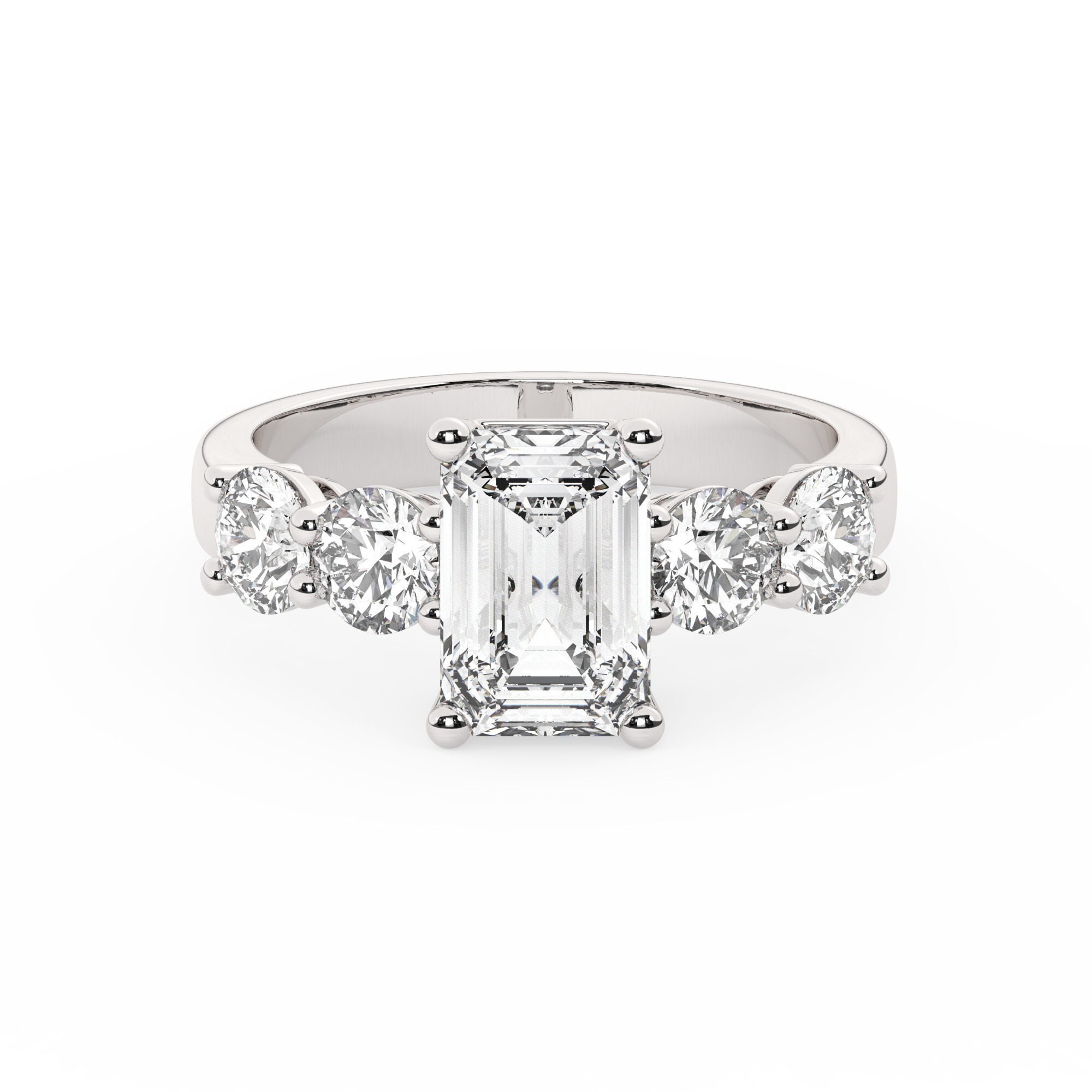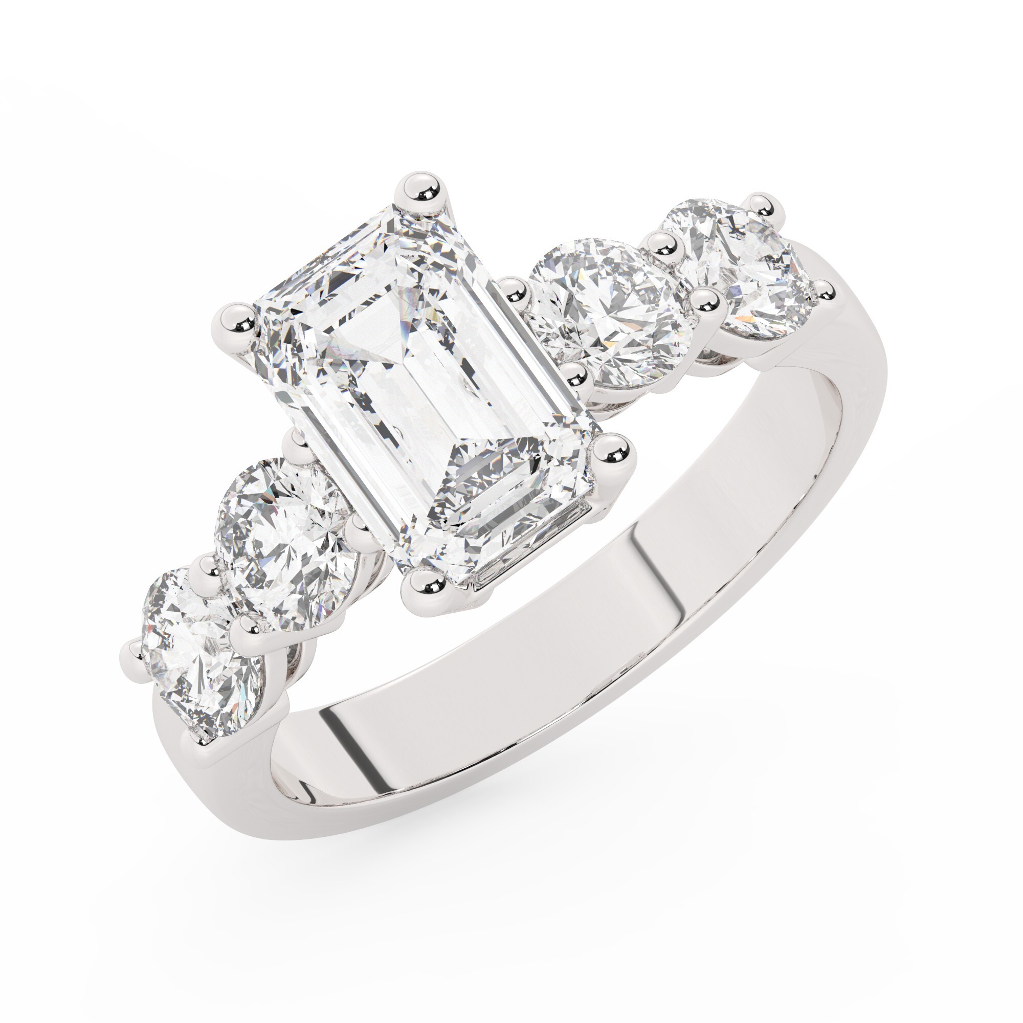 טבעת אירוסין סוליטר וזירקונים בצדדים דגם 50030 זהב לבן 14 קראט במרכז זירקוניה 2 קראט בחיתוך אמרלד מסביב ובצדדים זירקונים בחיתוך עגול