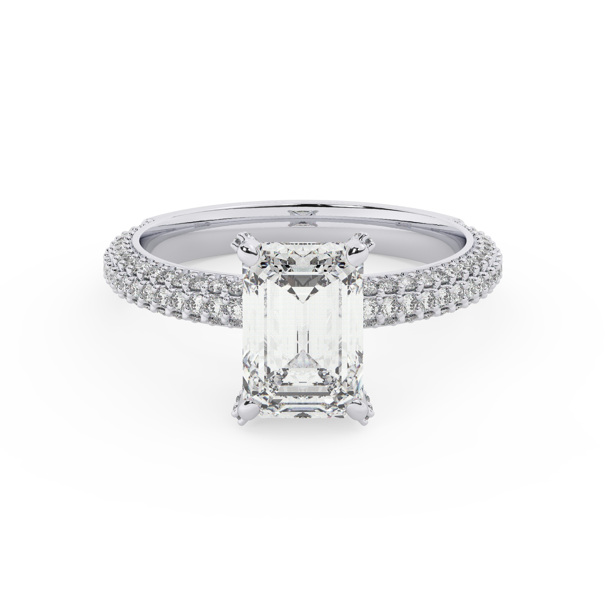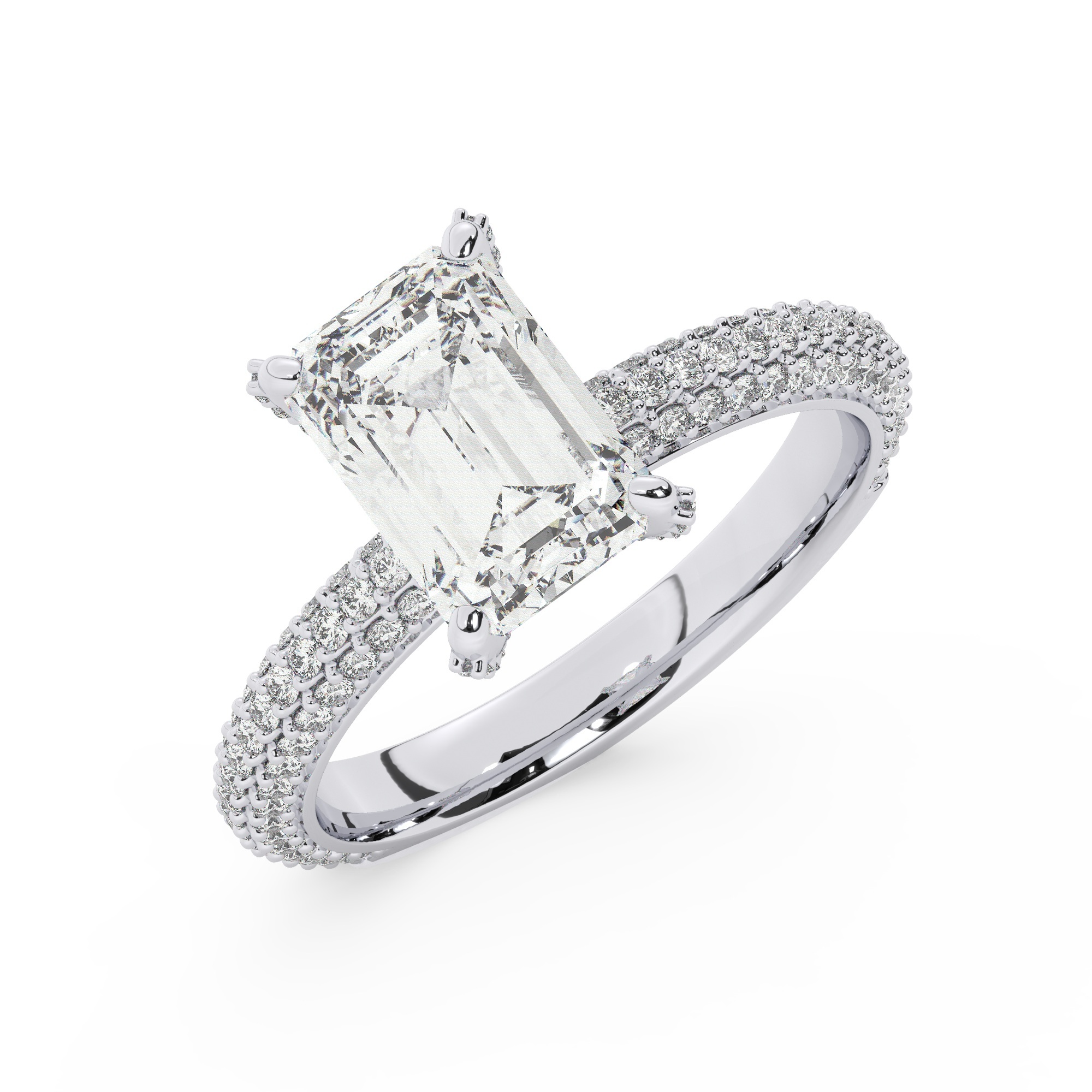טבעת אירוסין סוליטר ויהלומים בצדדים דגם 50012 זהב לבן 14 קראט במרכז זירקוניה 2.50 קראט בחיתוך אמרלד מסביב ובצדדים זירקונים בחיתוך עגול