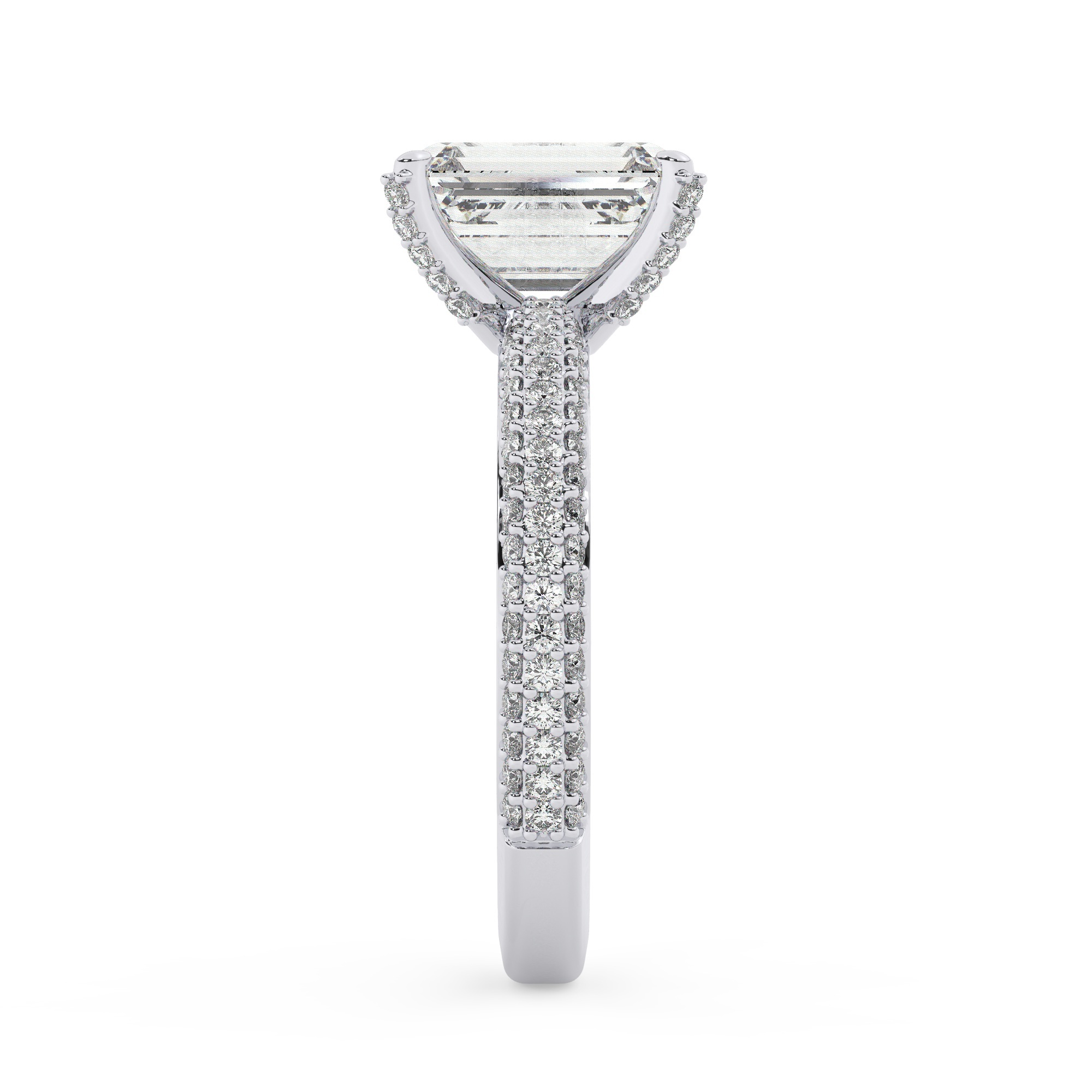 טבעת אירוסין יוקרתית בעיצוב סוליטר קלאסי עם יהלומים בצדדים, עשויה זהב לבן 14 קראט ומשובצת בזירקוניה איכותית בליטוש אמרלד. מרכז תשומת הלב – אבן מרכזית במשקל 2.50 קראט וניקיון מרשים VVS1.