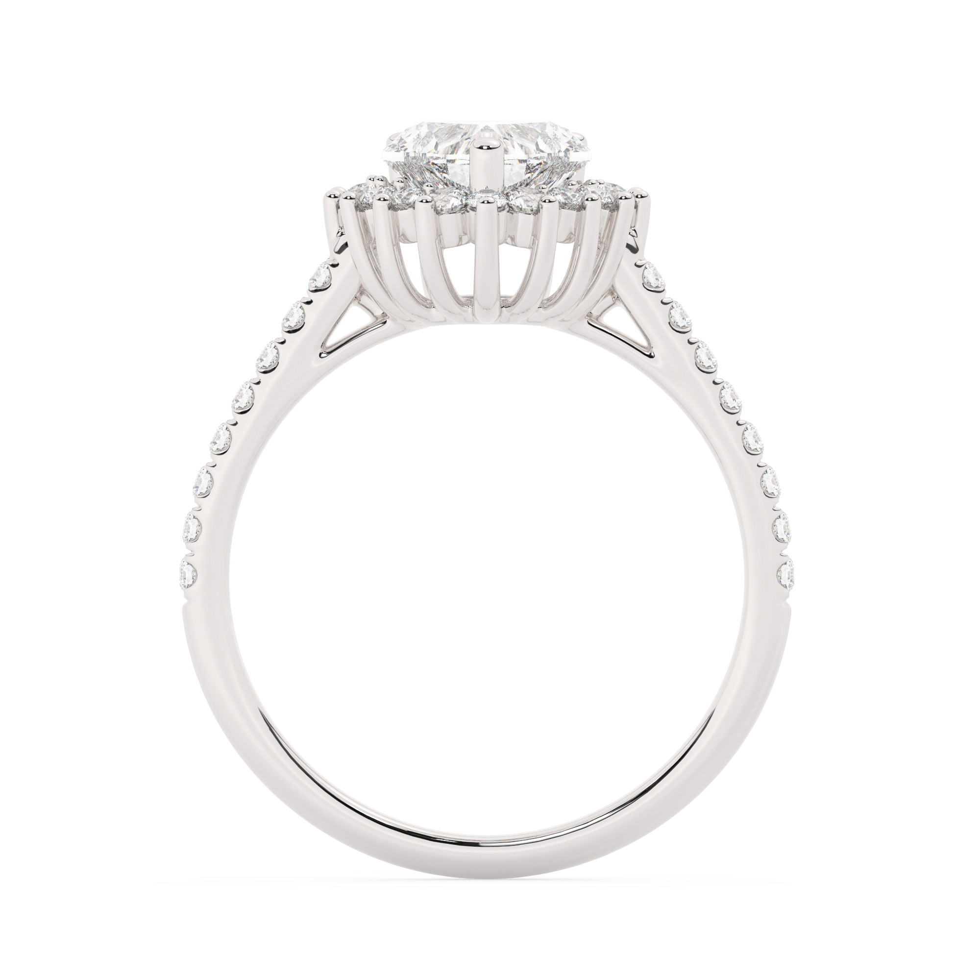טבעת אירוסין היילו דגם 50024 זהב לבן 14 קראט במרכז זירקוניה 0.50 קראט בחיתוך לב מסביב ובצדדים זירקונים בחיתוך עגול